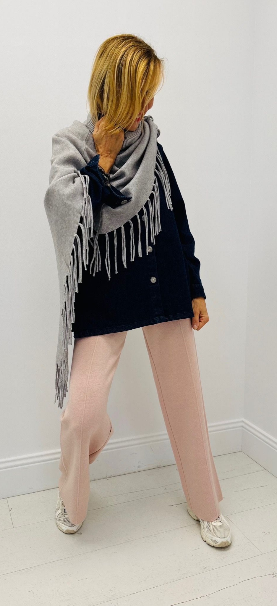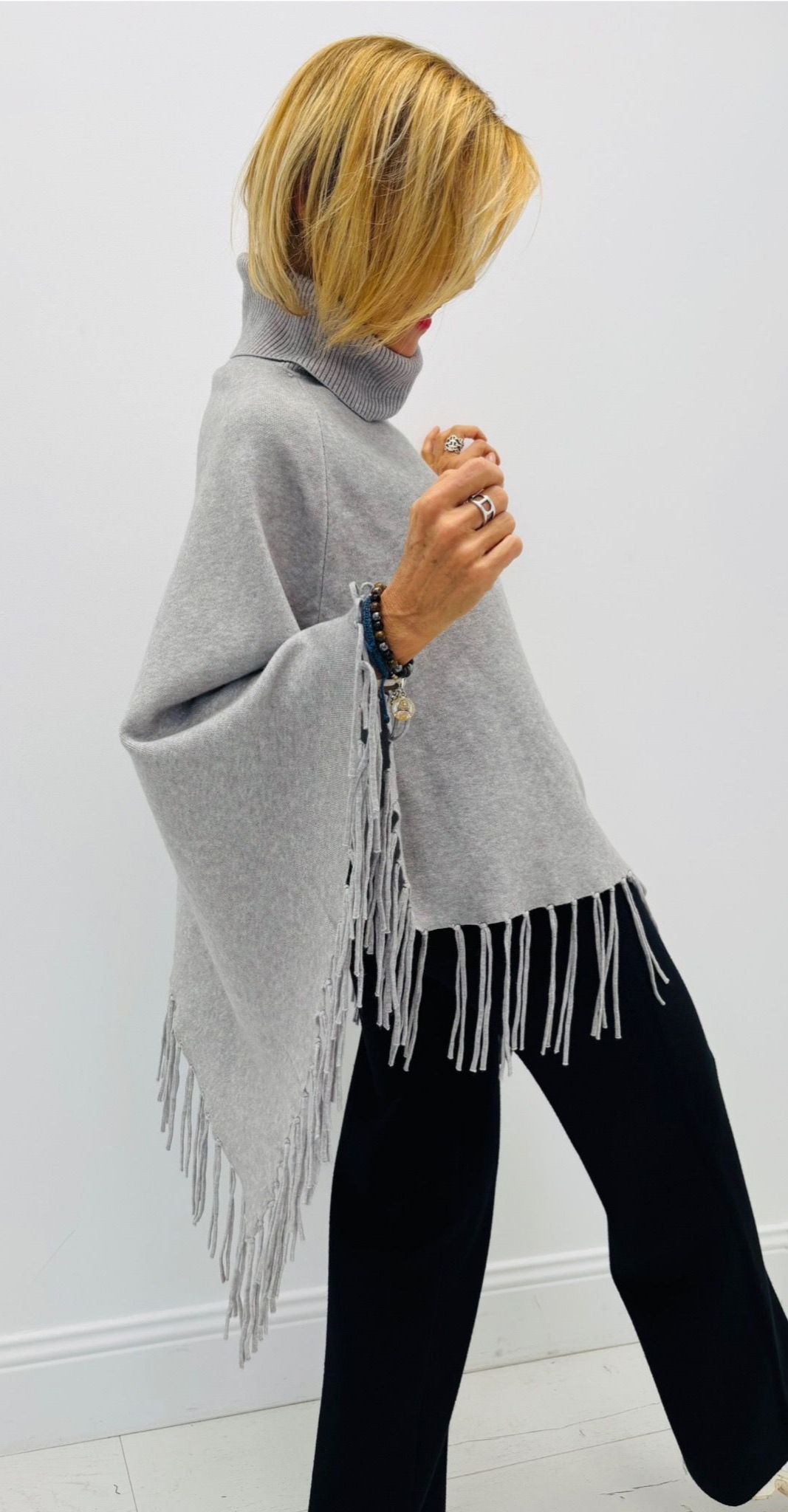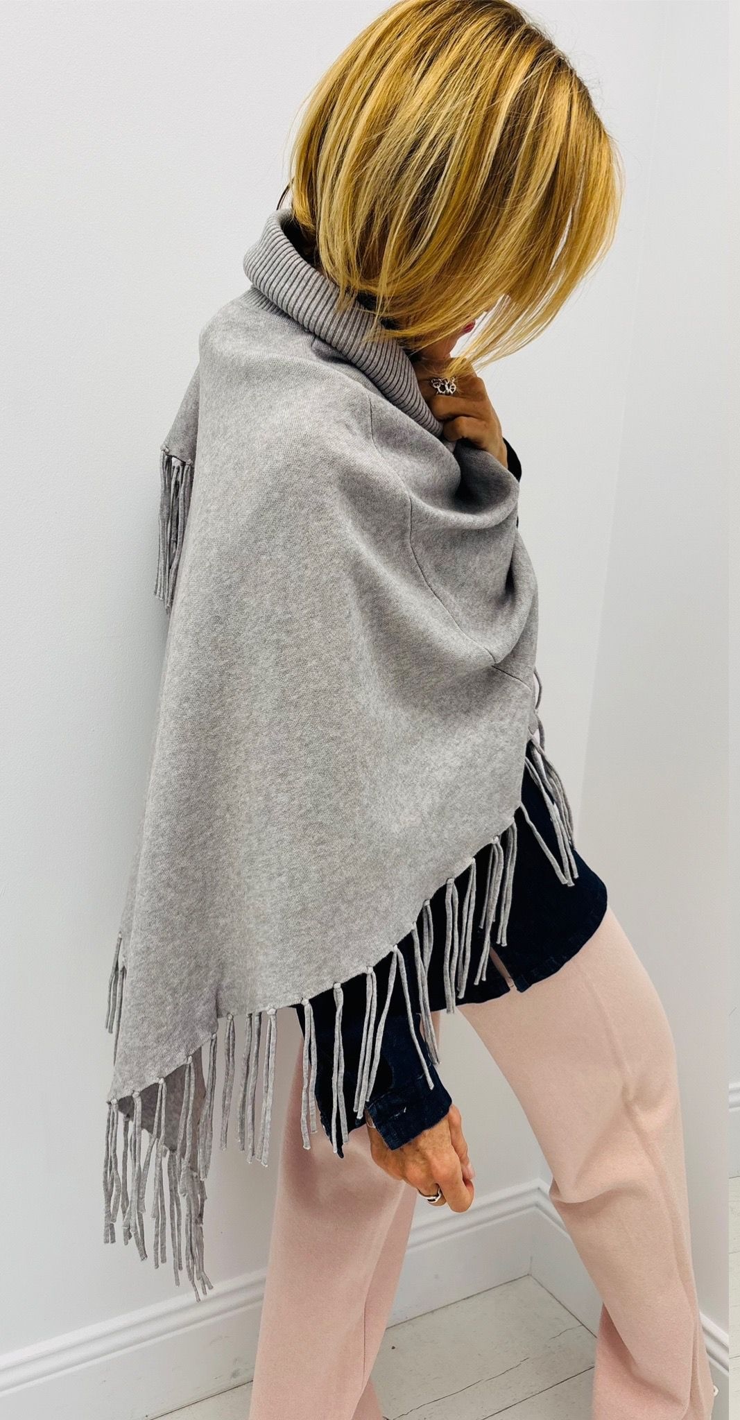 Poncho à franges, col roulé, en pointe