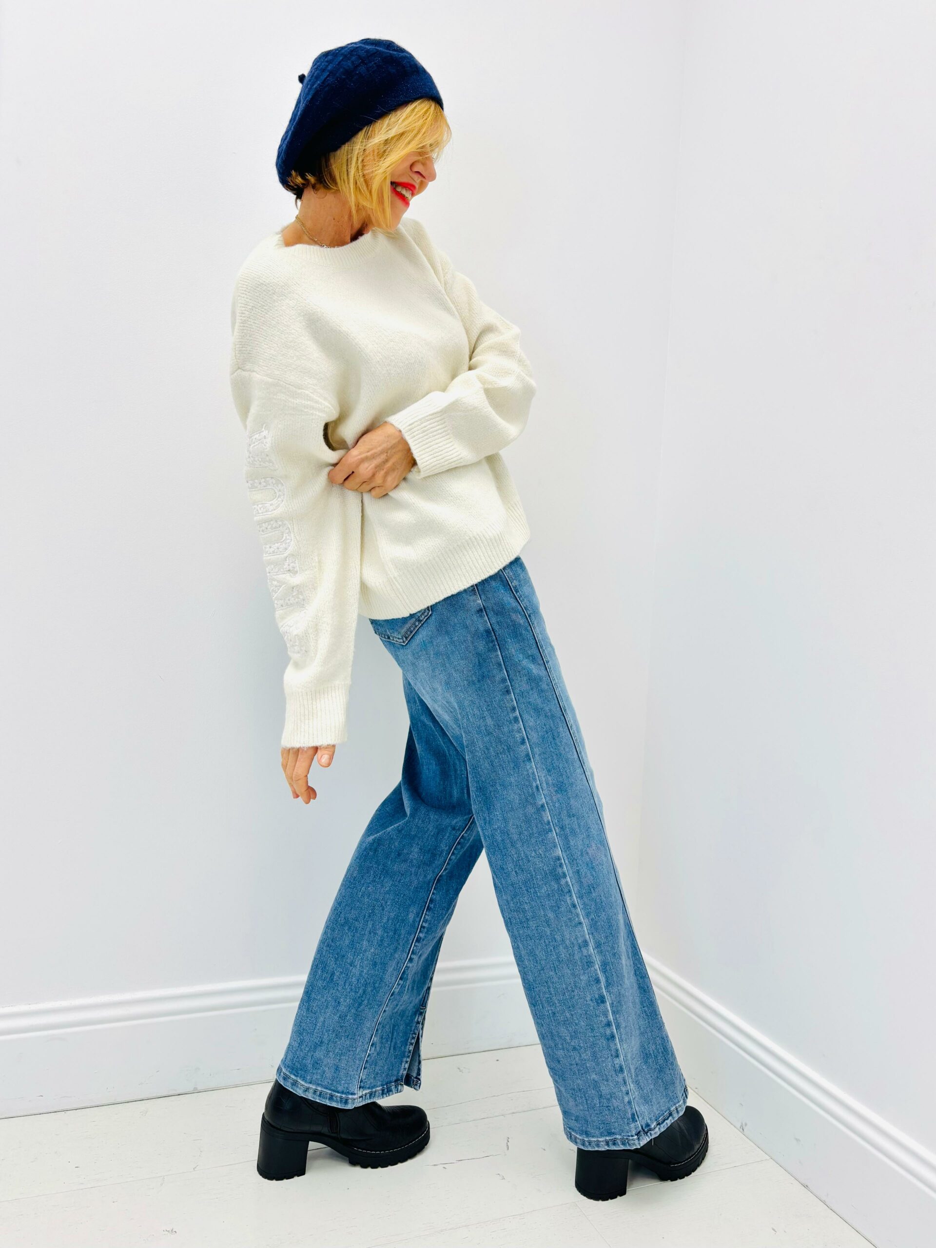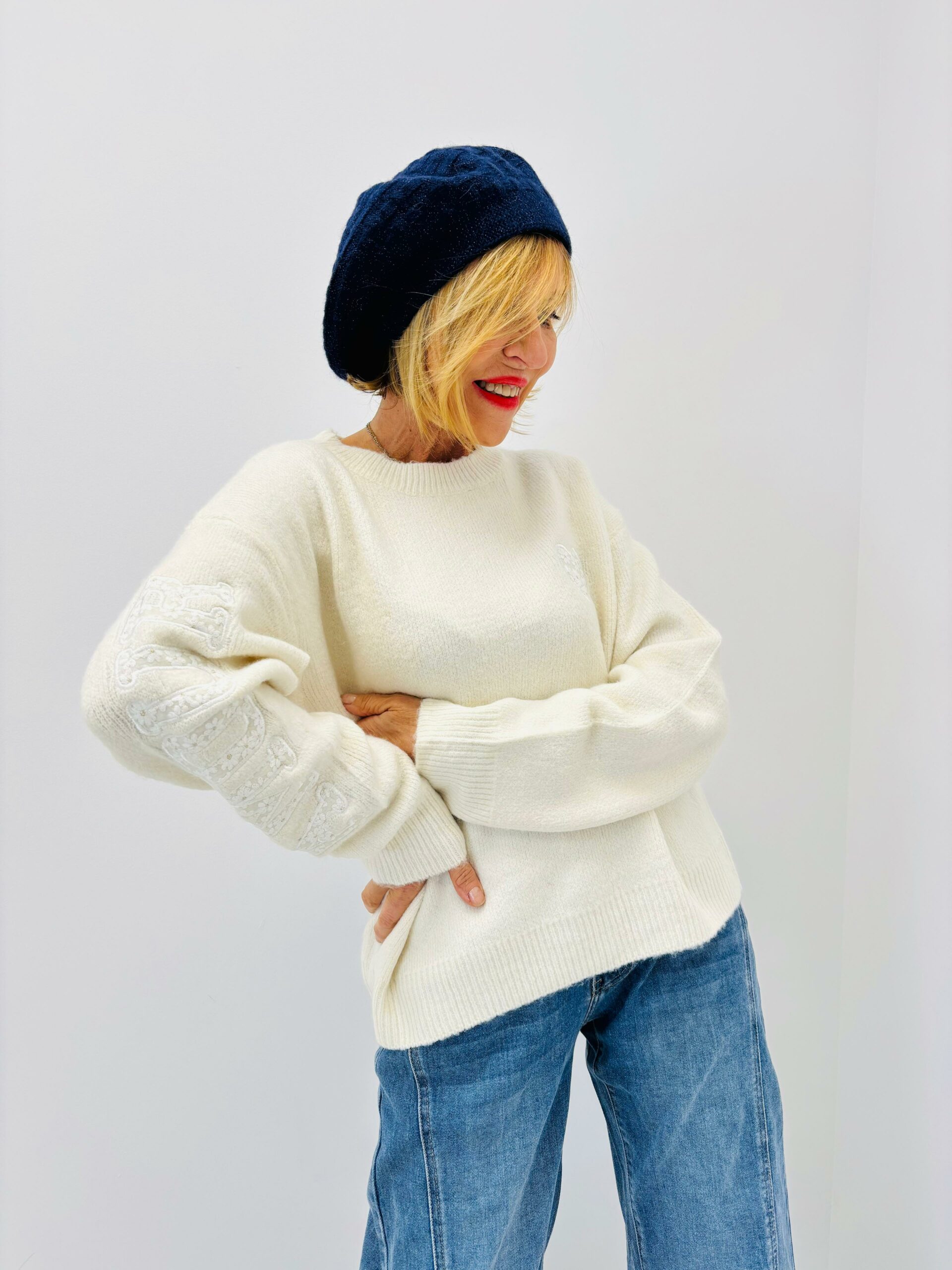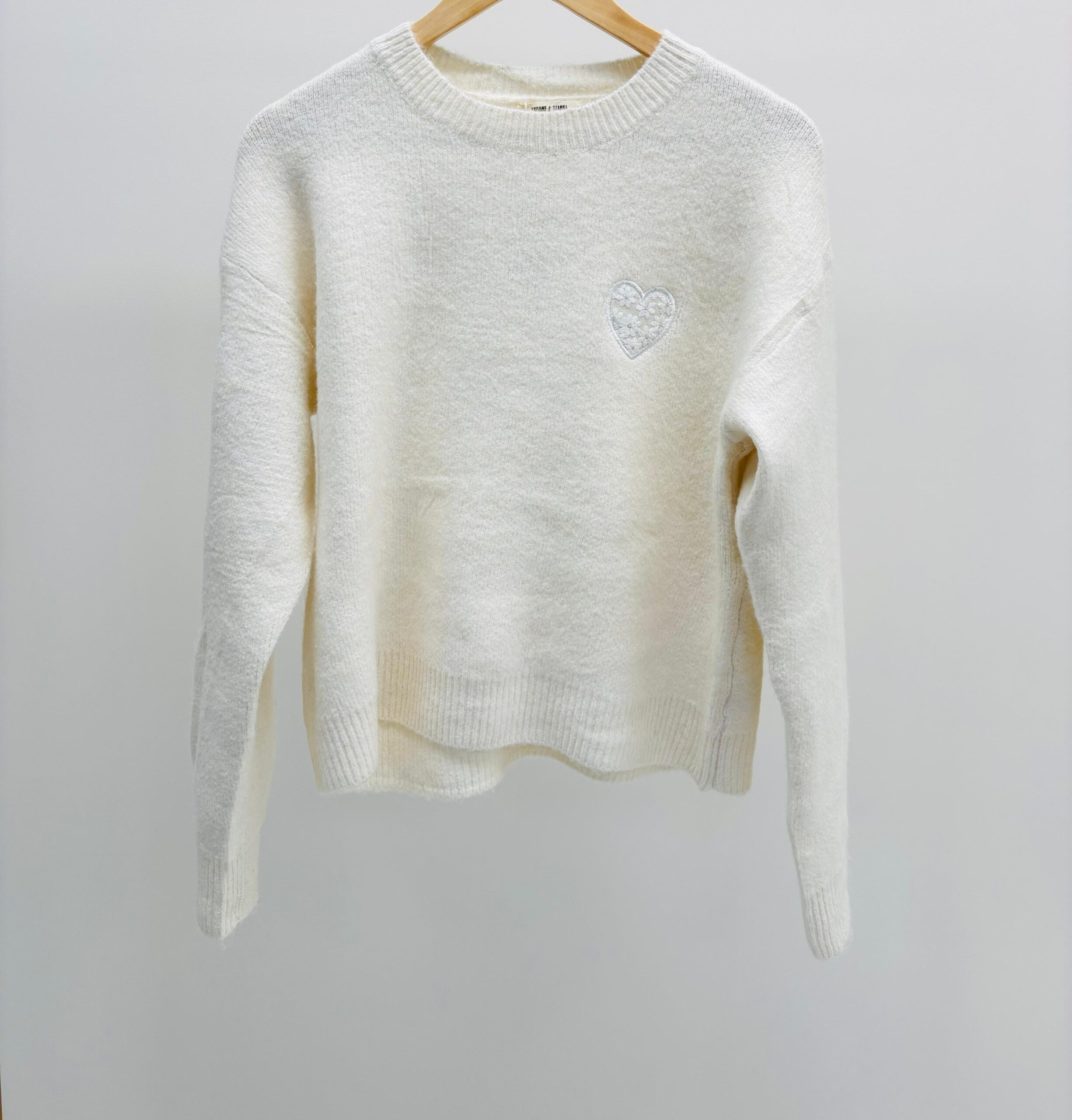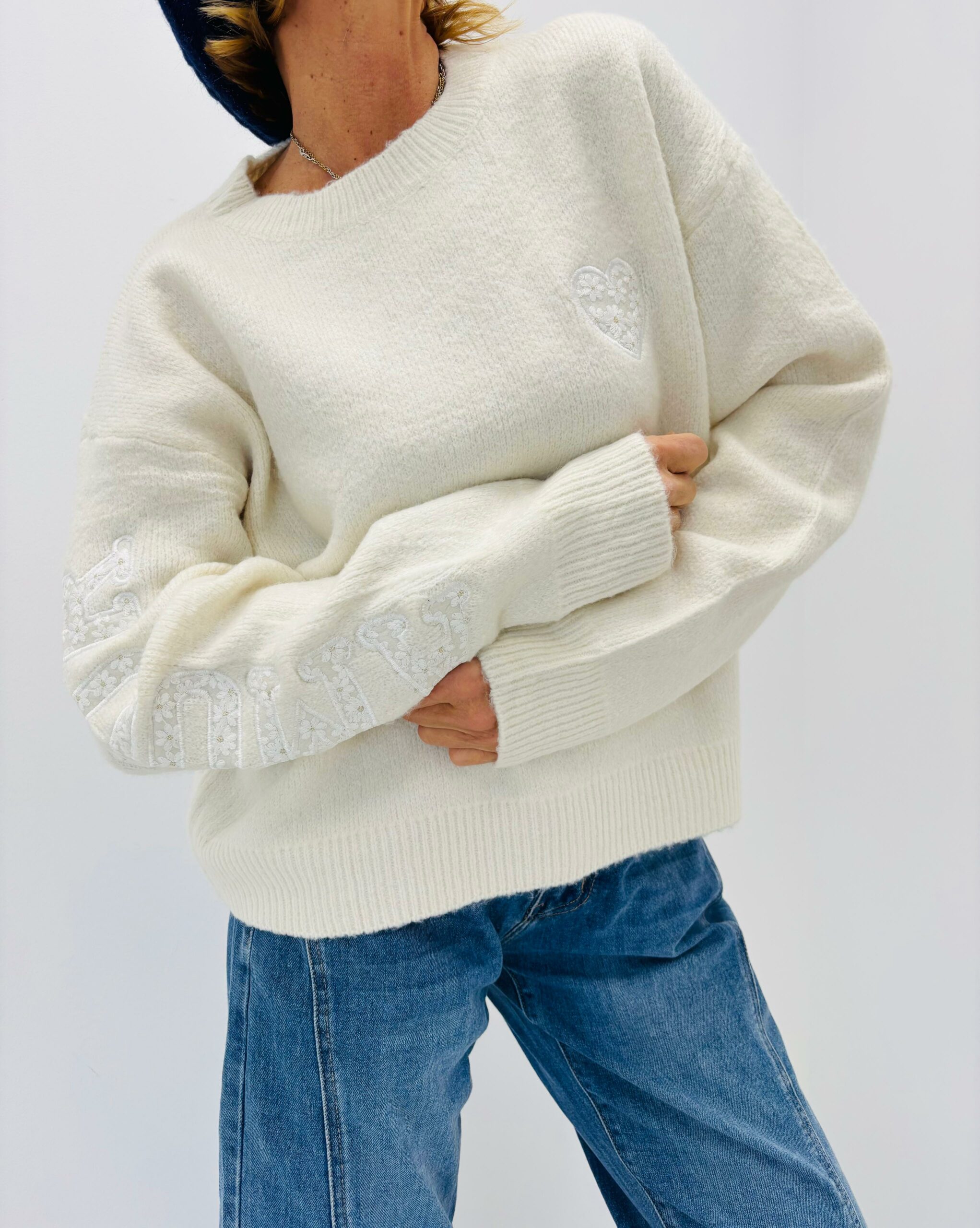 Pull blanc, encolure ronde, cœur brodé, écriture « amour » sur une manche