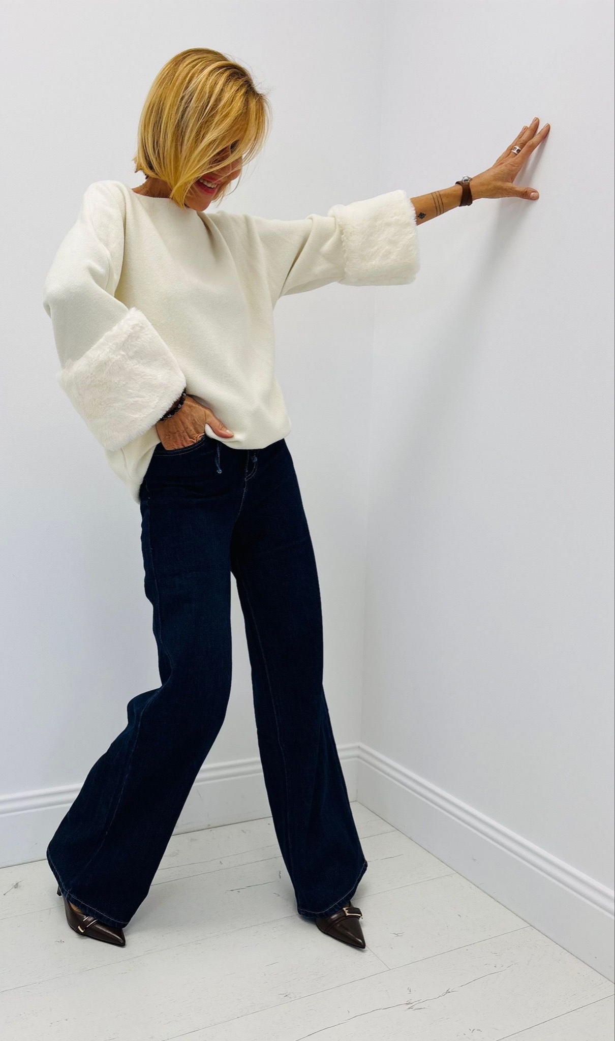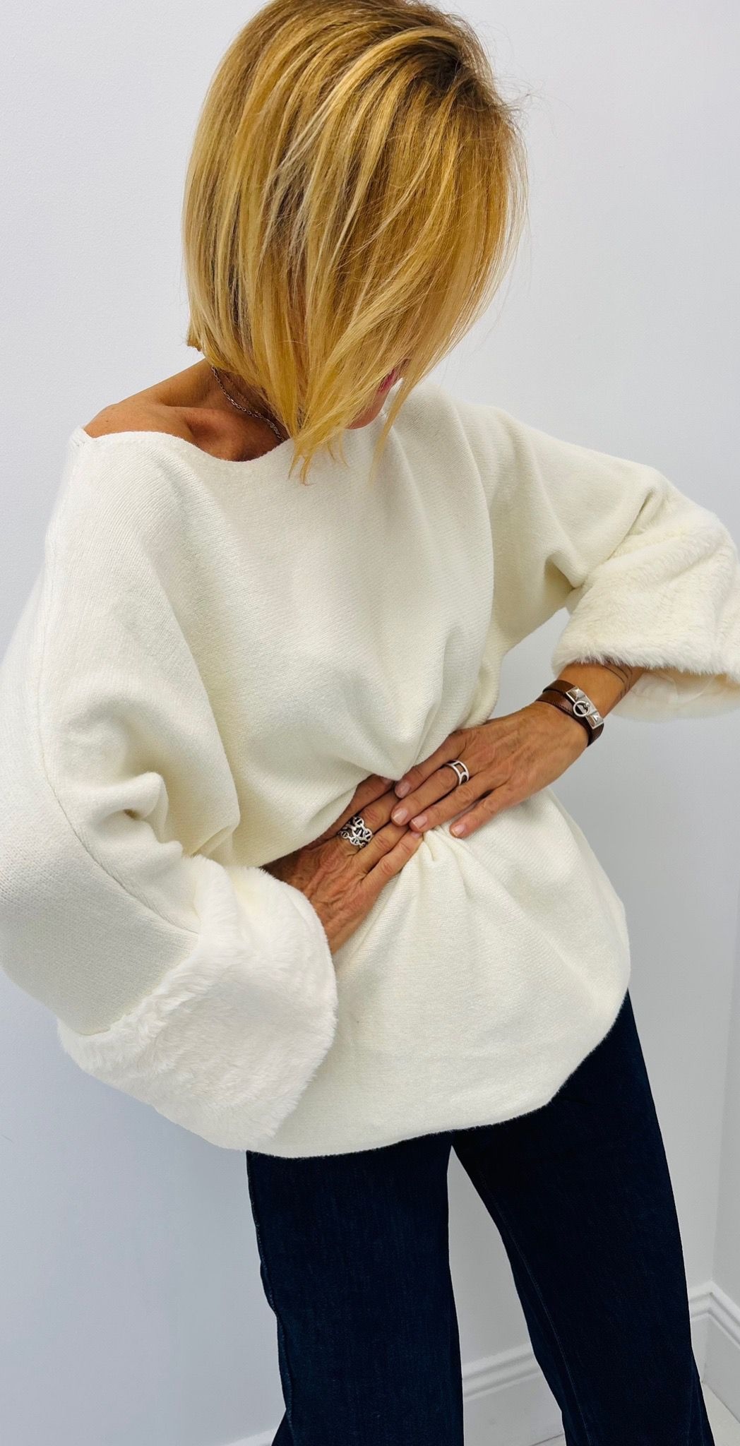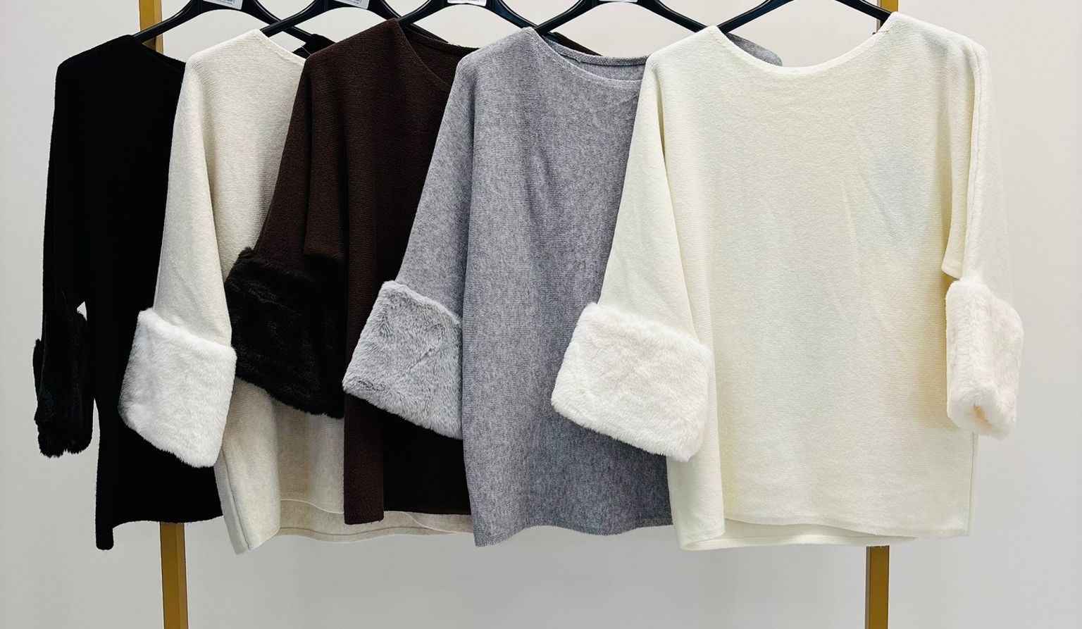 Pull uni, encolure ronde, l’originalité se porte sur le bas des manches en fausses fourrure, ne pique pas