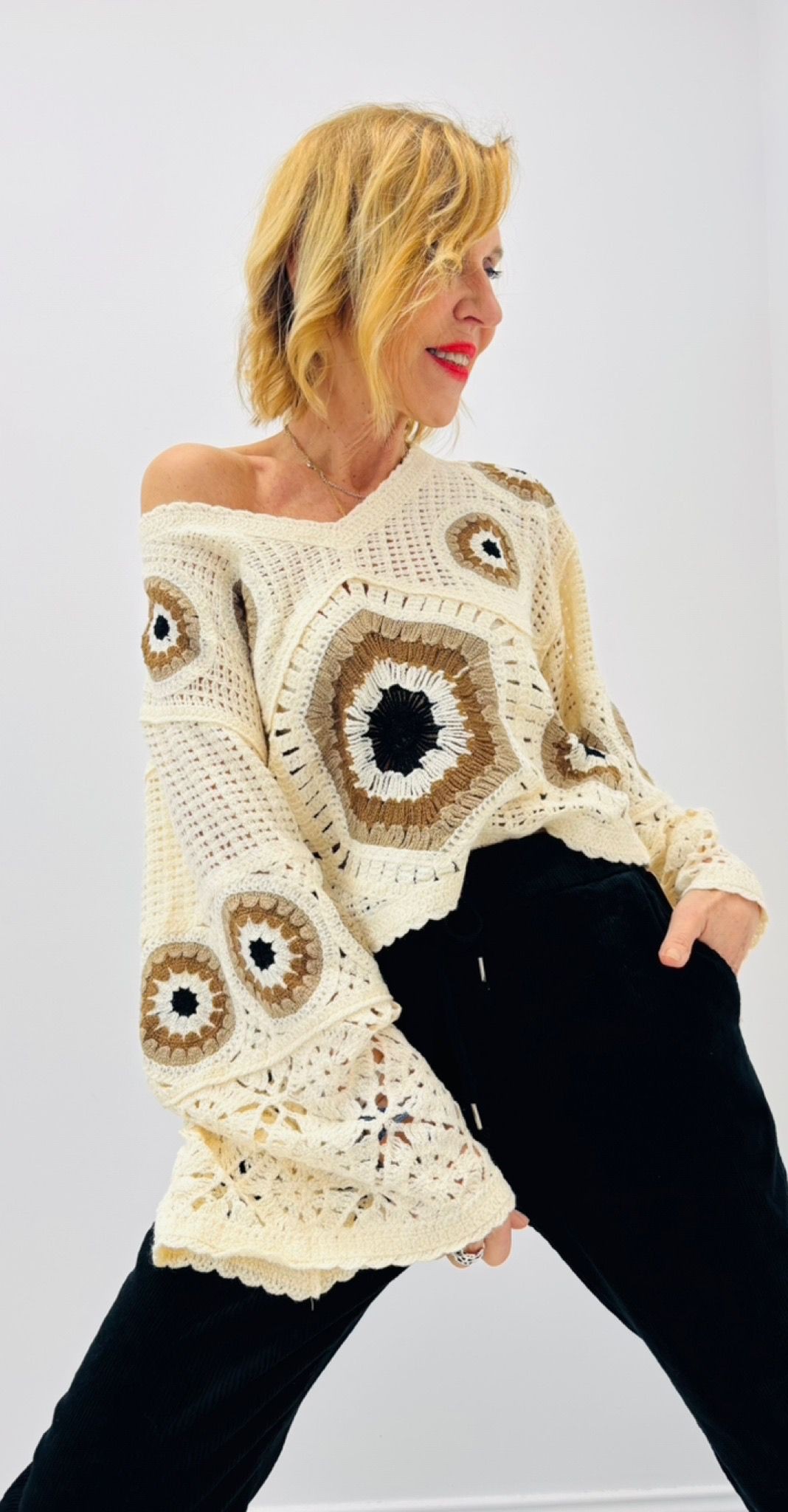 Pull en crochet dans les tons de chocolat, noir, beige, manches longues, larges, encolure en V