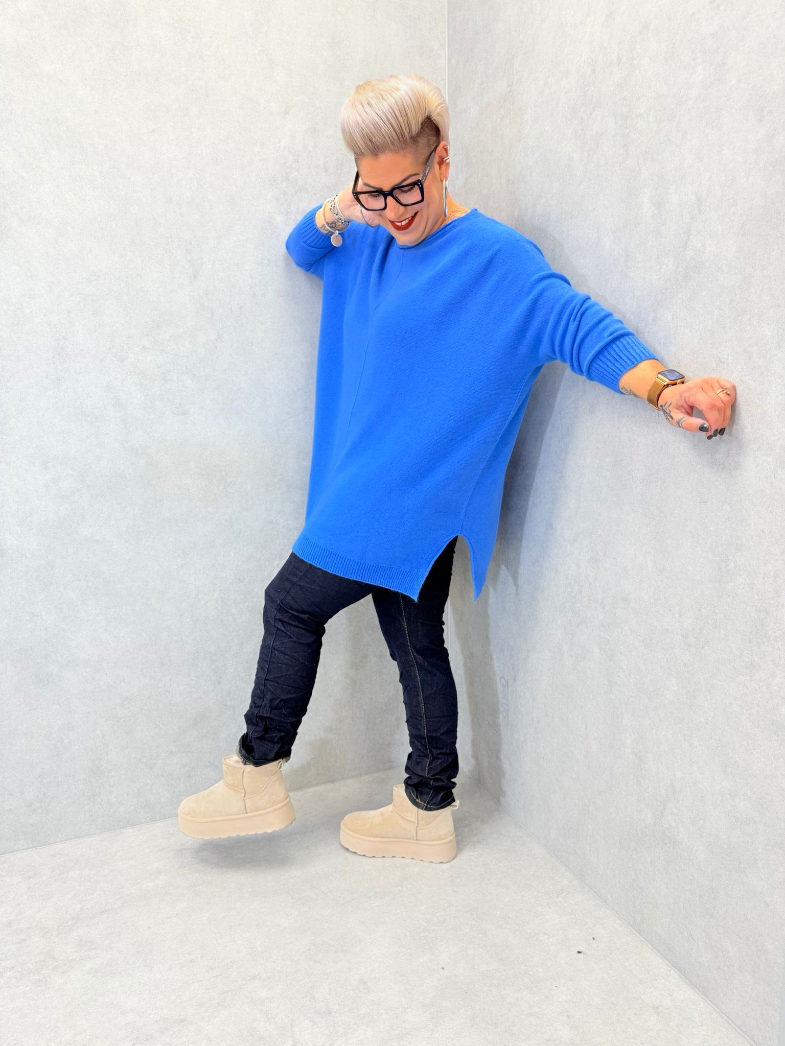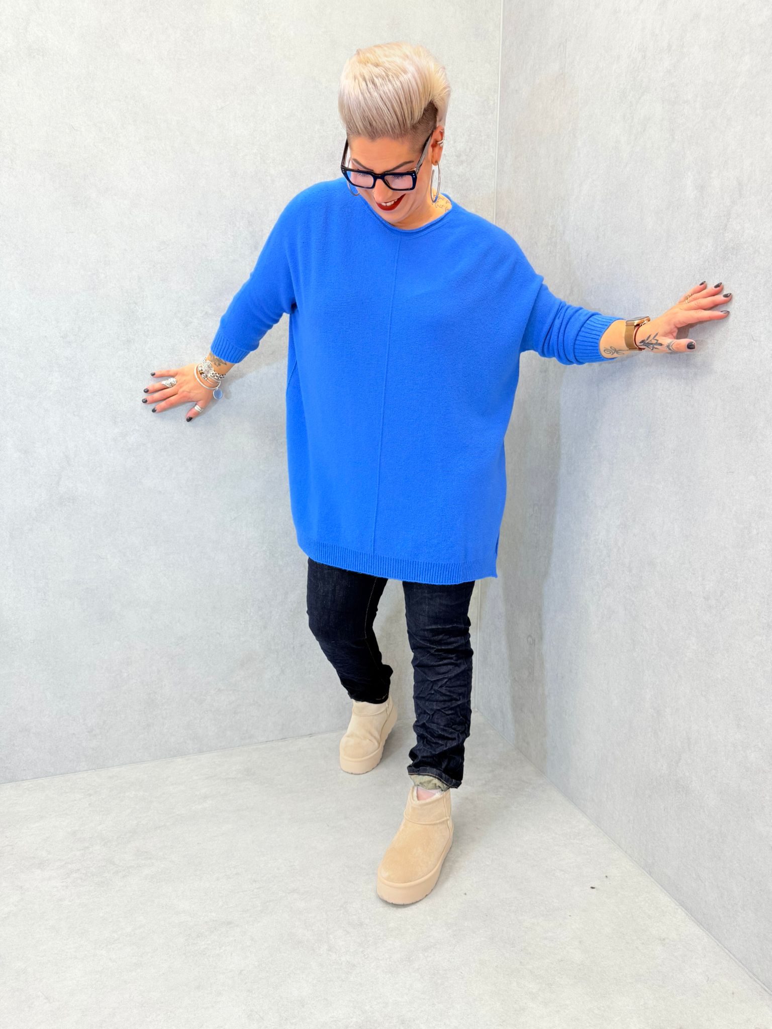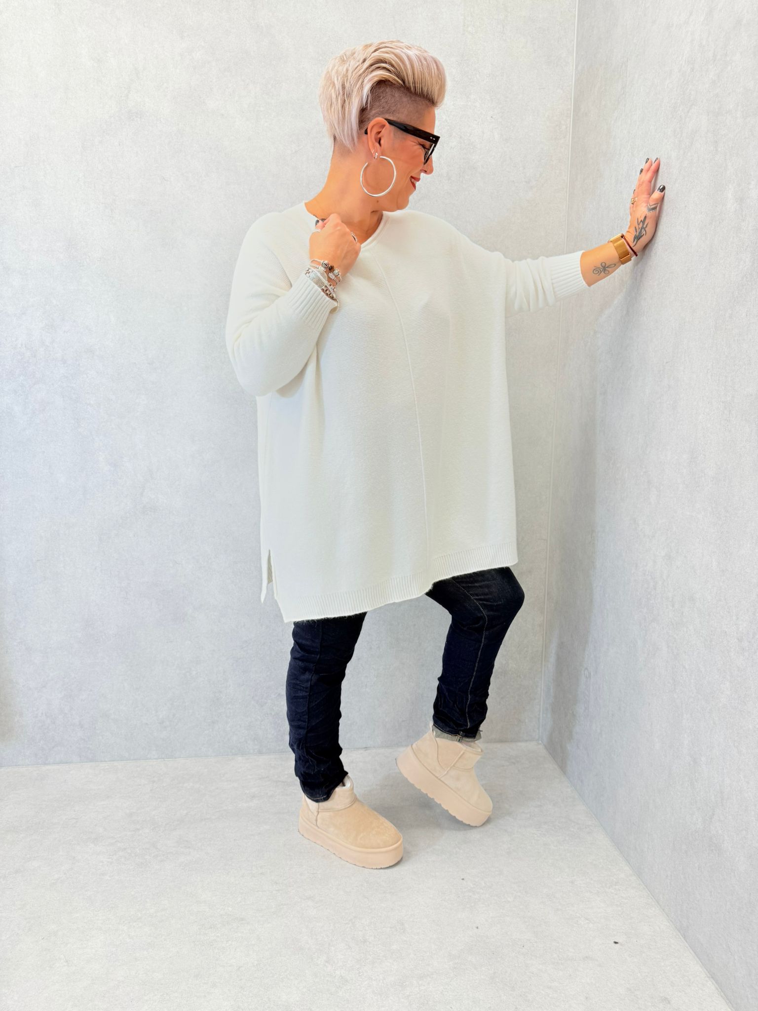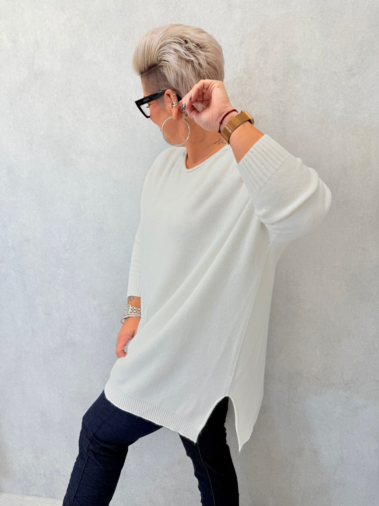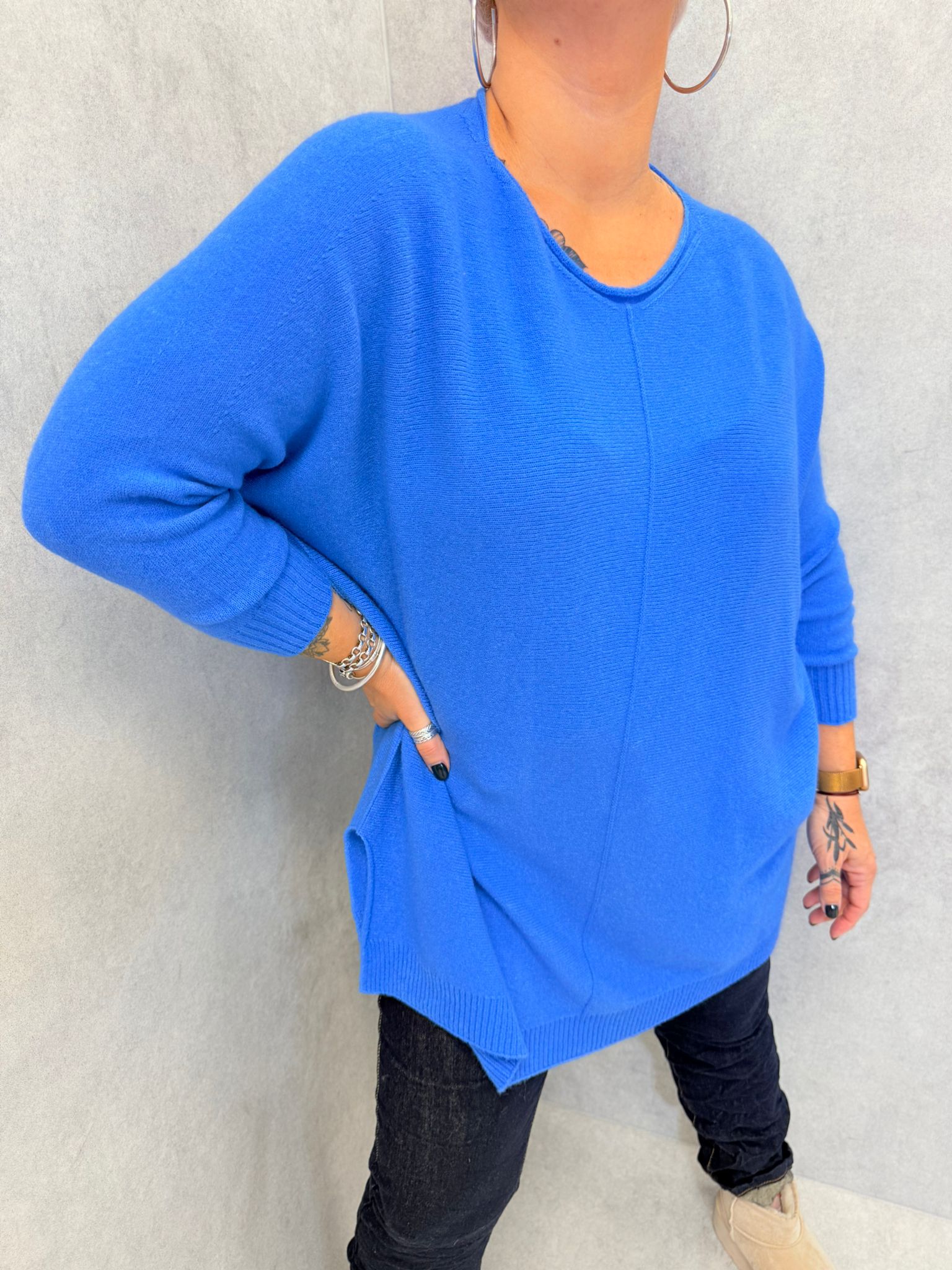 Long pull, matière toute douce, encolure ronde, petites fentes sur chaque côté