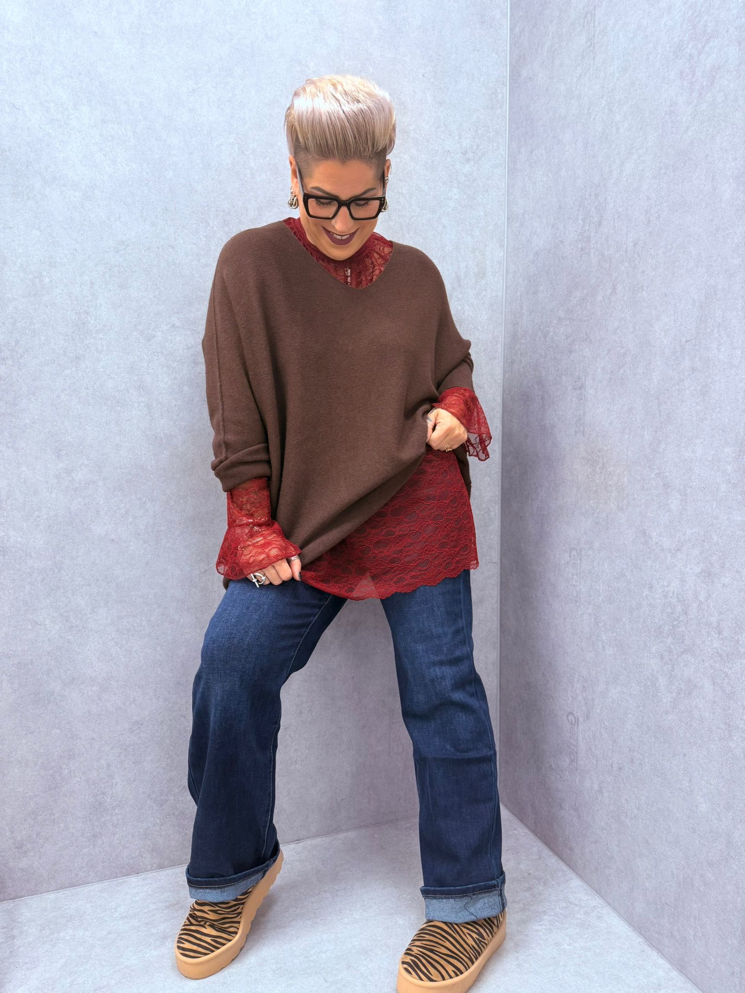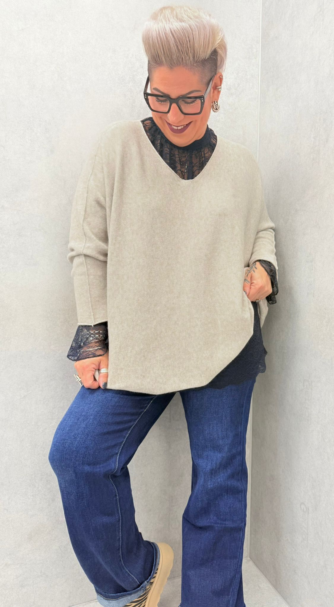 Pull encolure en V, matière très douce, peut se porter avec le haut en dentelle