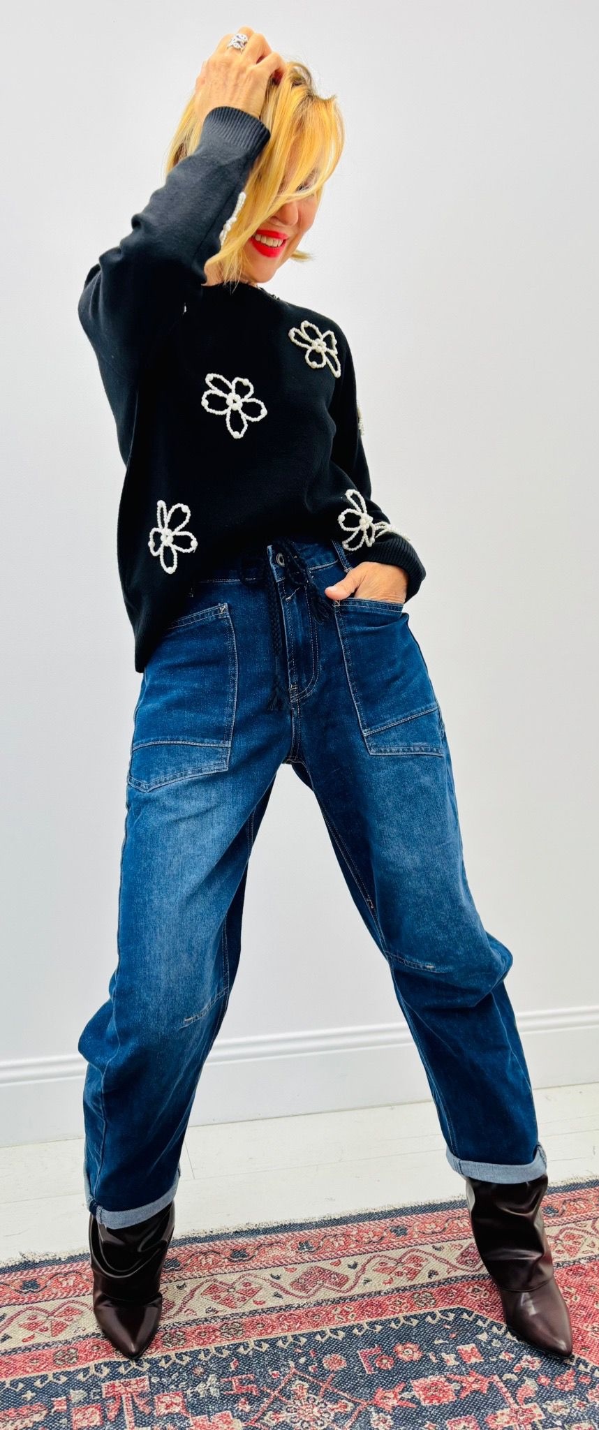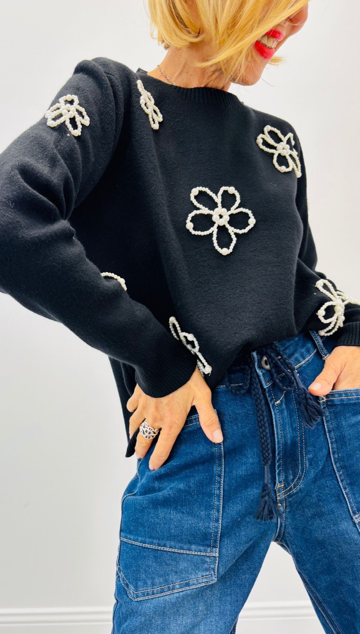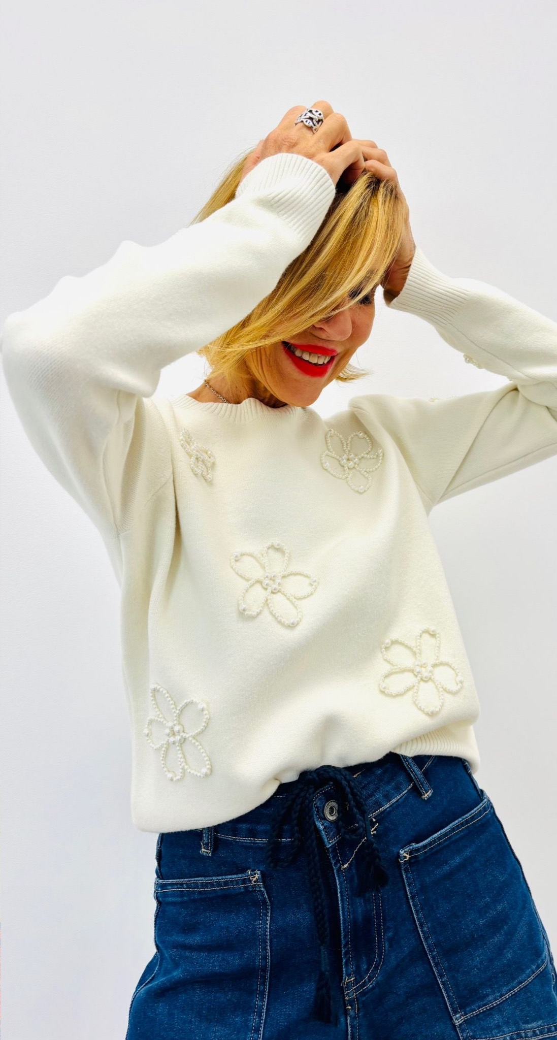 Pull avec fleurs et perles, col rond, matière qui ne pique pas