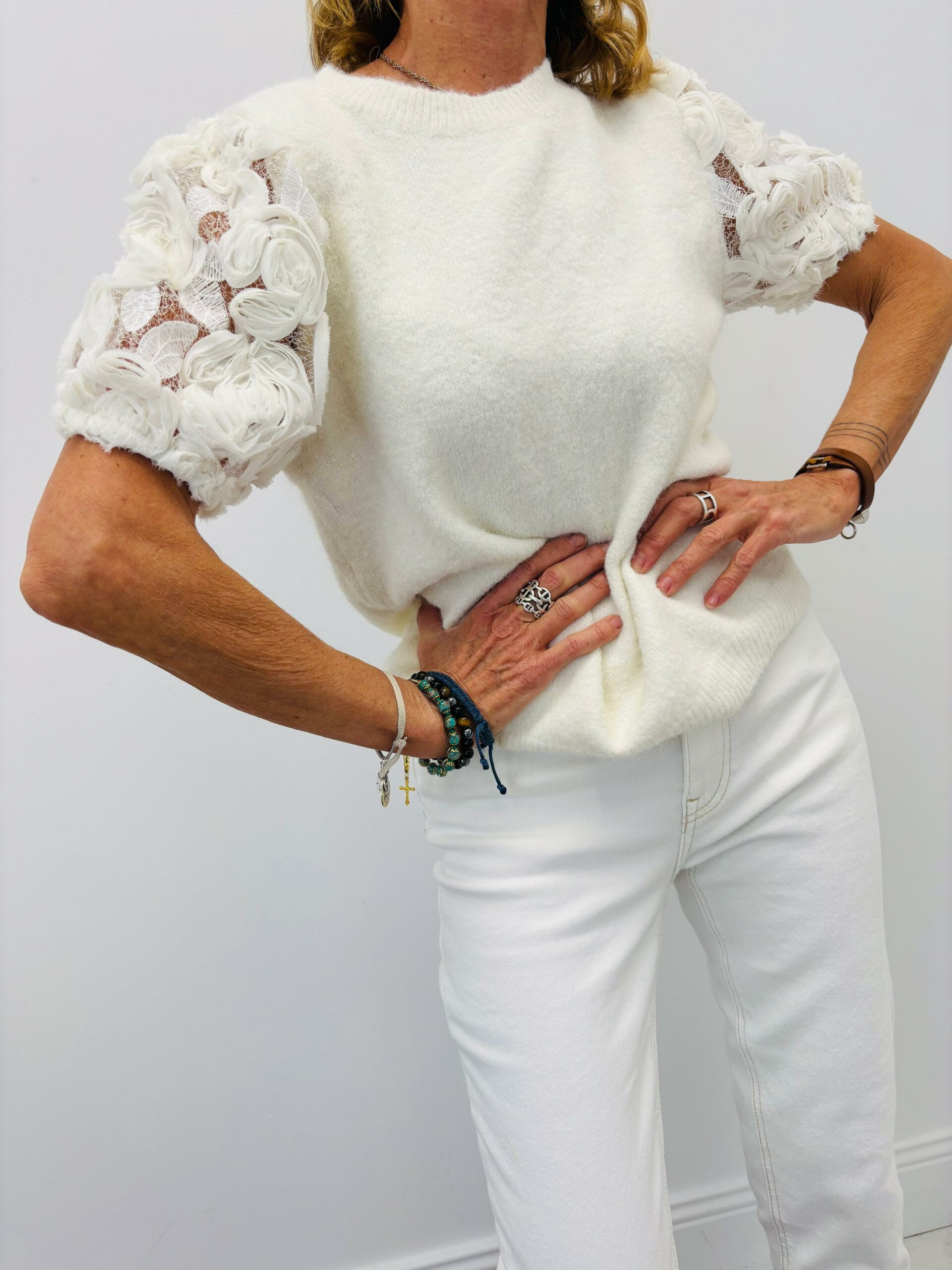 Pull blanc avec manches courtes et des fleurs en broderies, encolure ronde