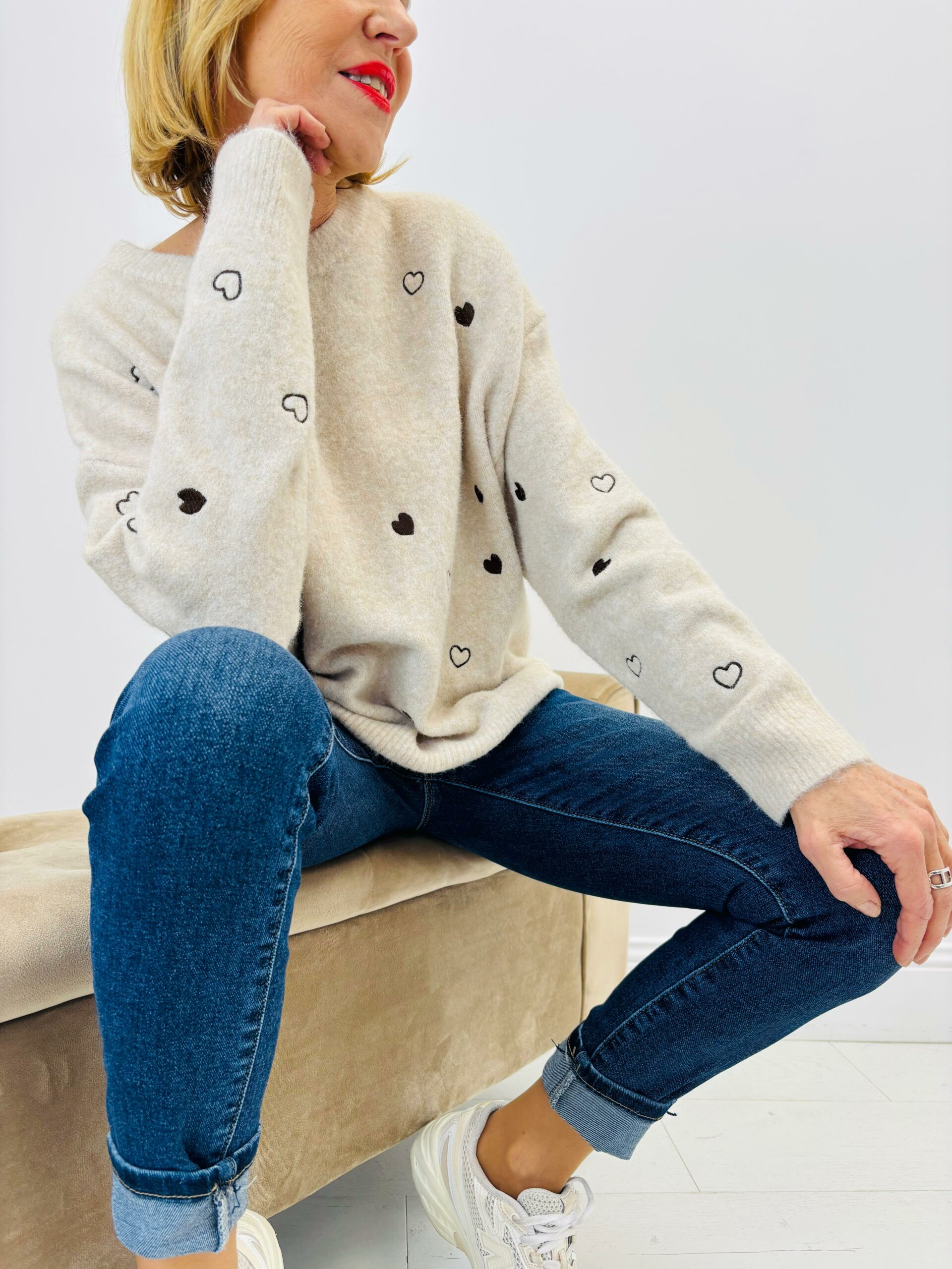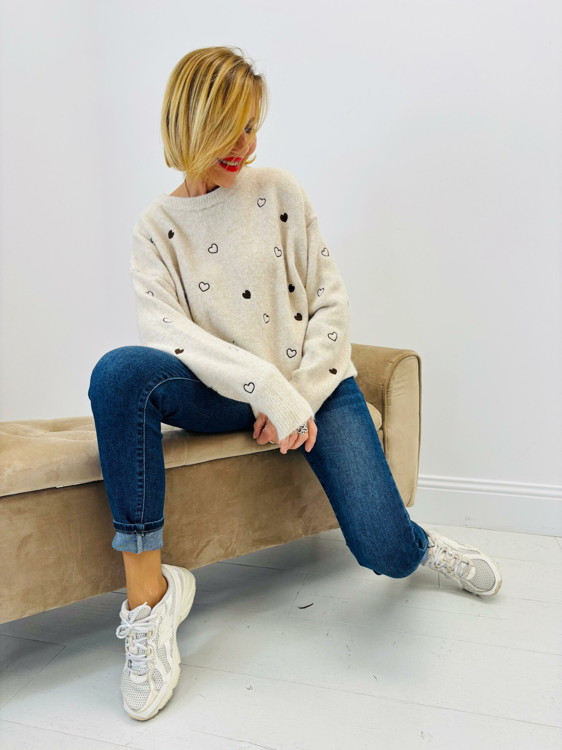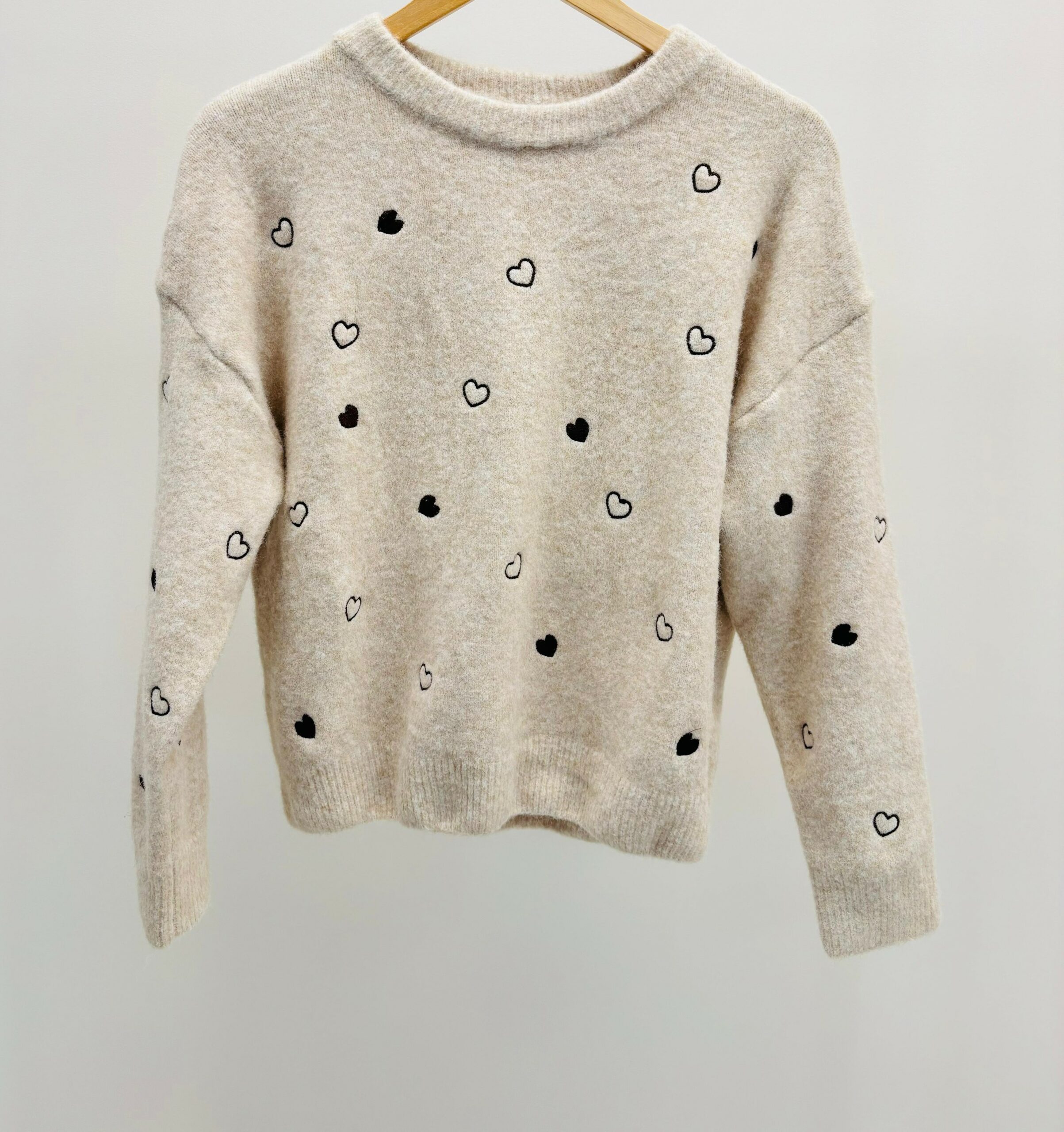 Pull sable avec petits cœurs chocolat, encolure ronde, matière toute douce