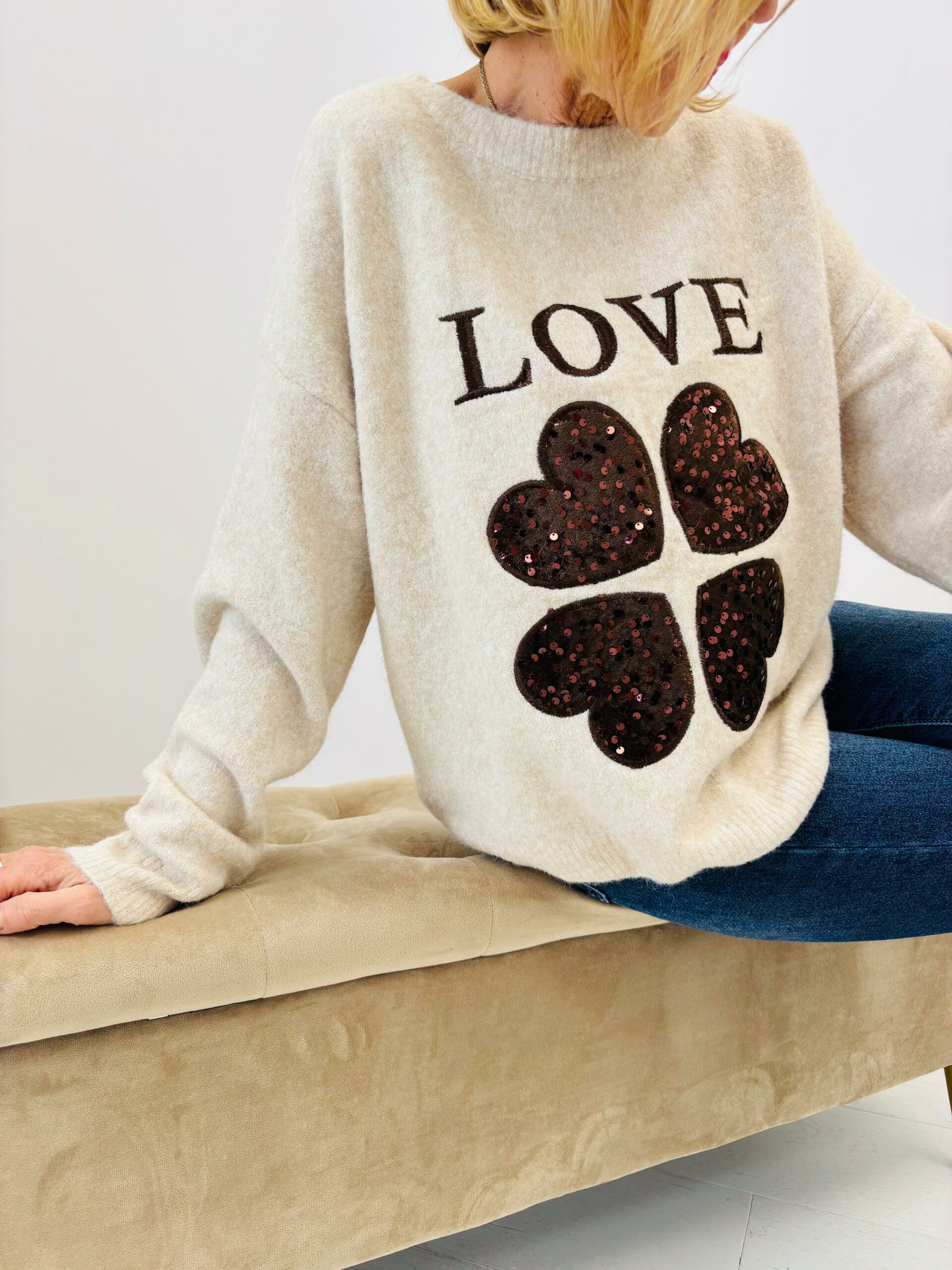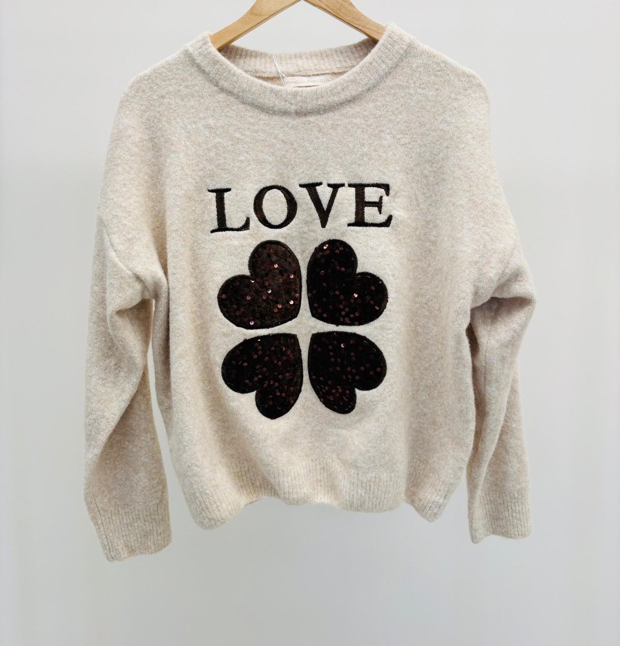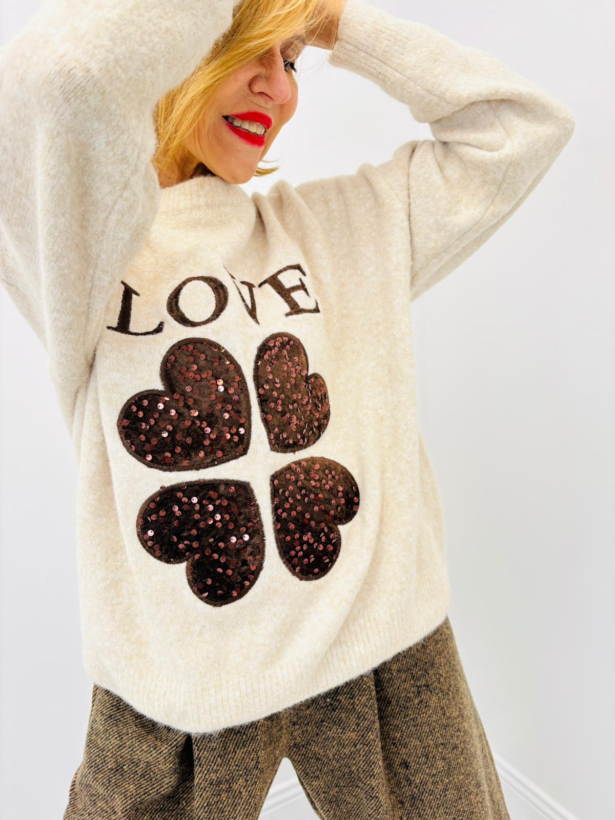 Pull sable avec cœur sequins et love chocolat, encolure ronde