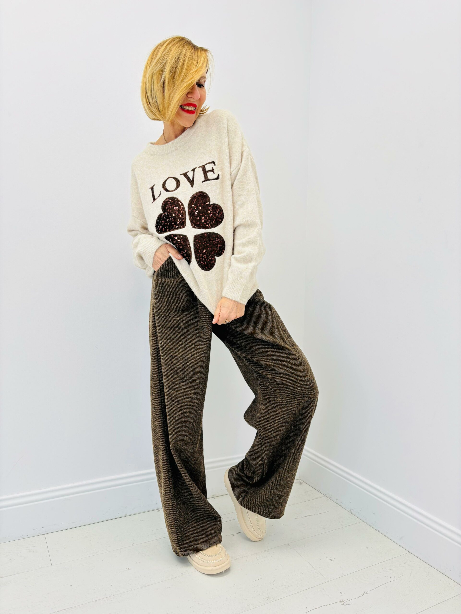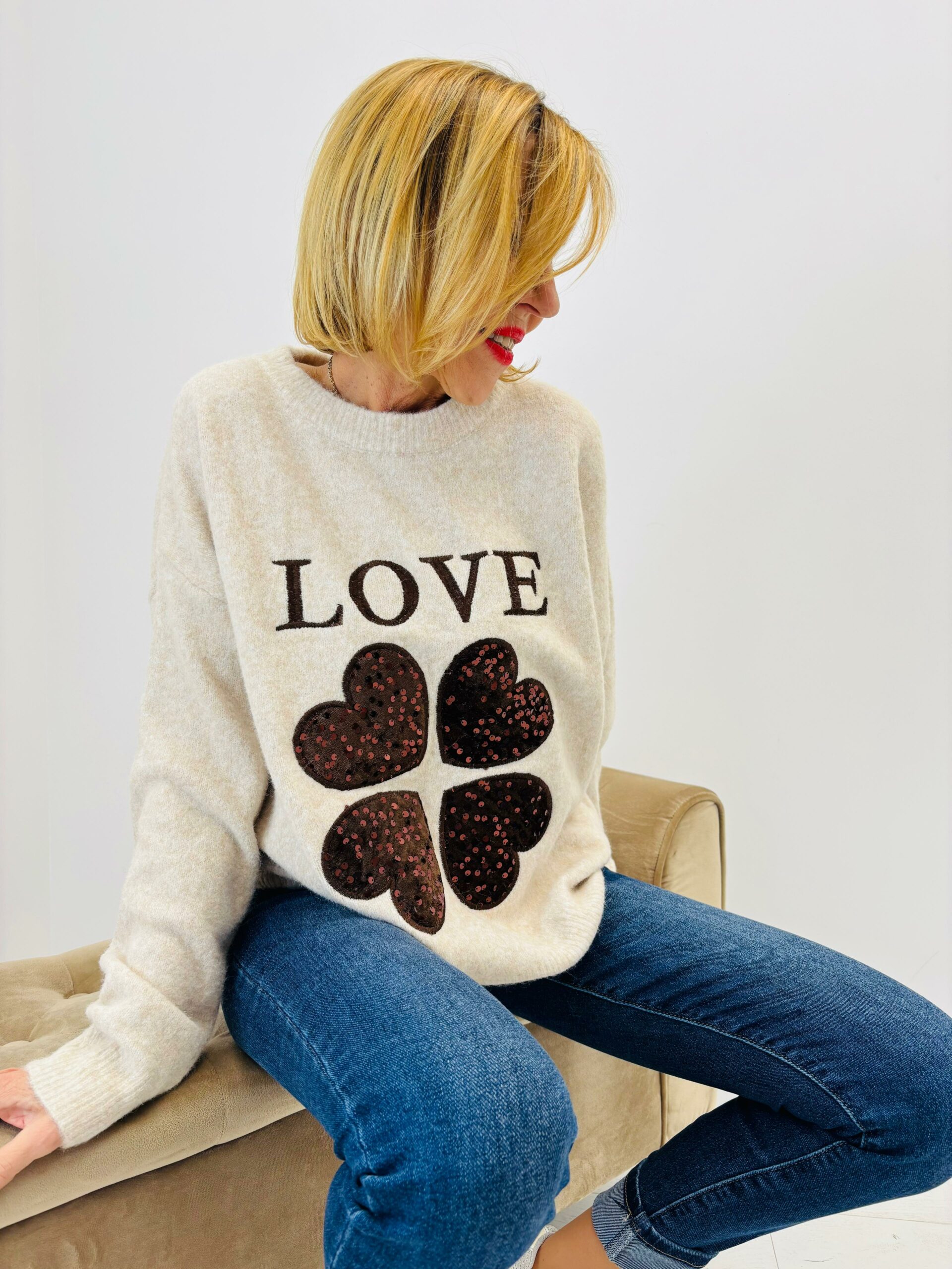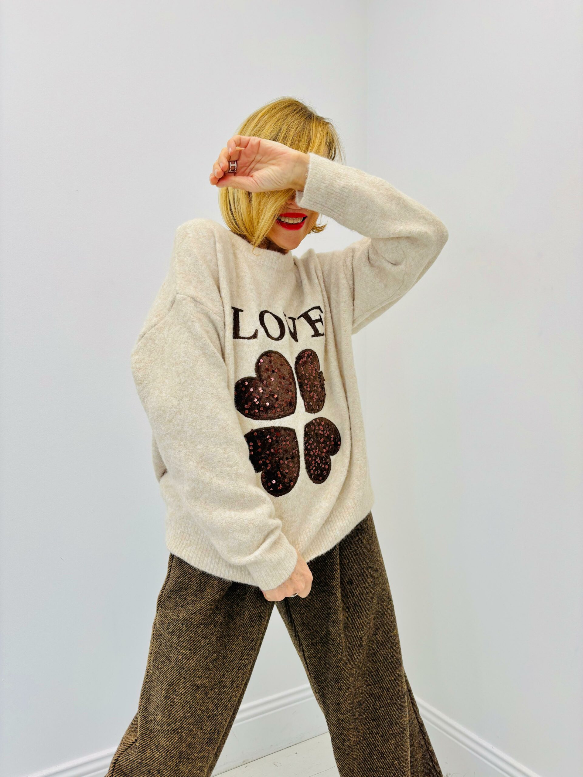 Pull sable avec cœur sequins et love chocolat, encolure ronde