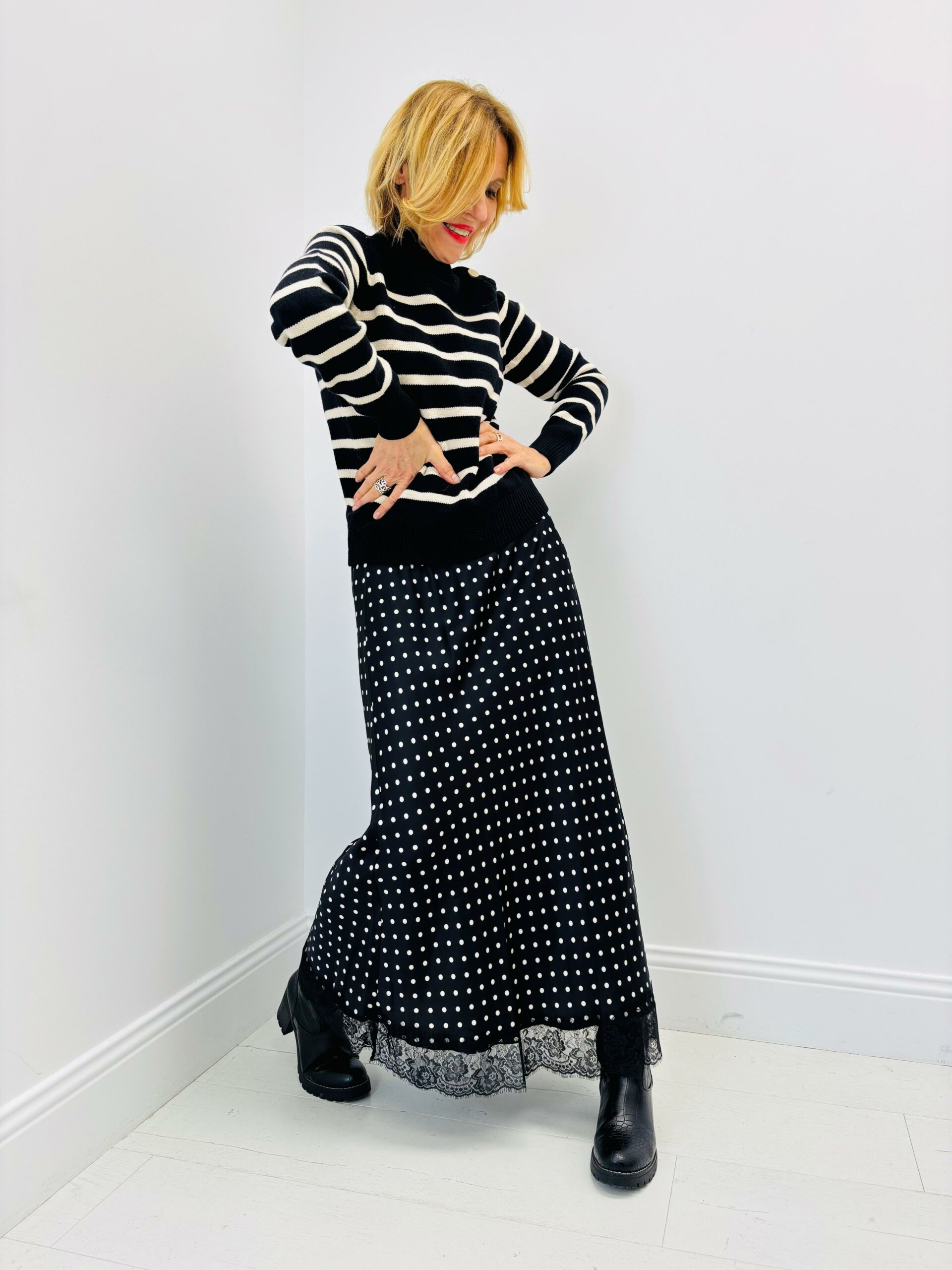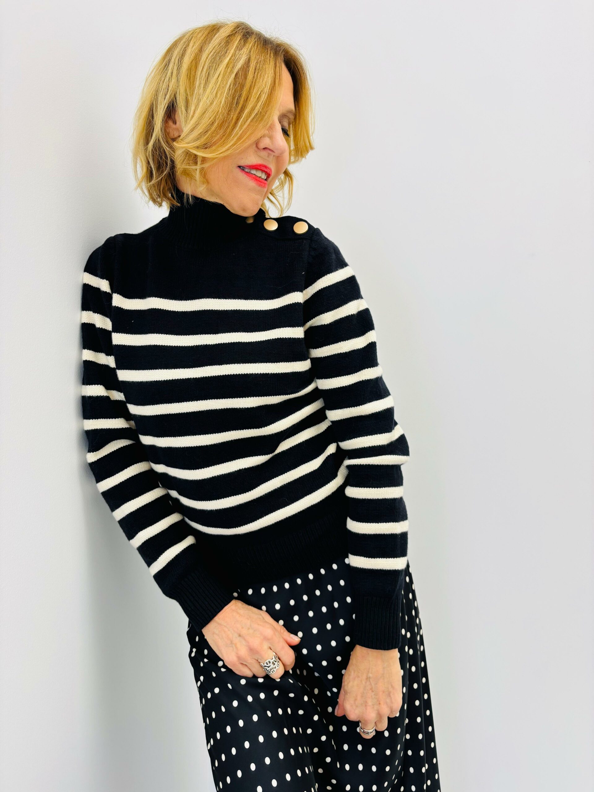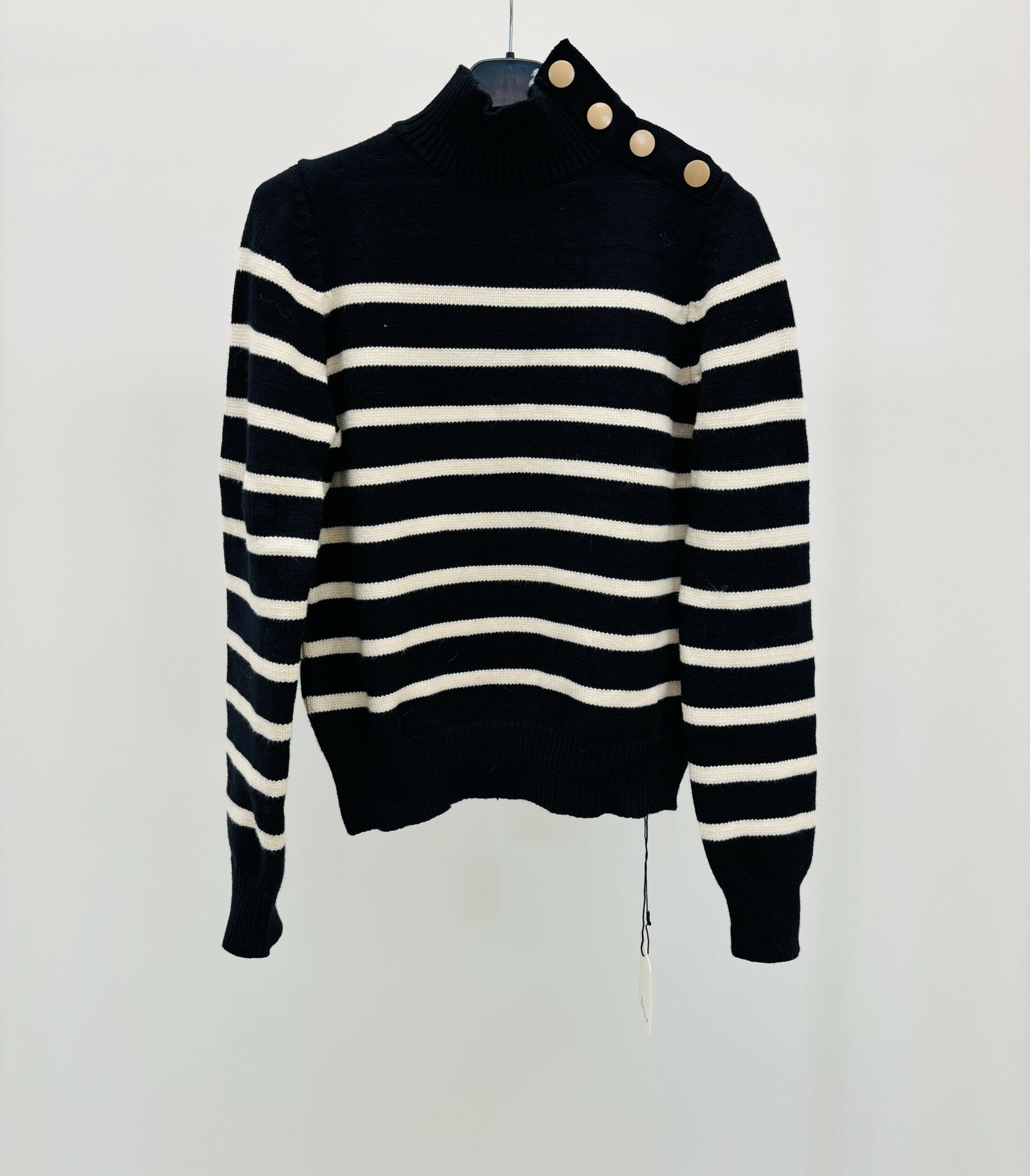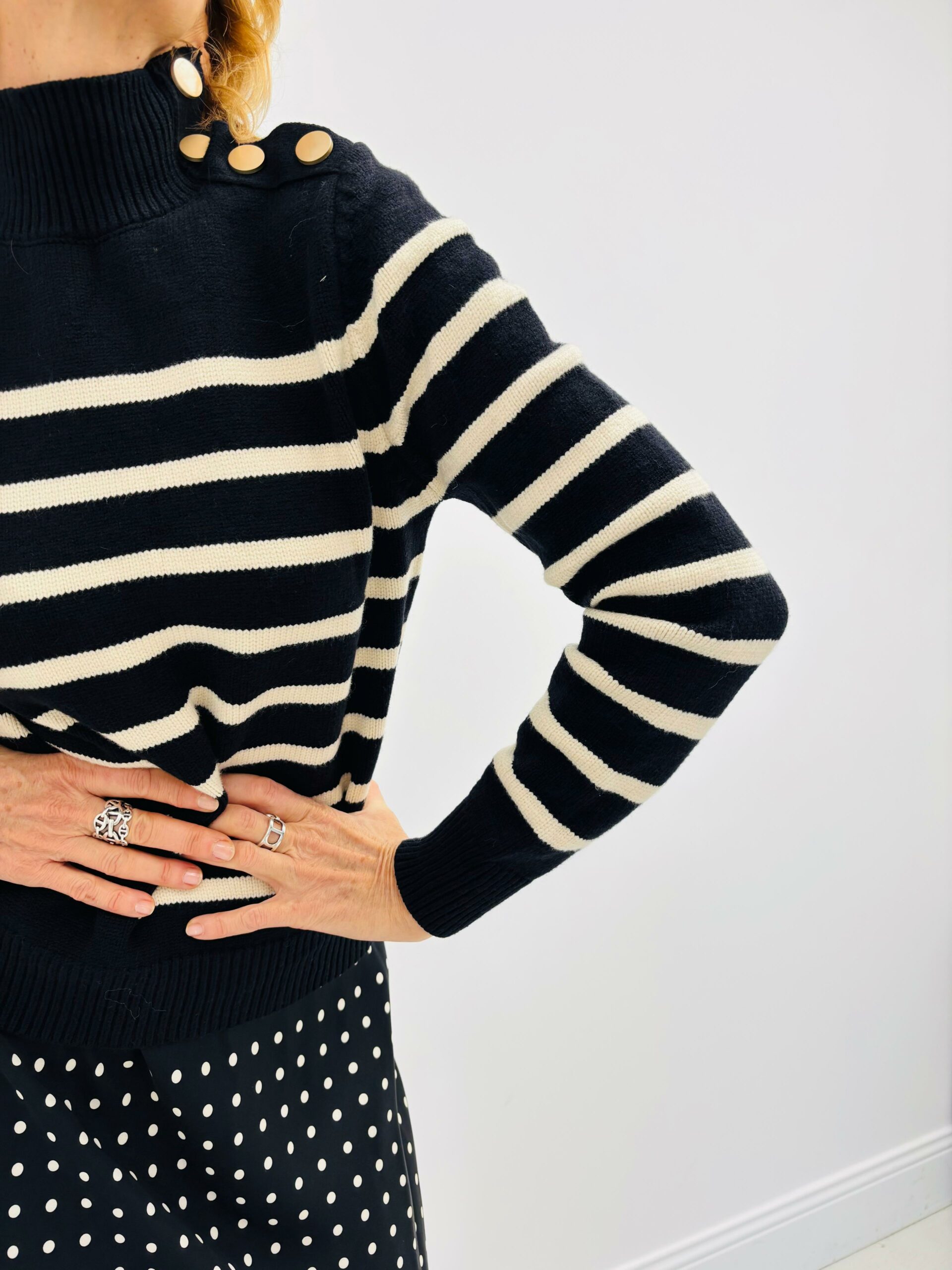 Pull marin, col montant, avec boutons sur un haut d’épaule