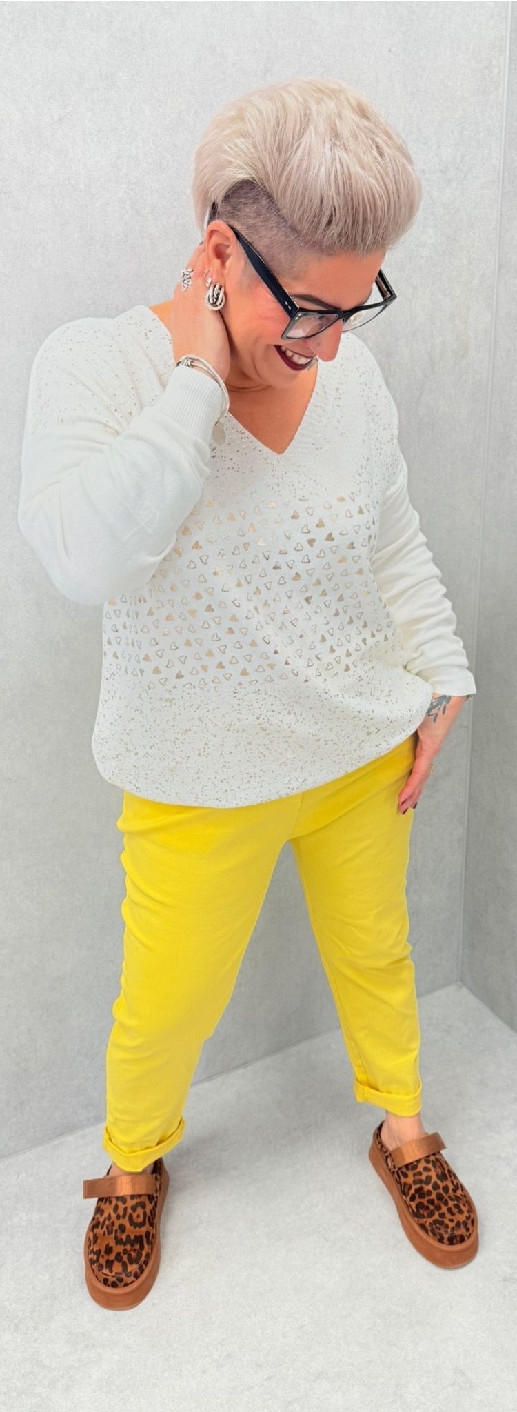 Pull blanc avec cœurs dorés, encolure en V, matière toute douce