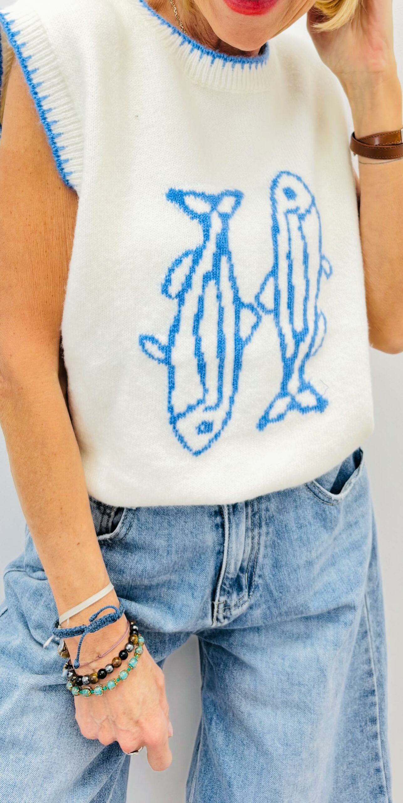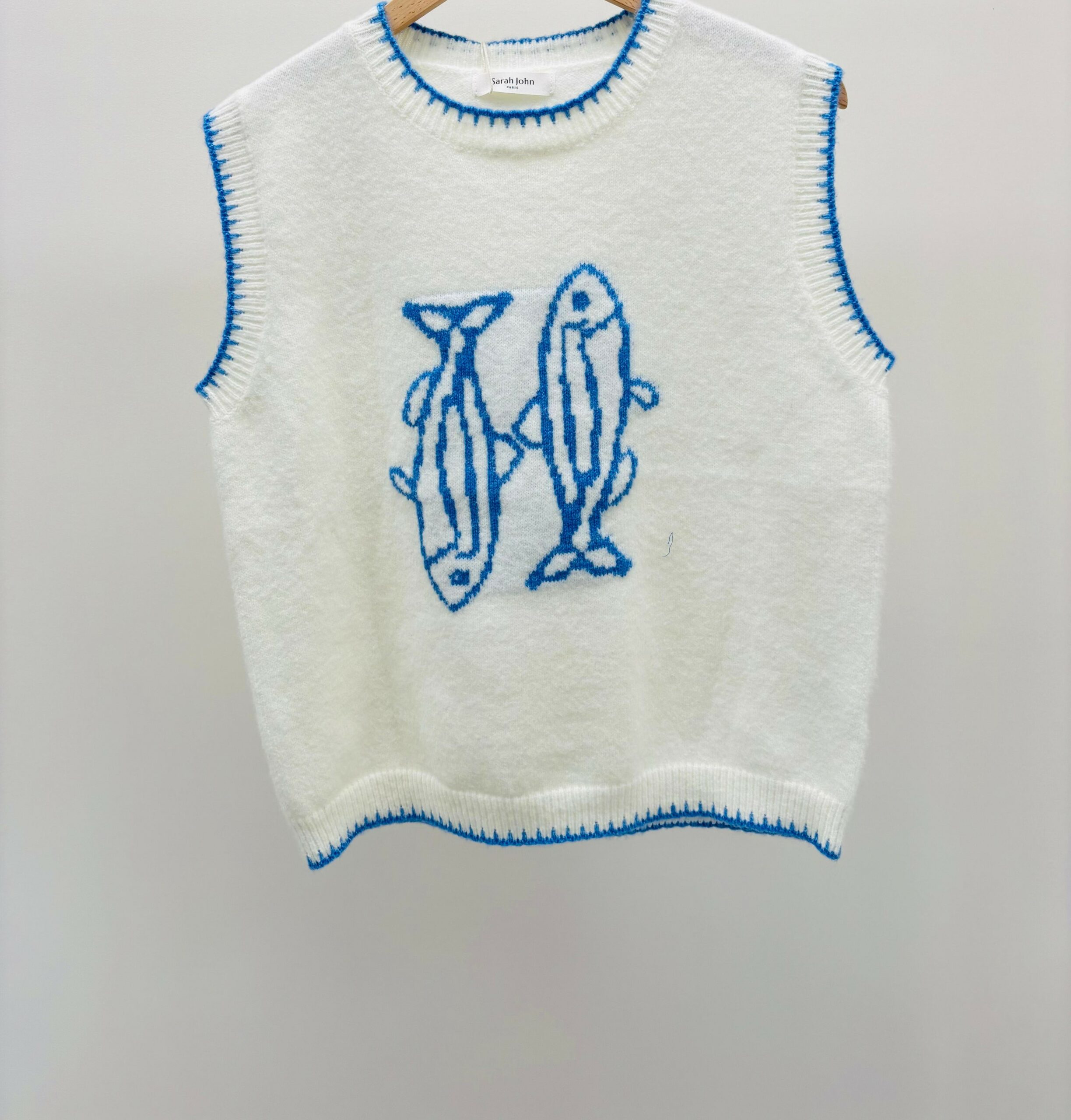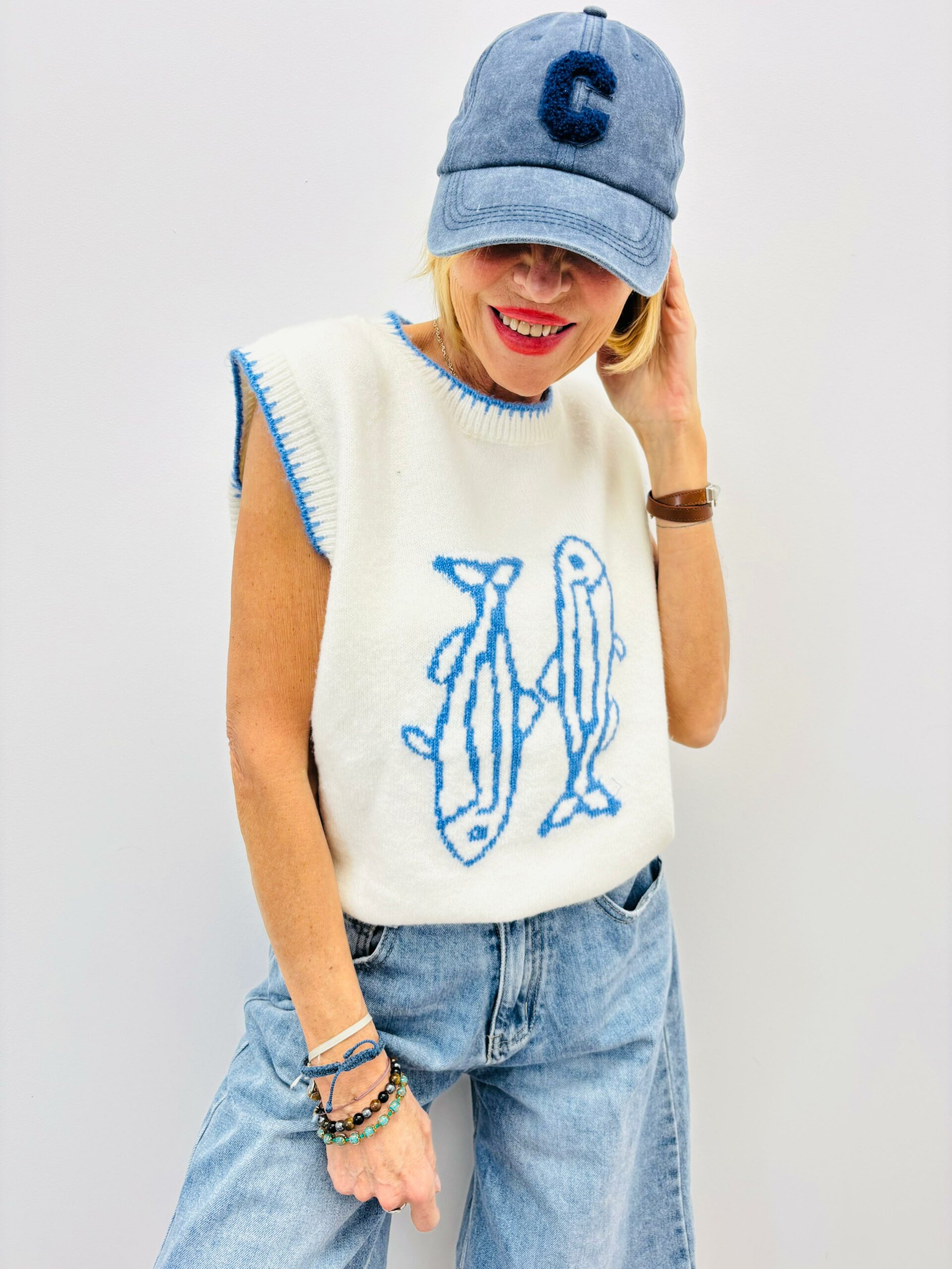Pull sans manches avec 2 poissons bleus devant, encolure ronde
