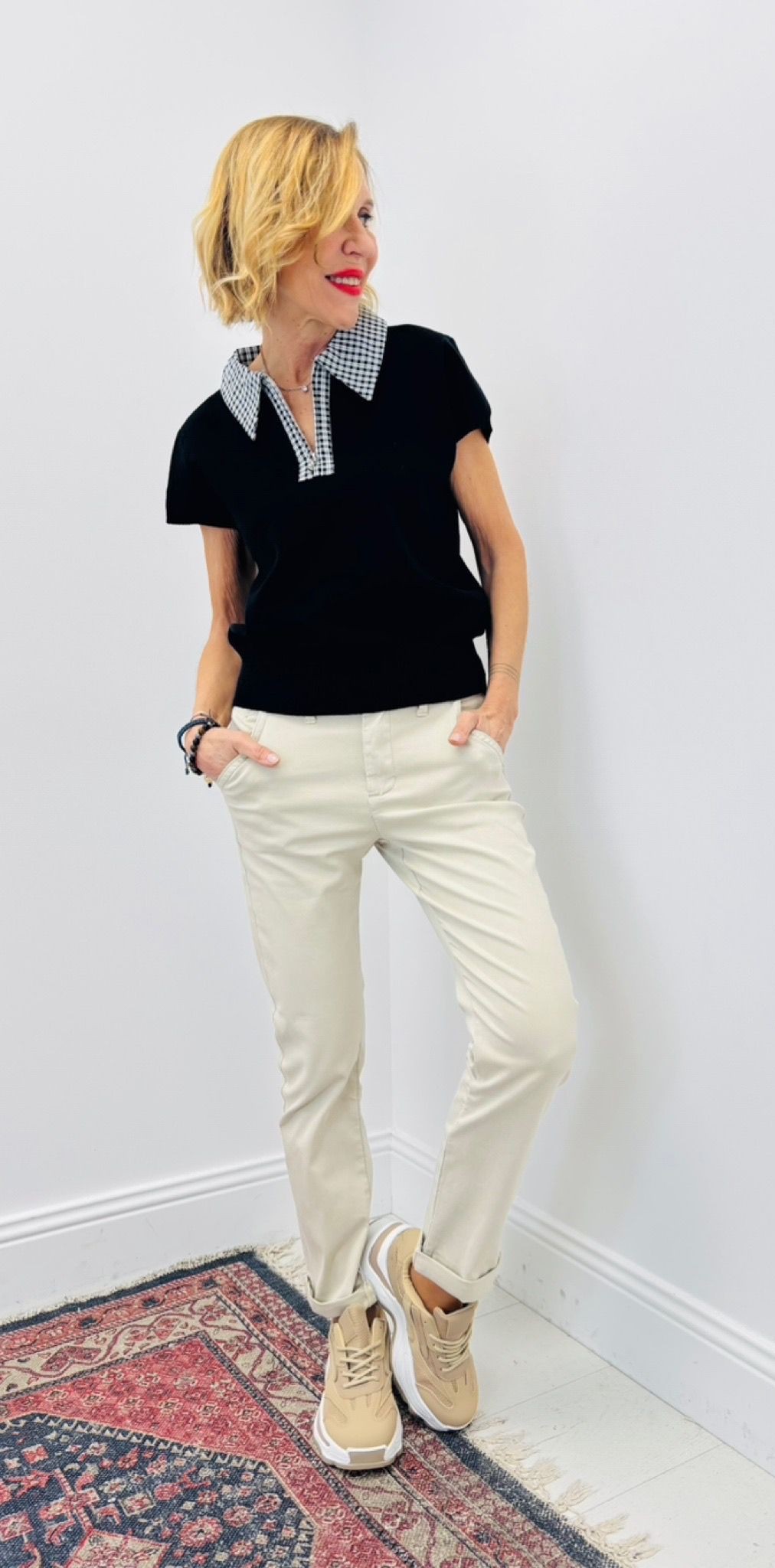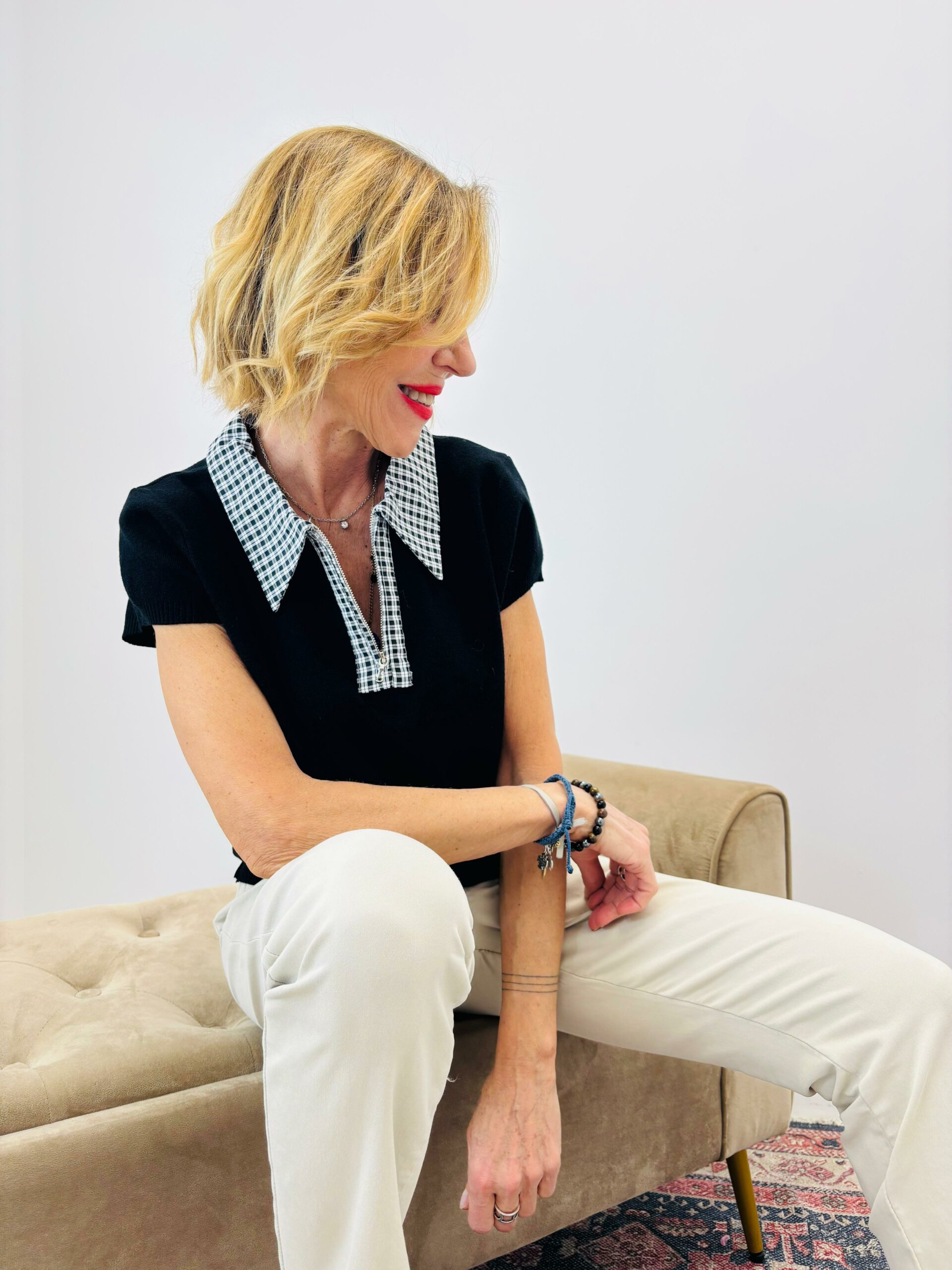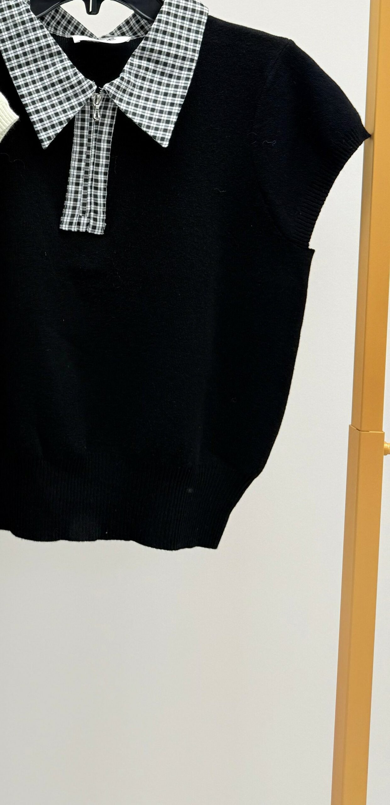 Pull noir, manches courtes, col zippé noir et blanc à petits carreaux, belle qualité