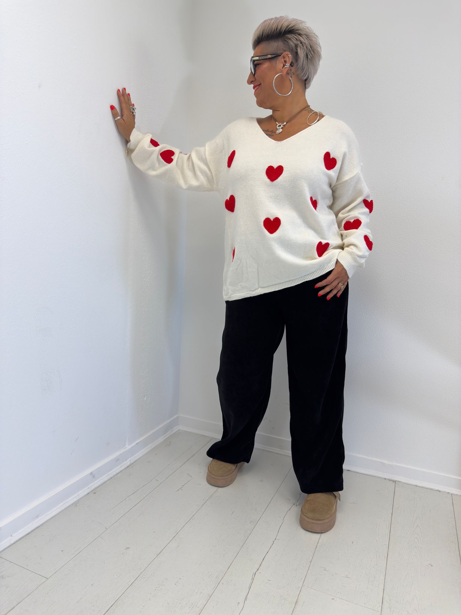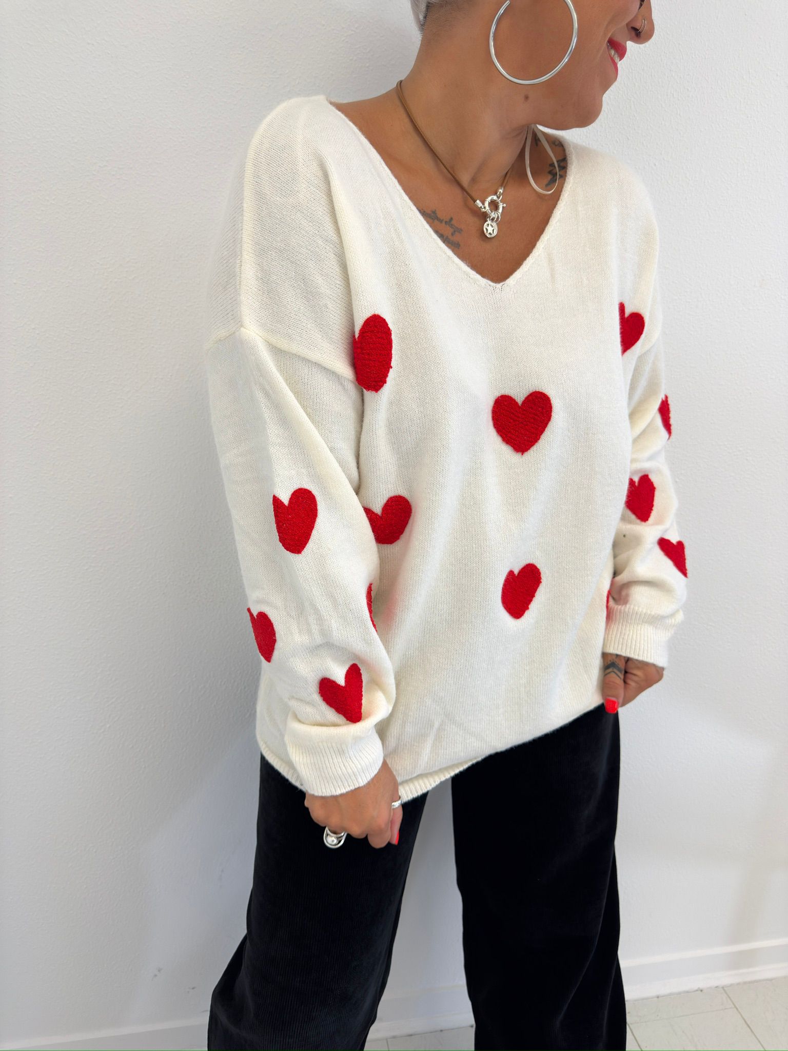 Pull blanc avec gros cœurs rouges, encolure en V, matière très douce