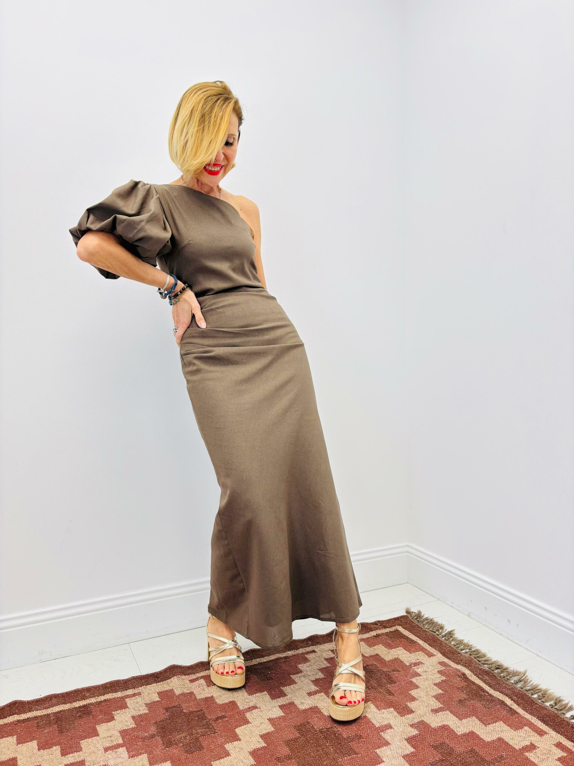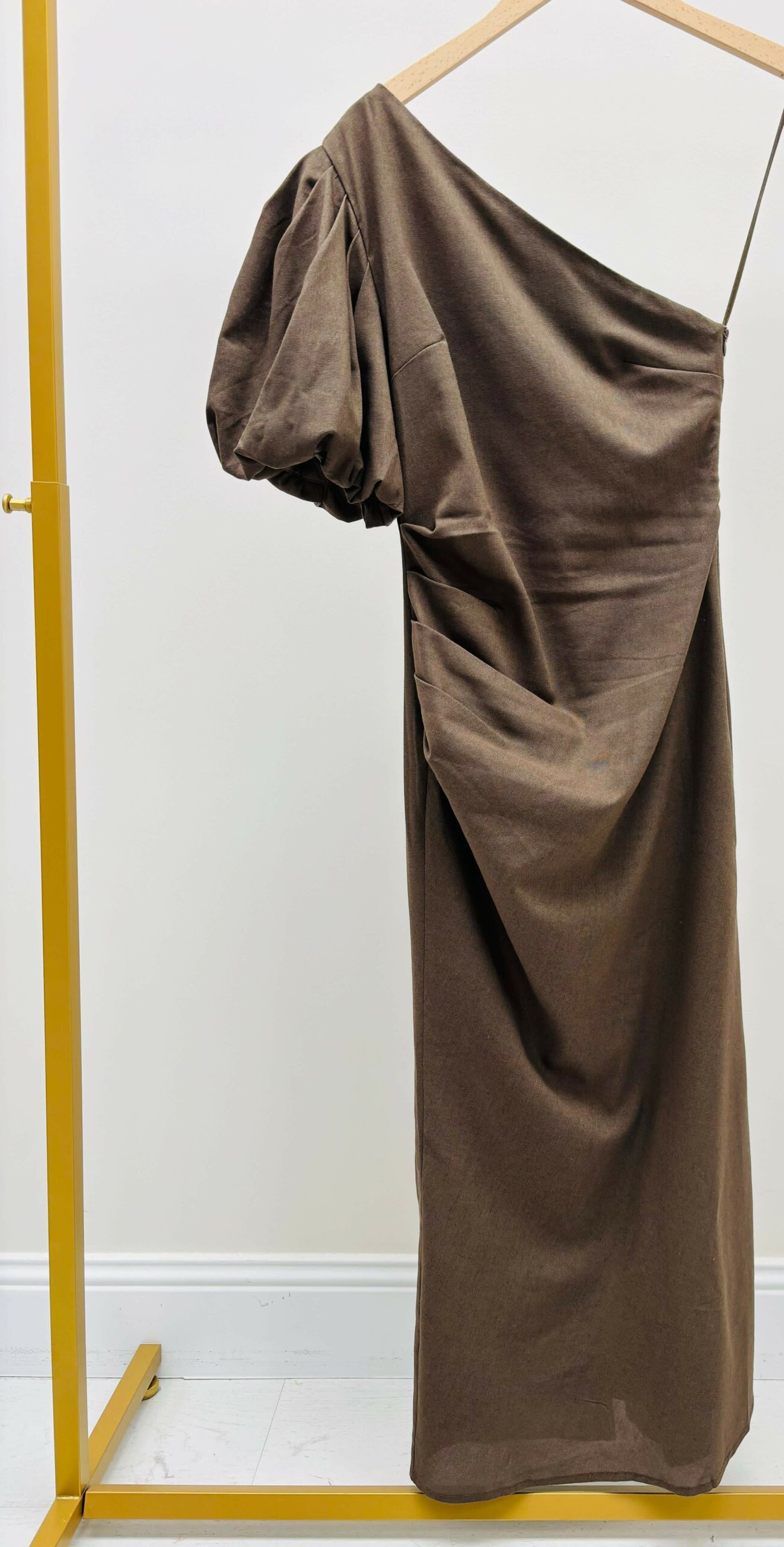 Robe longue et droite, marron, one shoulder, épaule dénudée, légèrement froncée sur le ventre, fente au dos, doublée