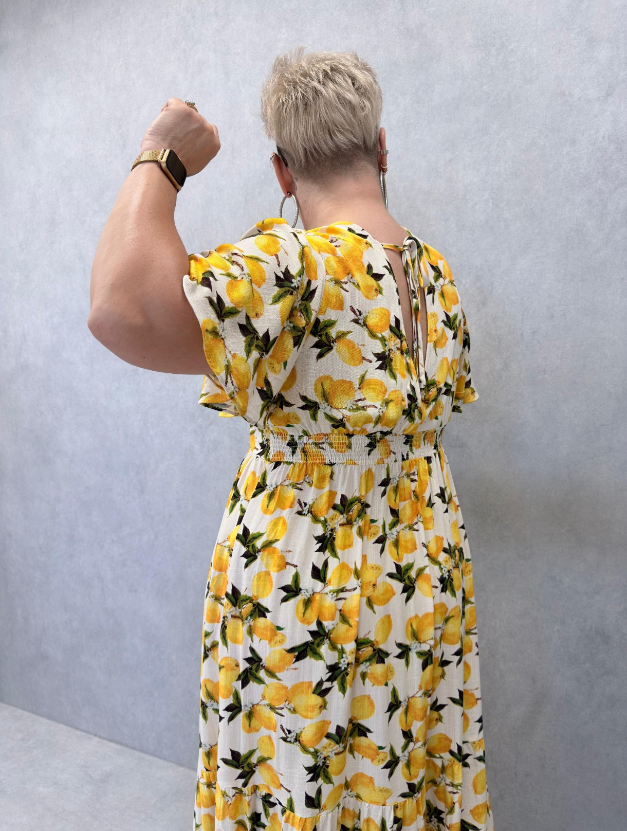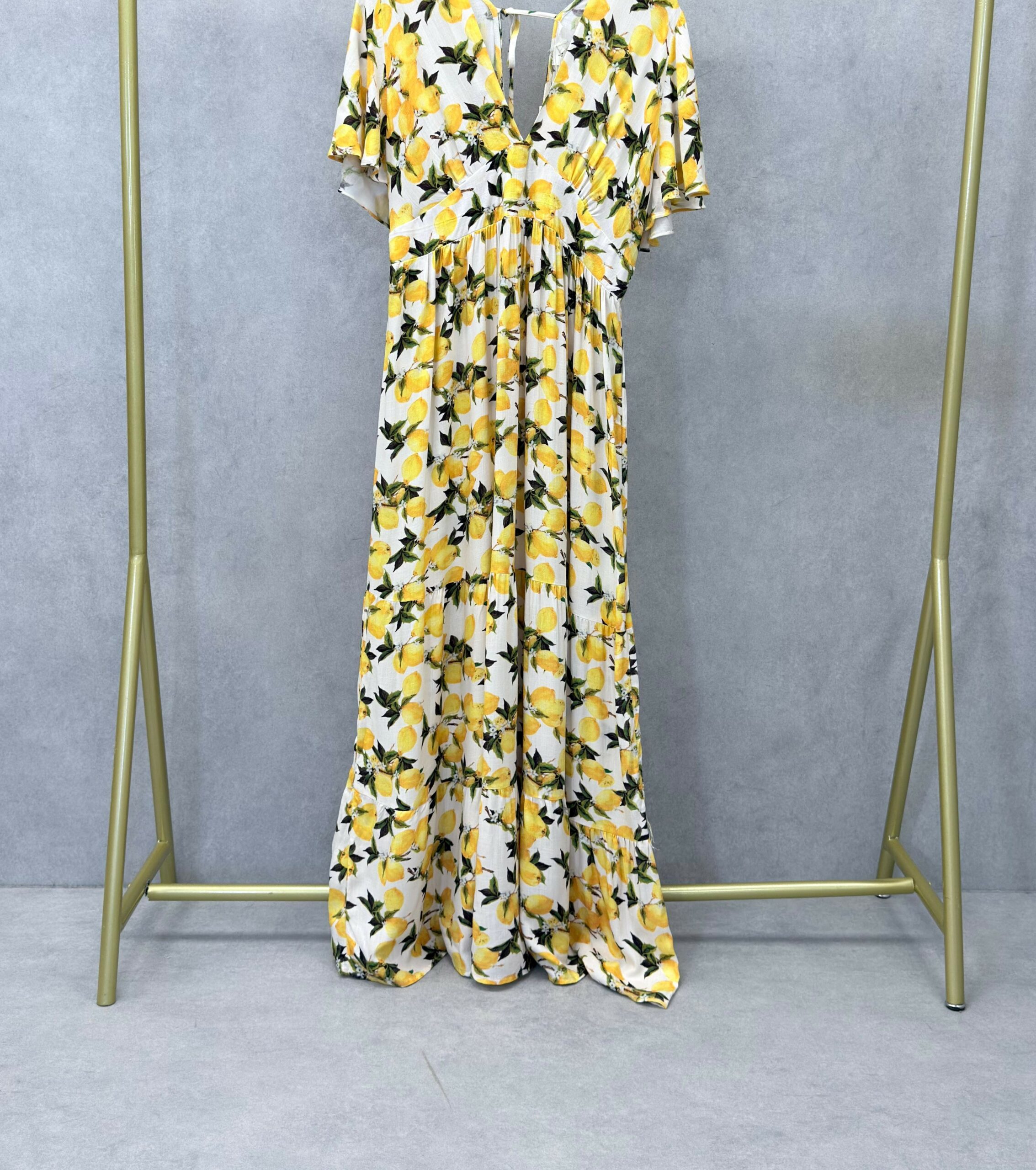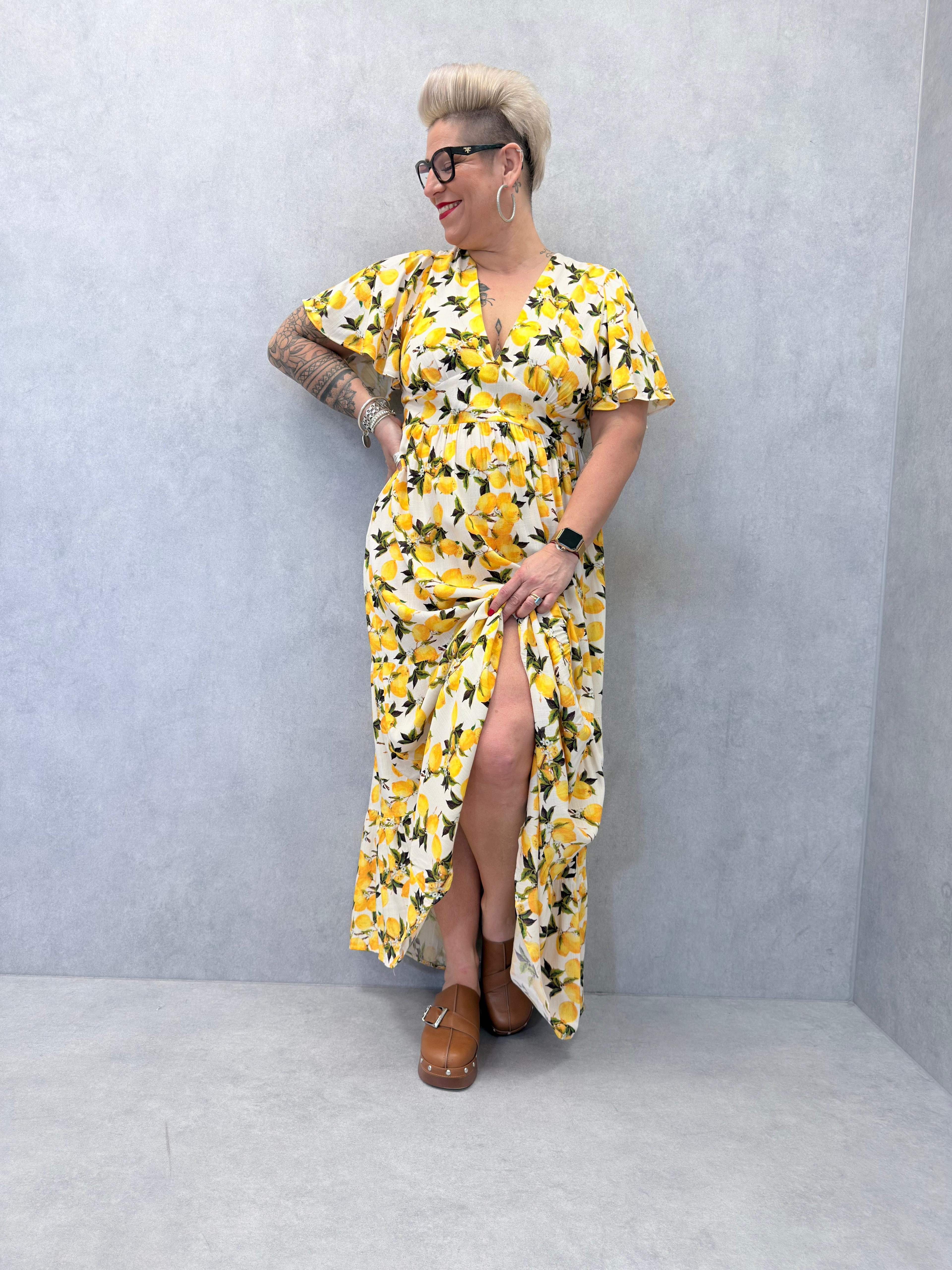 Robe longue aux motifs citrons, fluide, manches courtes tombantes, encolure en V, smocks au dos