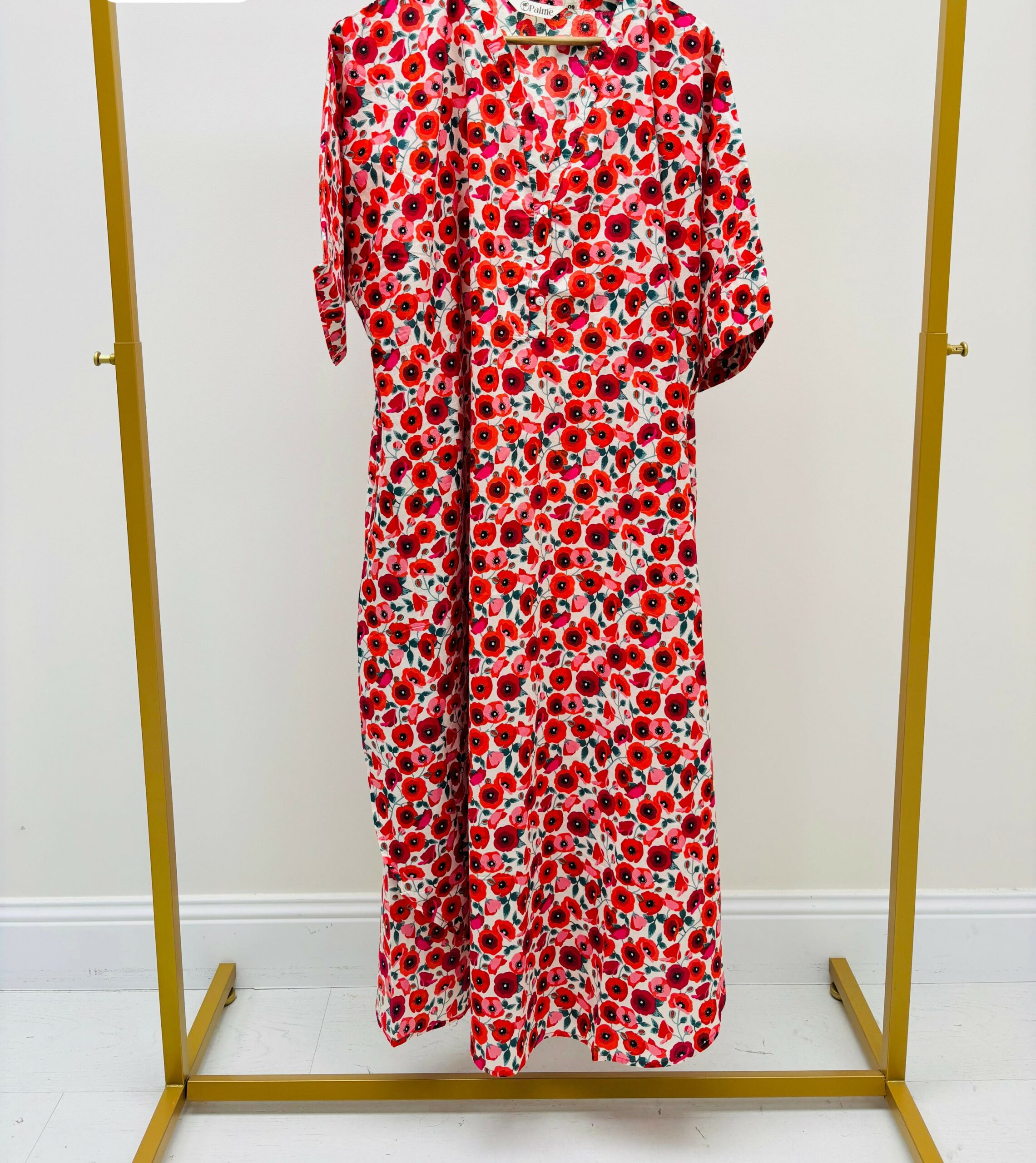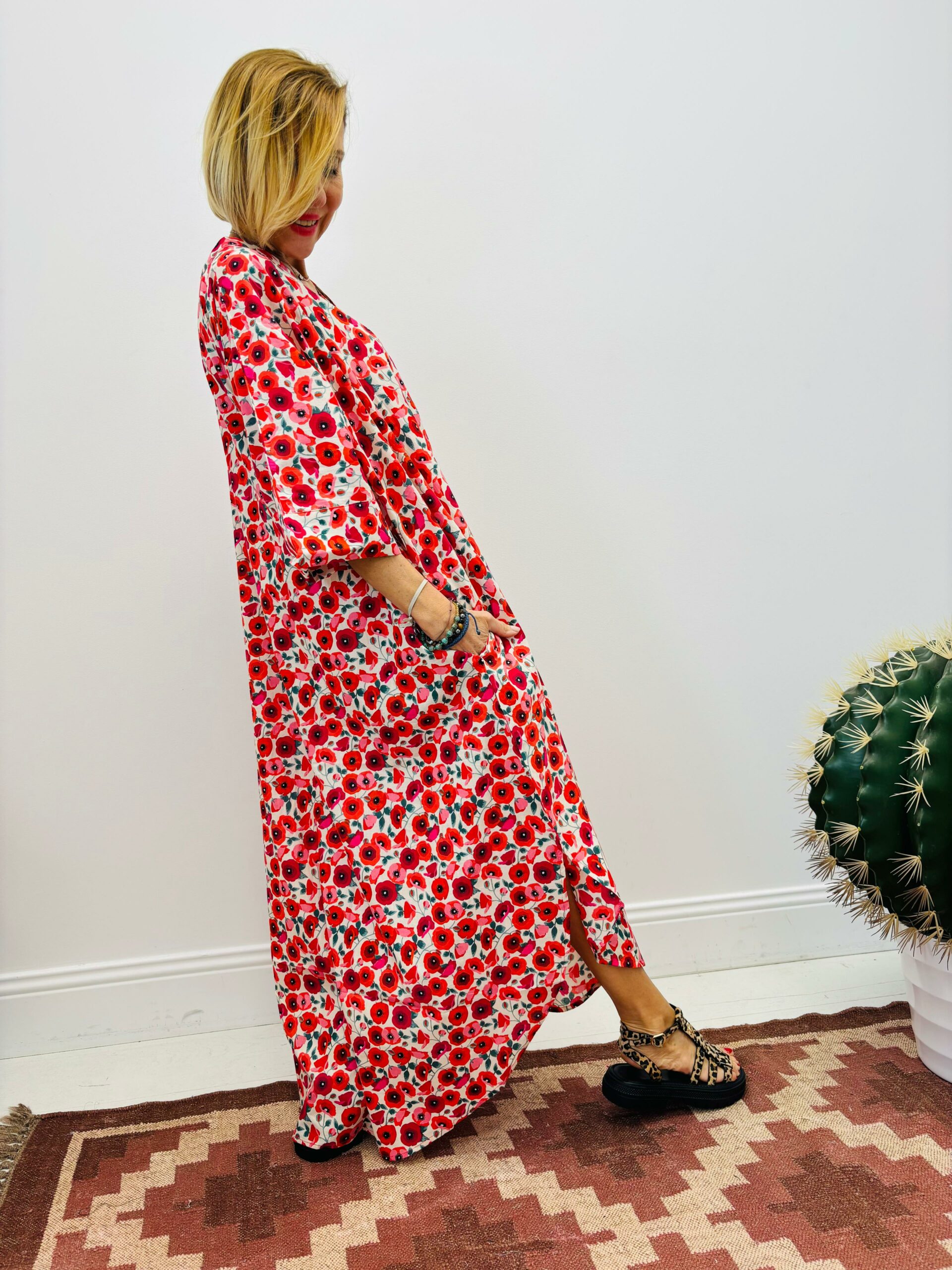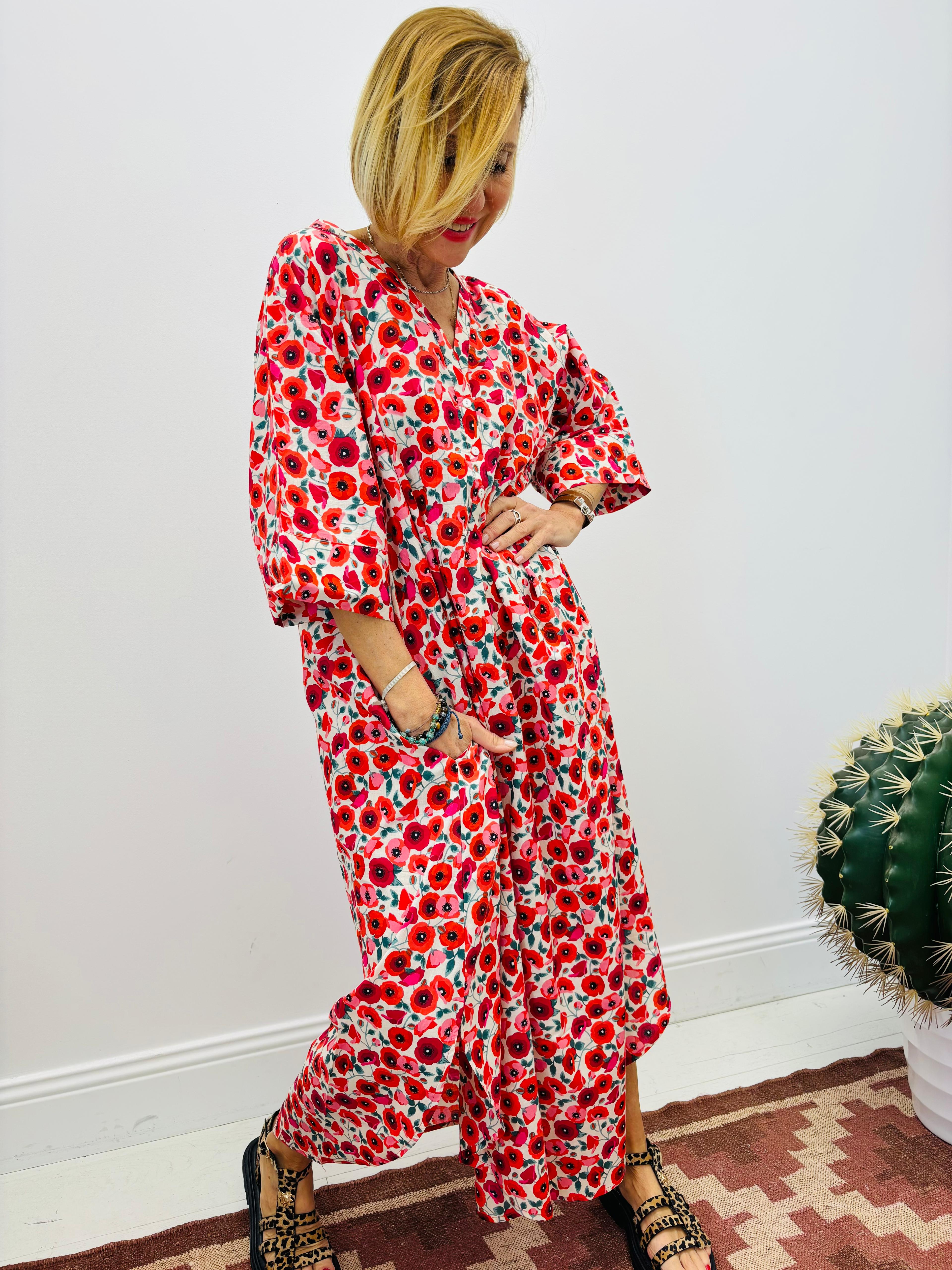 Robe longue aux motifs coquelicots, très agréable à porter, poches, légère découpe sur chaque côté dans le bas