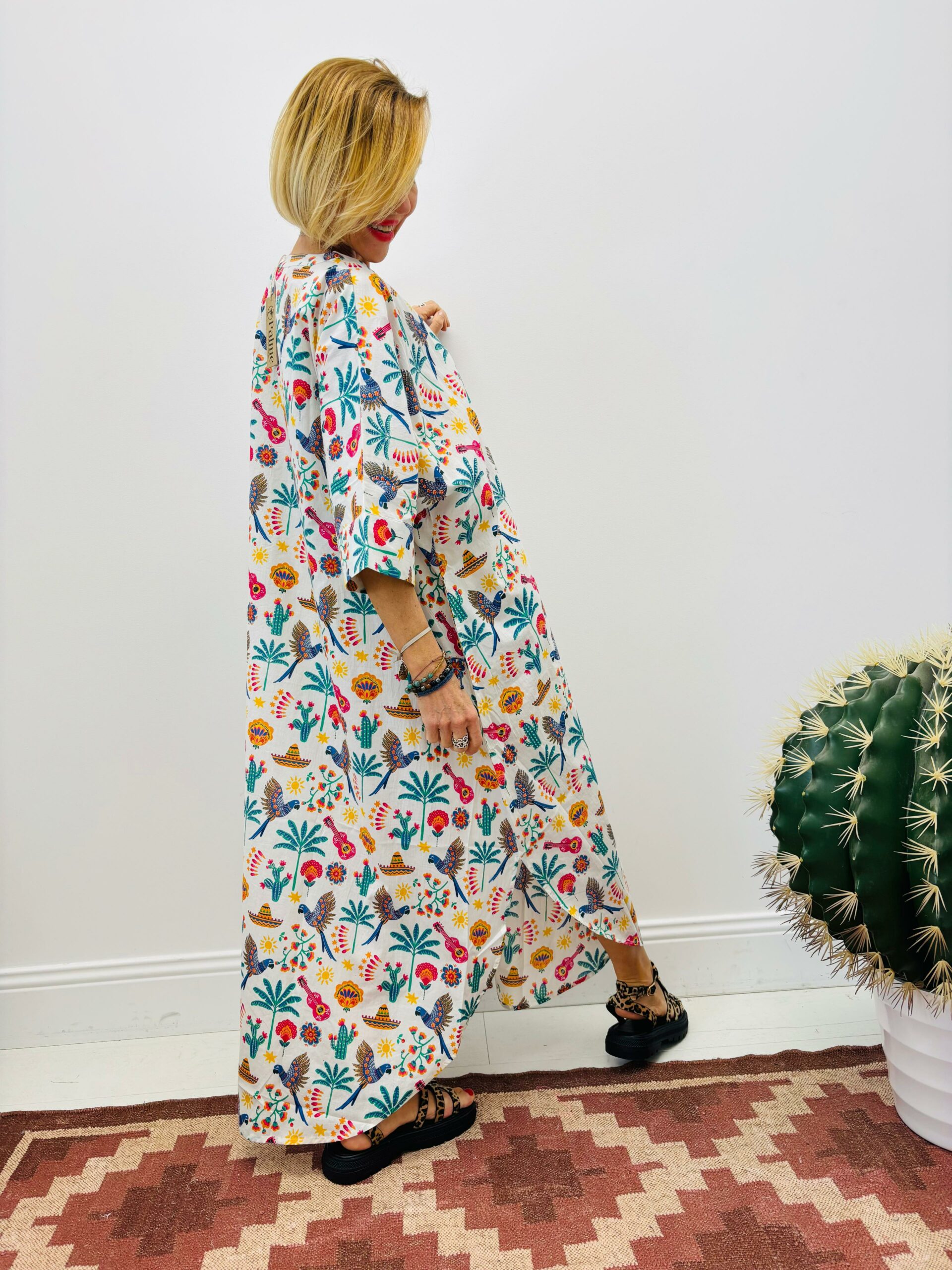 Robe longue aux motifs mexicains, très agréable à porter, poches, légère découpe sur chaque côté dans le bas