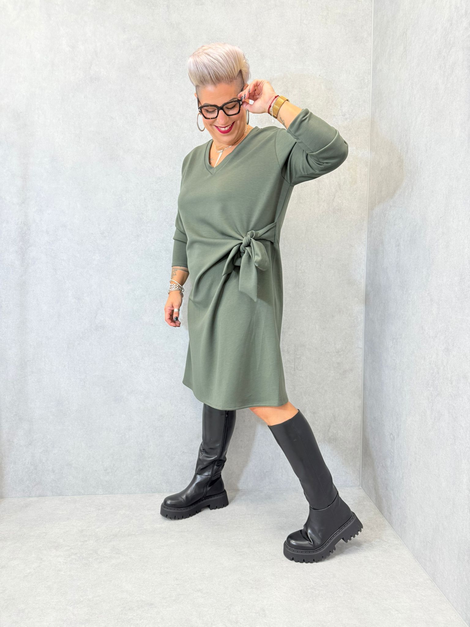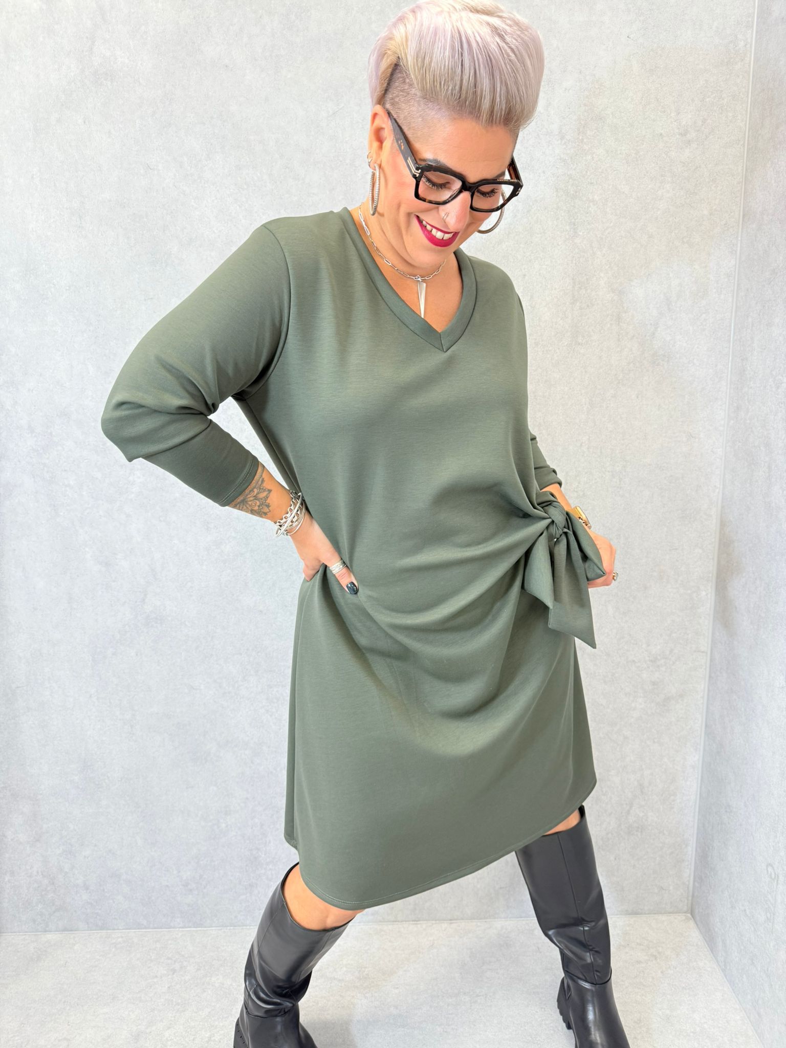 Robe droite, avec nœud sur un côté, à adapter suivant la morphologie, encolure en V, matière sweat