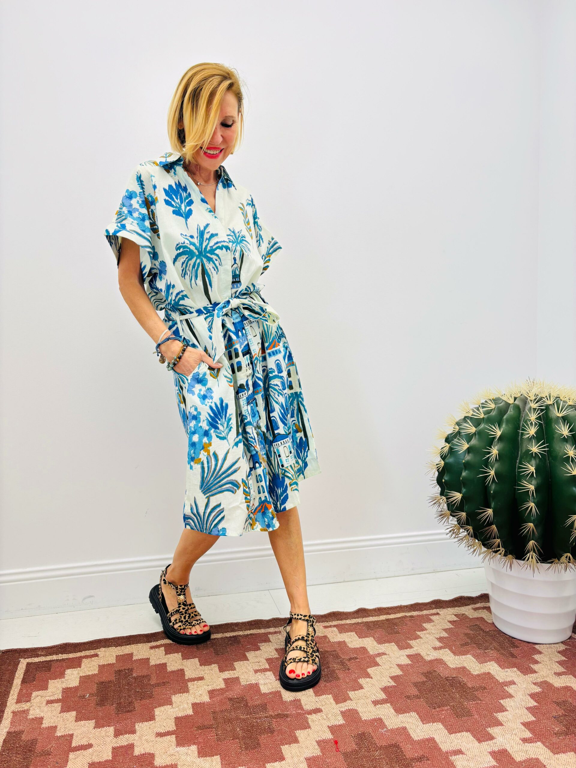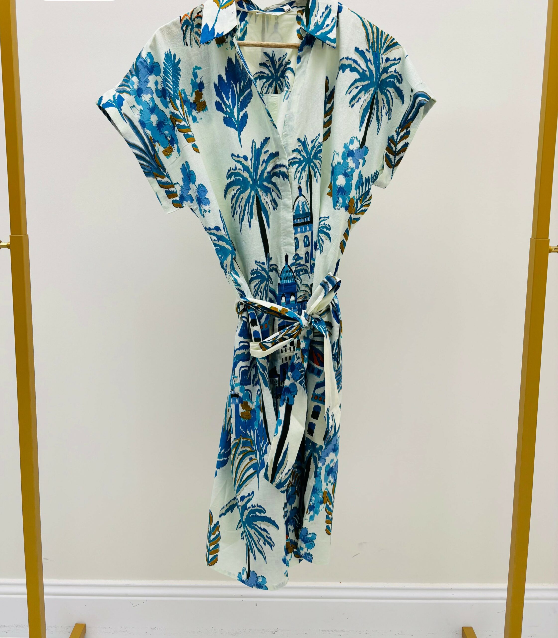 Robe courte, toute boutonnée, col, manches courtes, poches, avec ceinture
