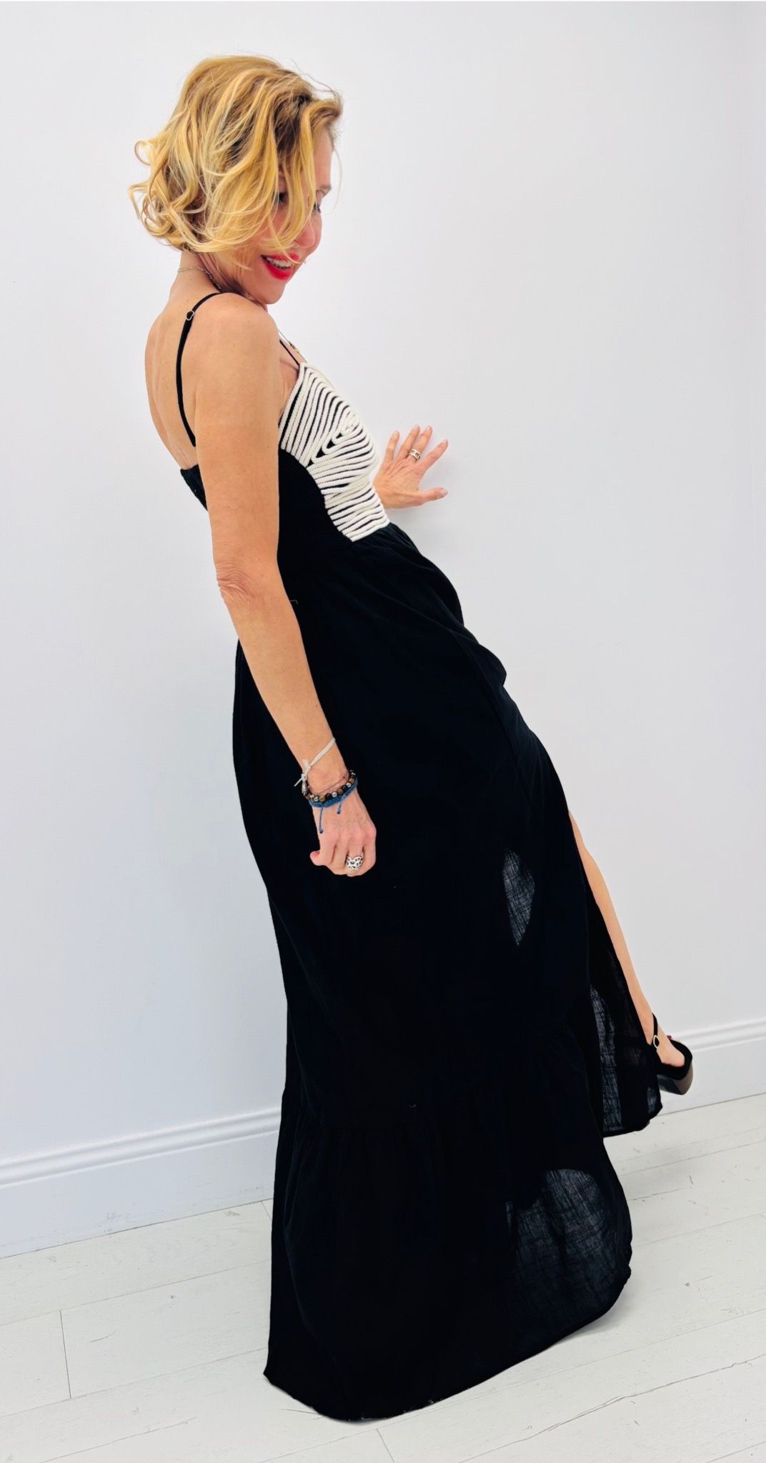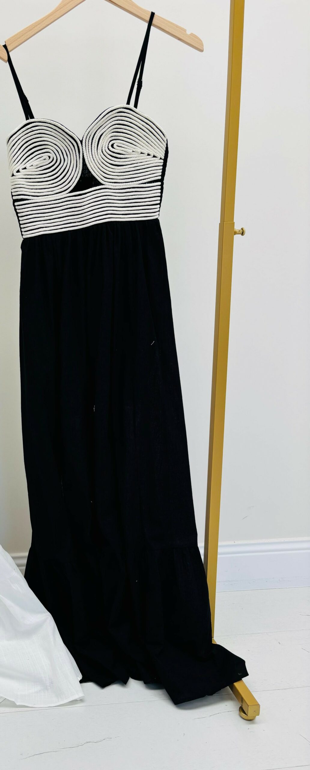 Robe longue noire avec « corde » au niveau du buste, bretelles réglables, smocks au dos, fente sur un côté, doublé