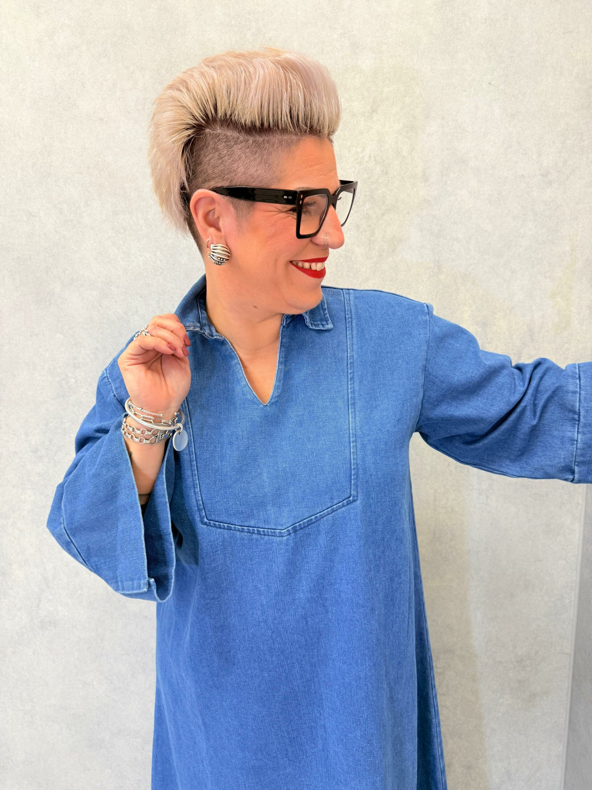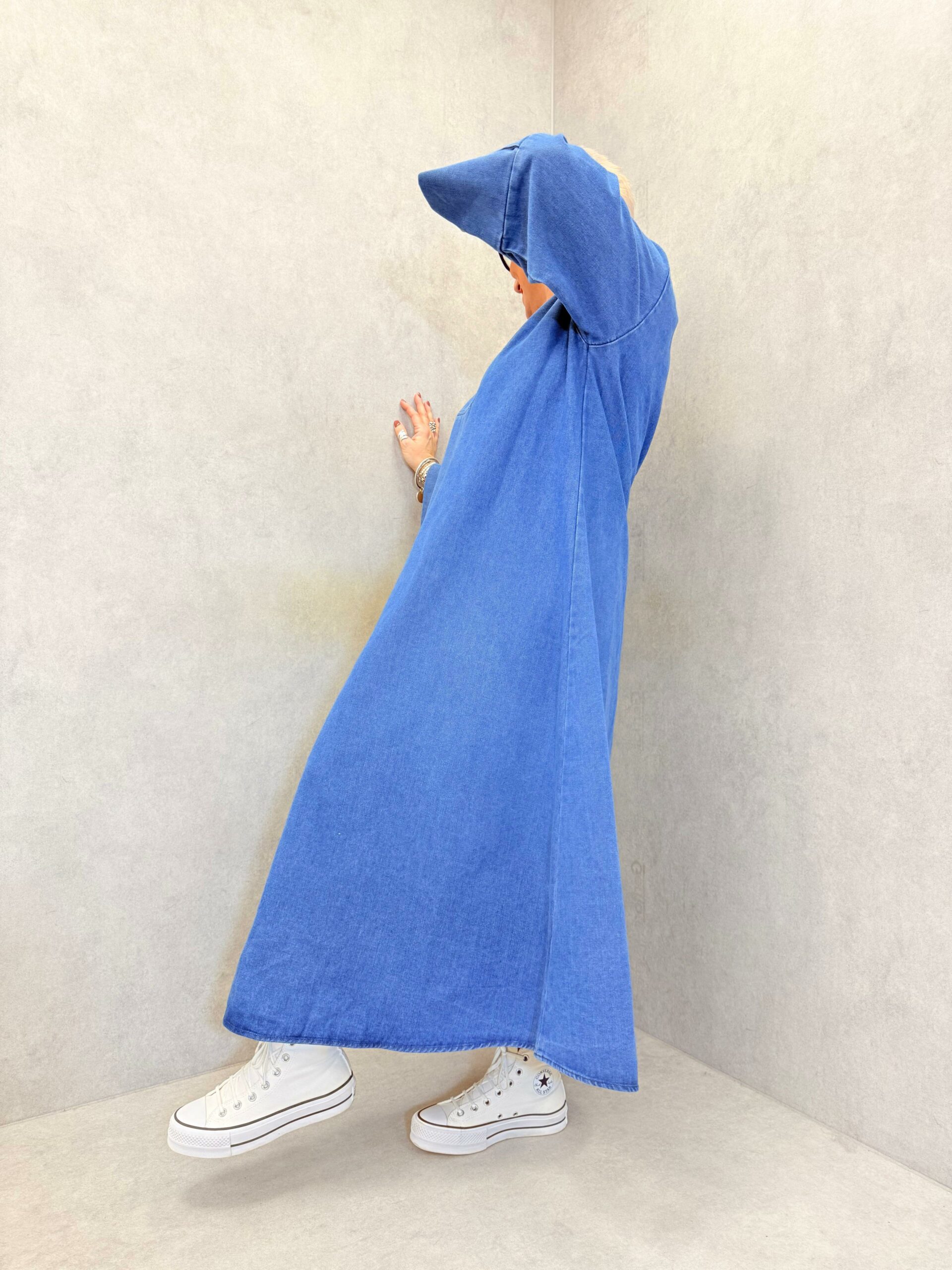 Robe en jeans épais, avec col chemise ouvert, encolure en V, très belle tenue, manches longues