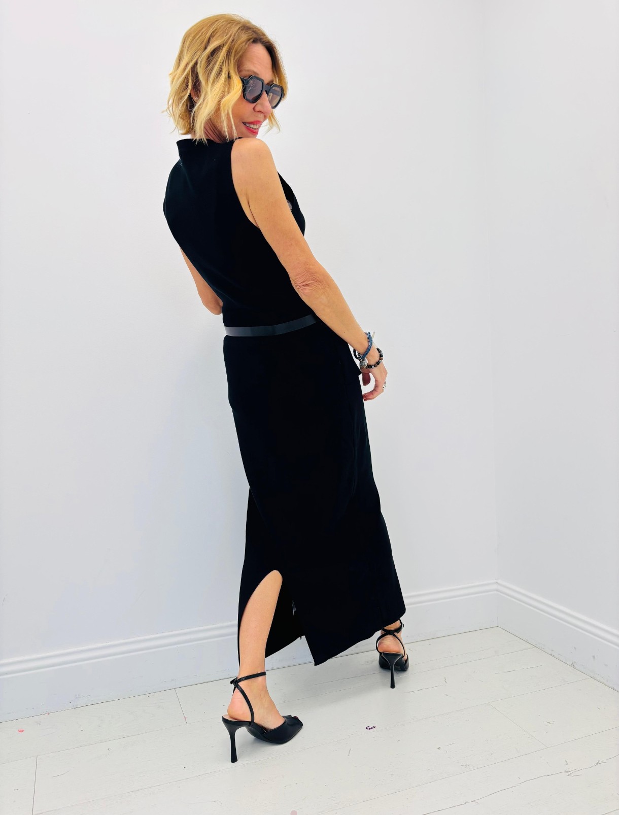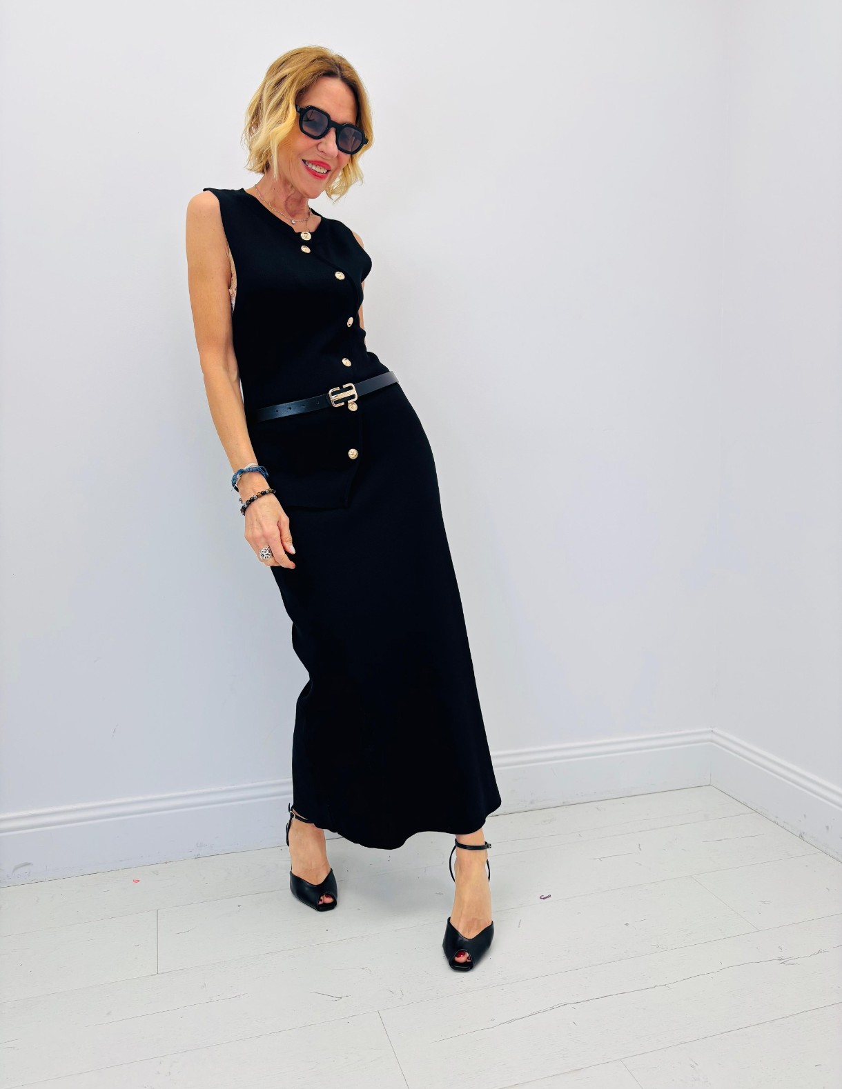 Robe noire assez près du corps avec de jolis boutons dorés, sans manches, ceinture, légère fente au dos