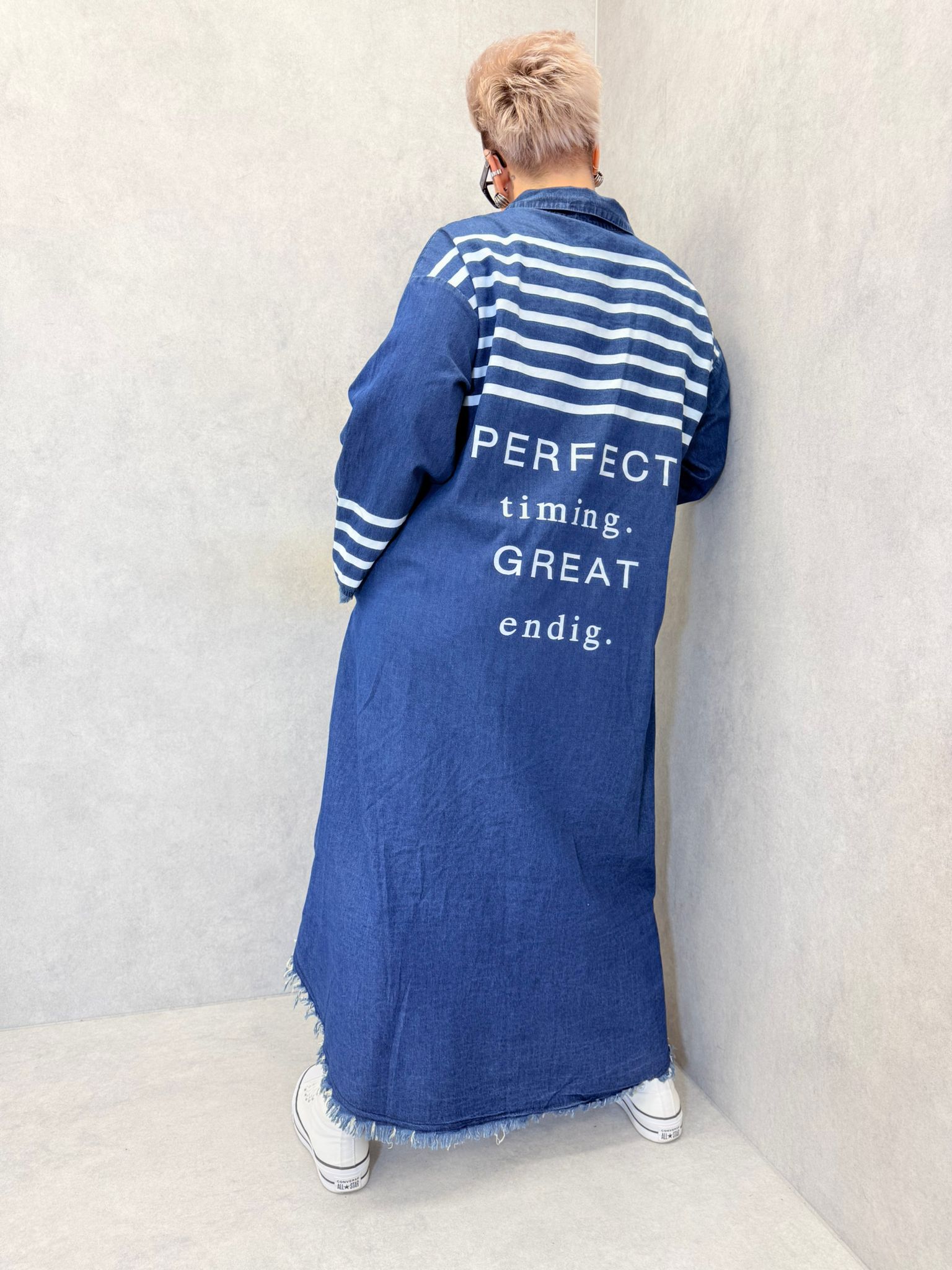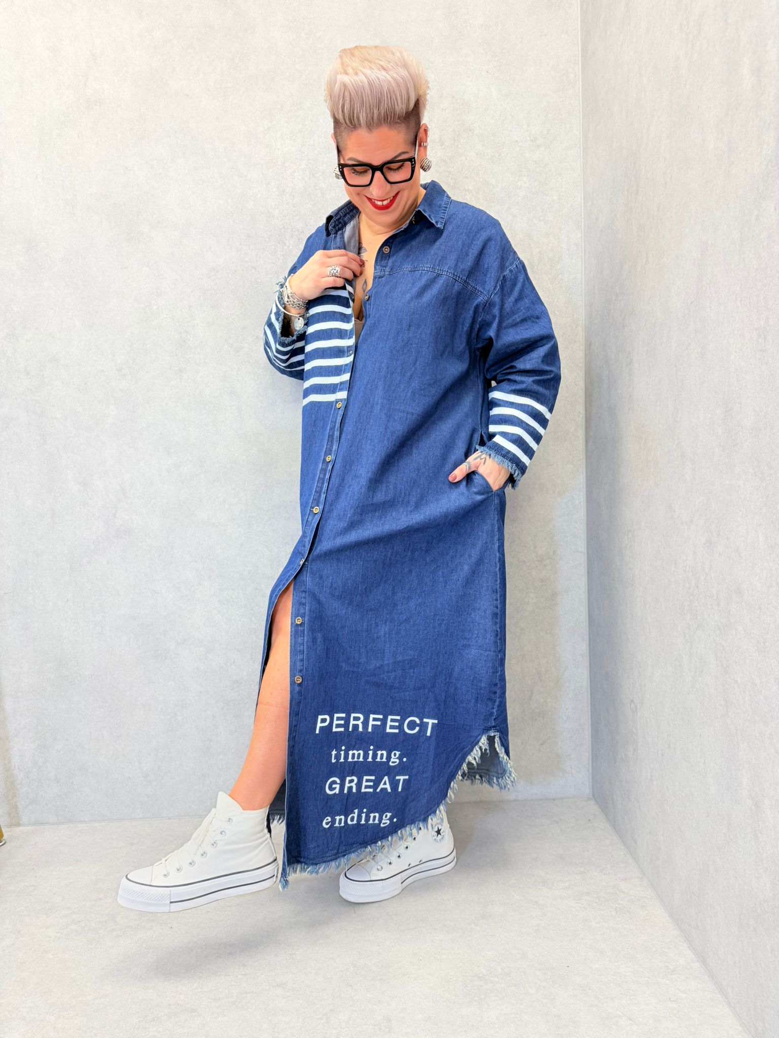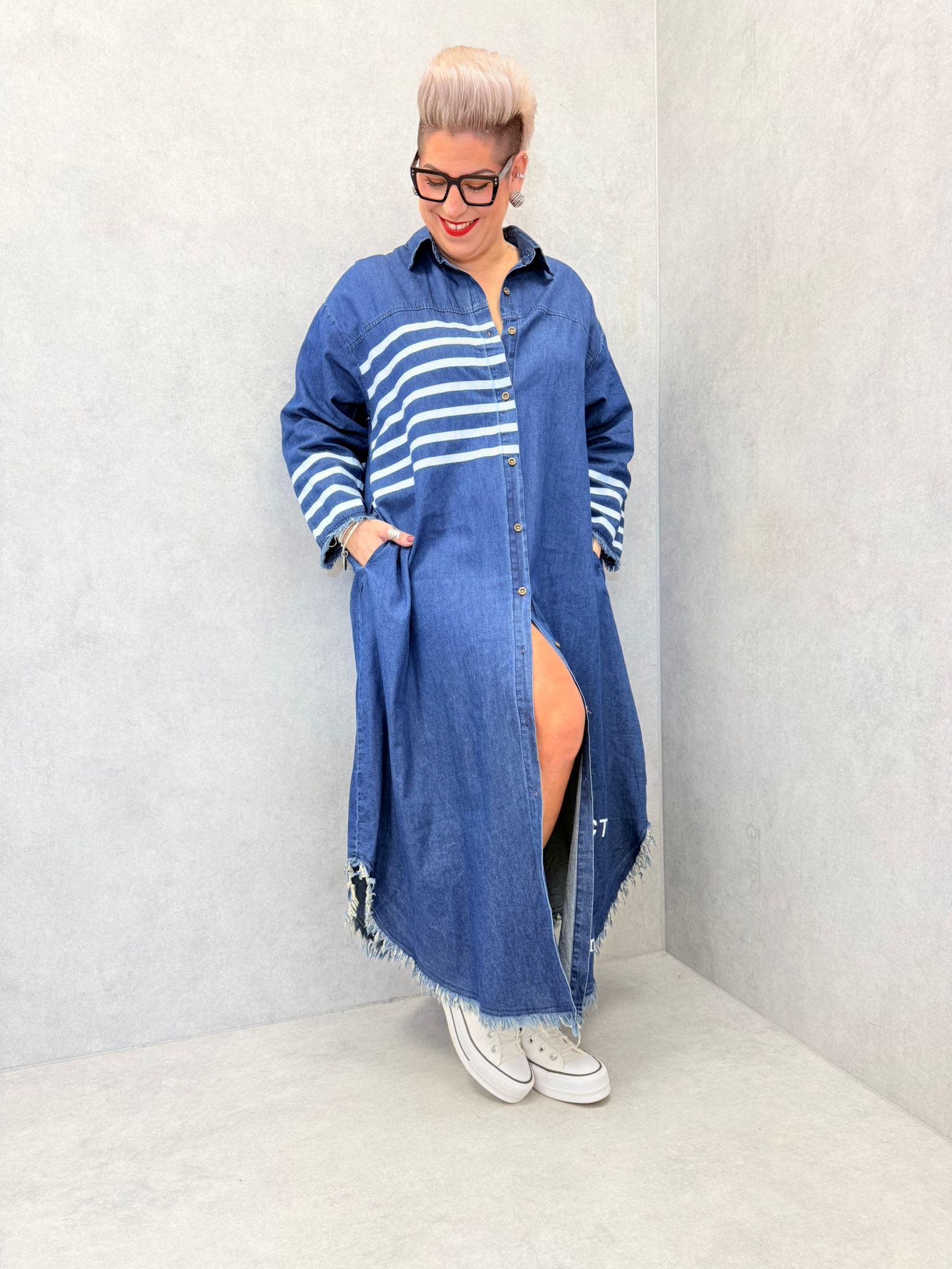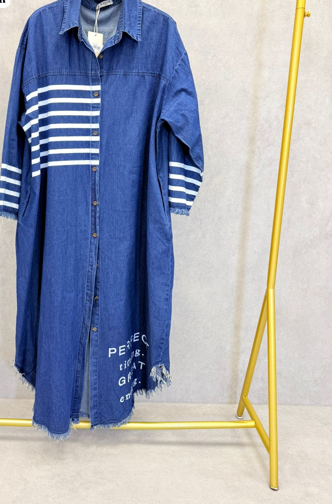 Robe bleu jeans avec des écritures et des rayures, au dos aussi, boutonnée, poches, bas de la robe légèrement frangé