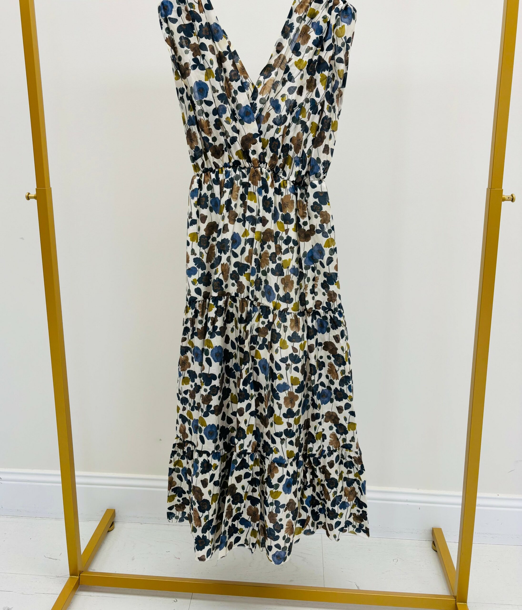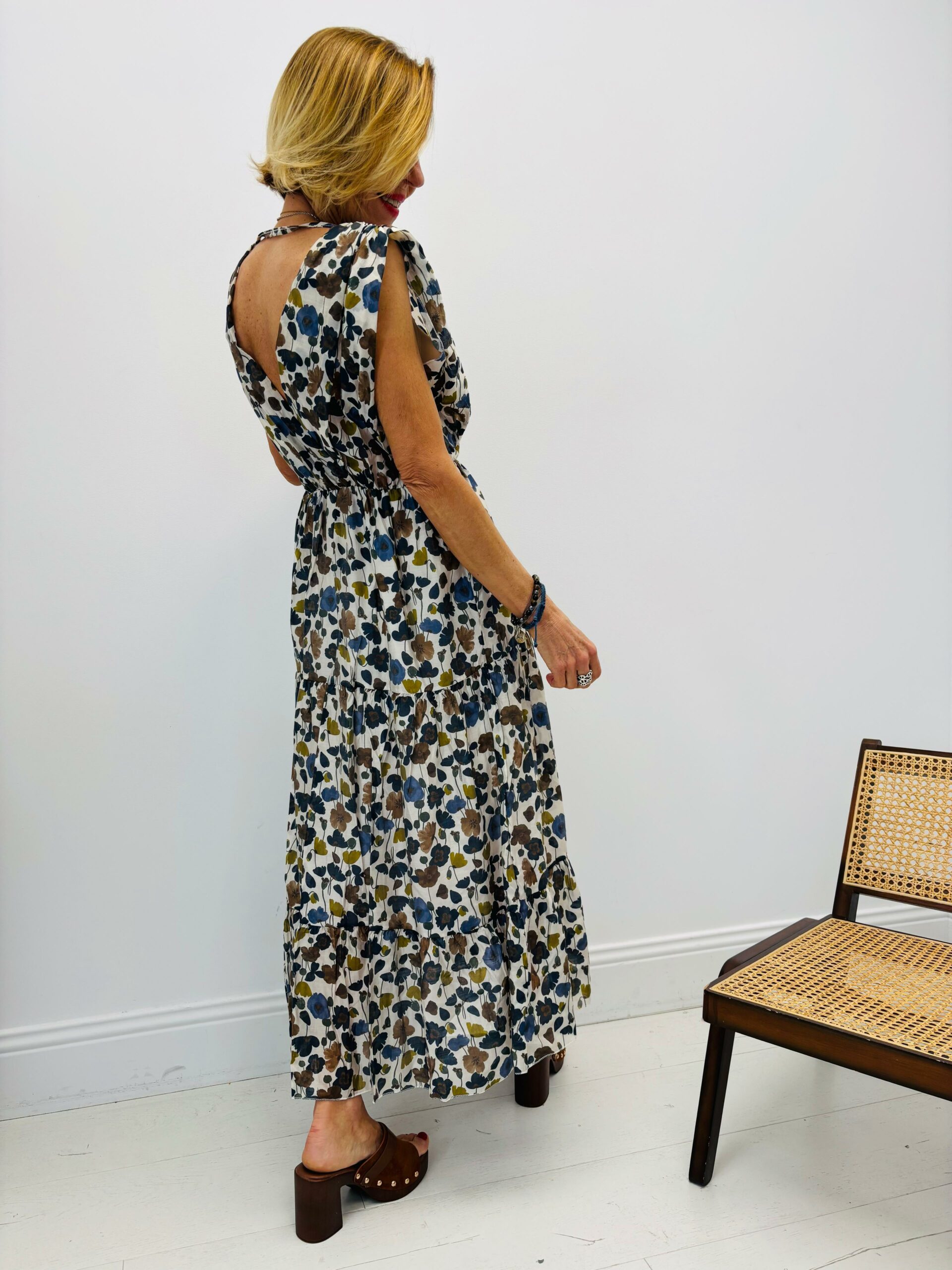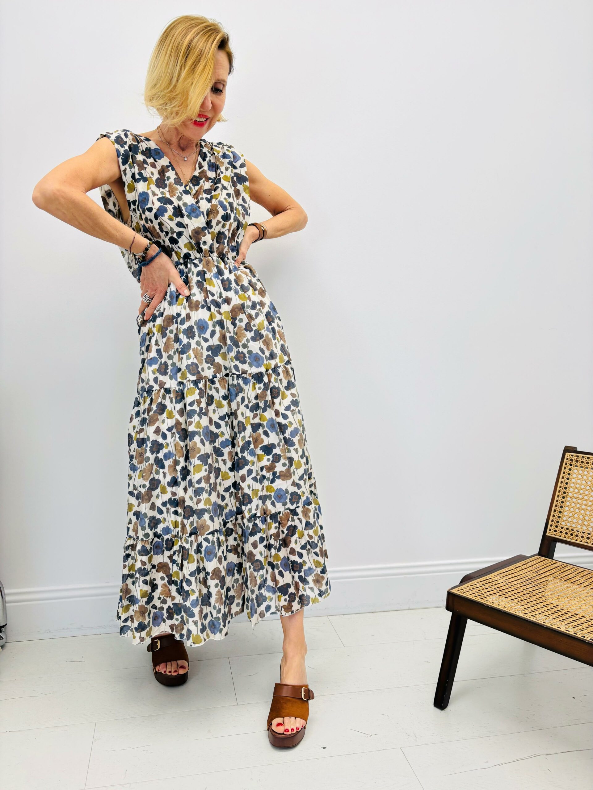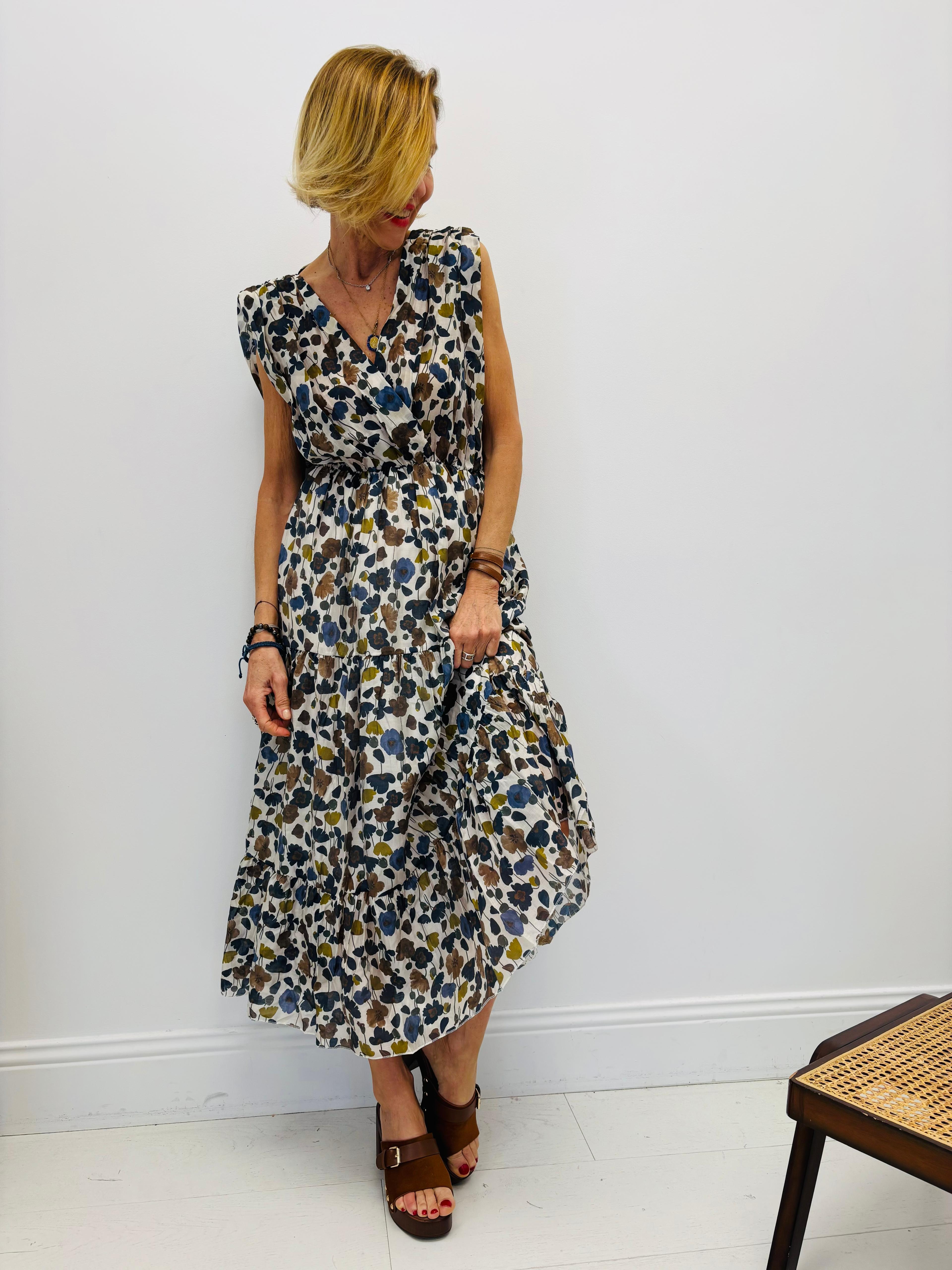 Robe longue avec des fleurs, sans manches, taille légèrement élastique, doublée