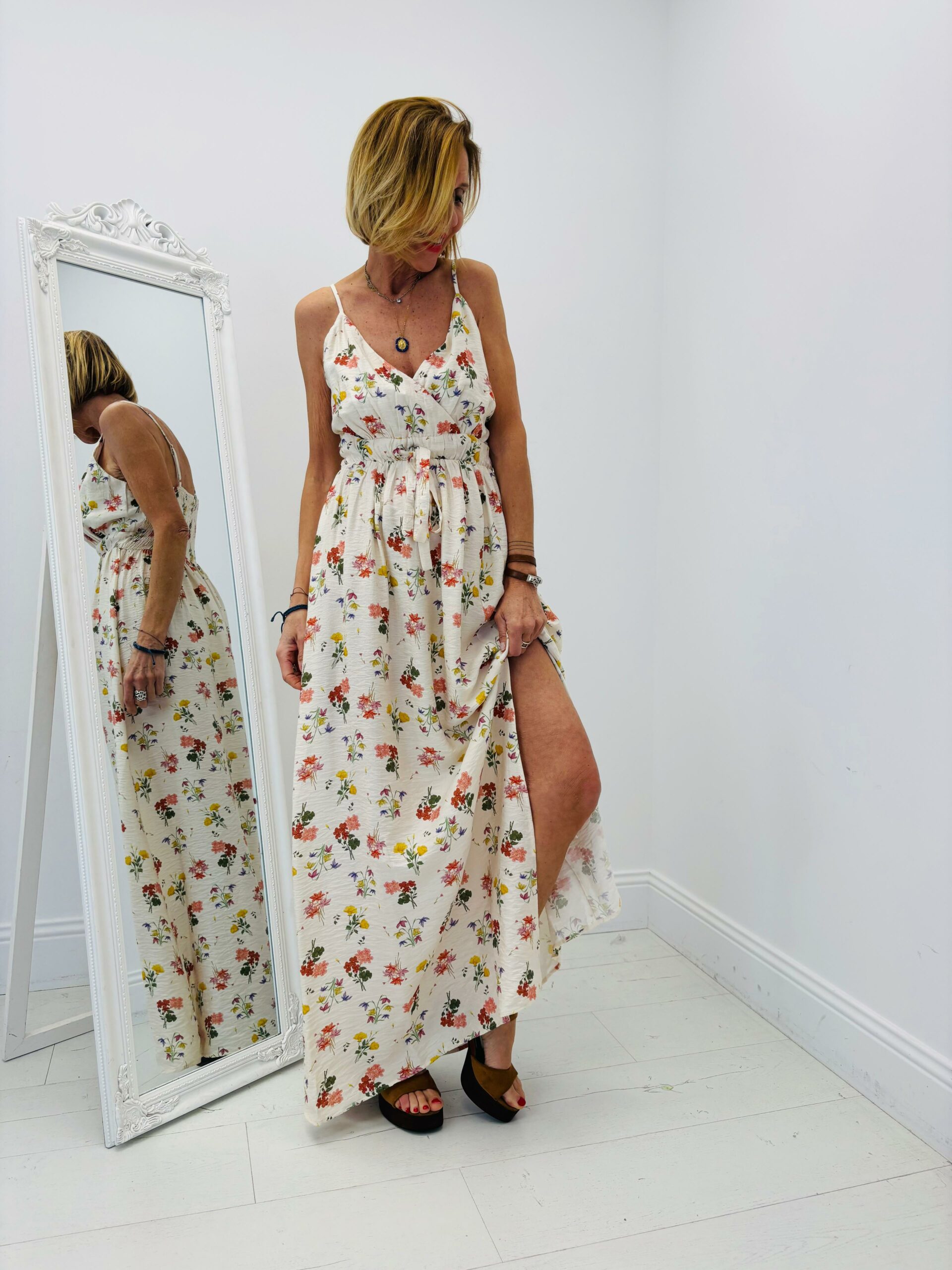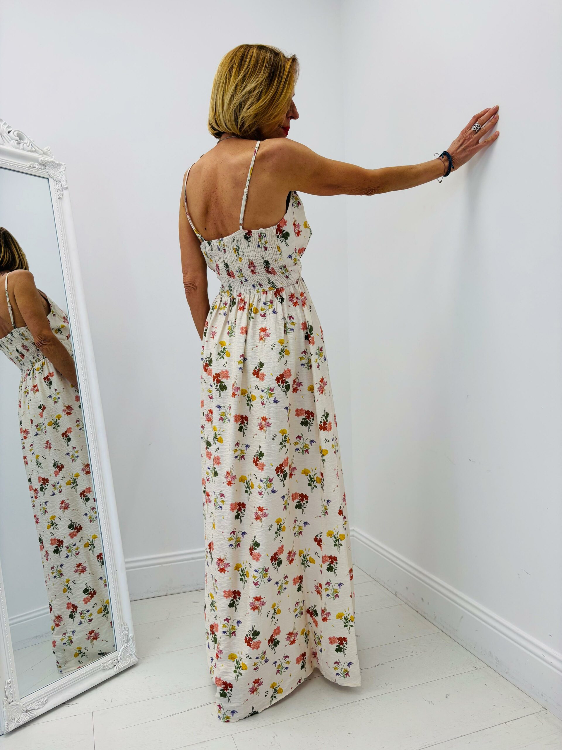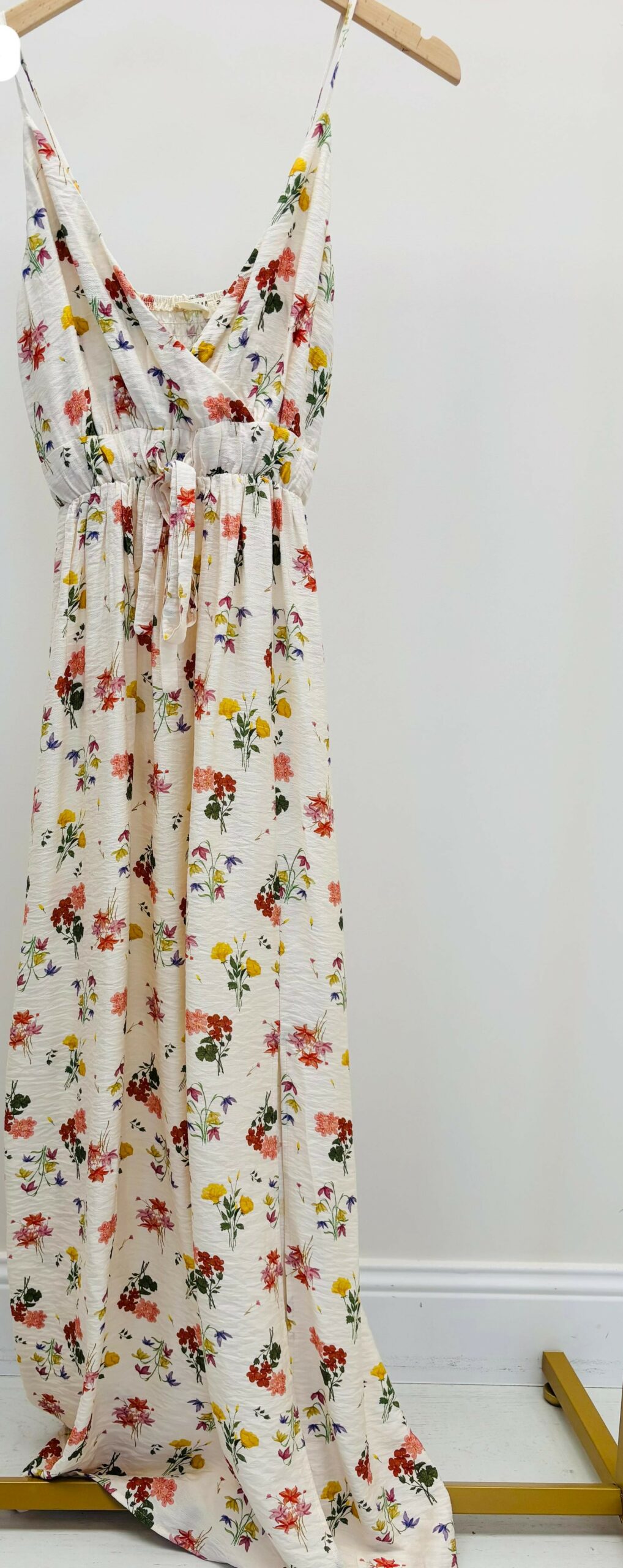 Robe écru avec des petites fleurs, à bretelles réglables, smocks au dos, légèrement fendue devant