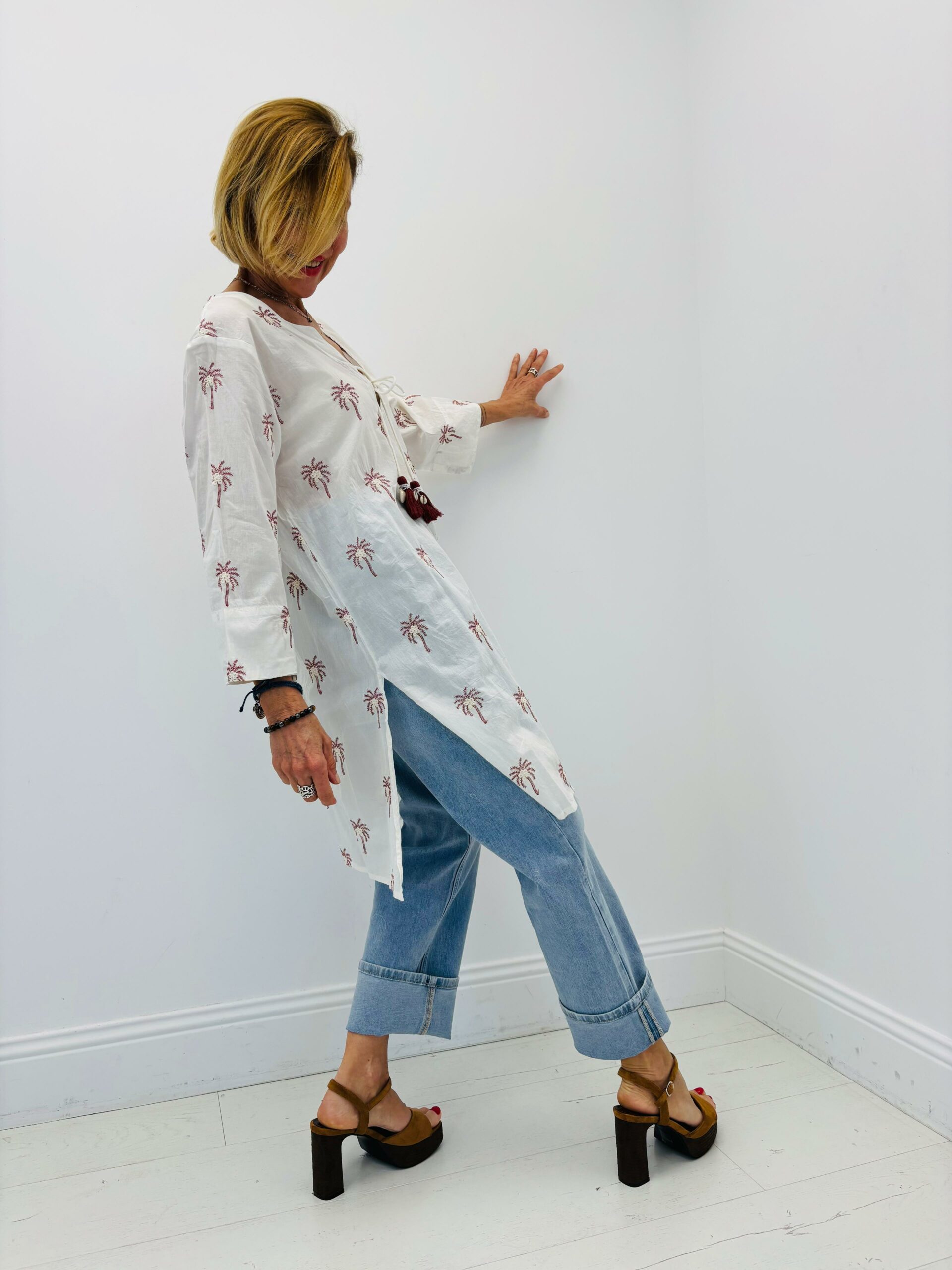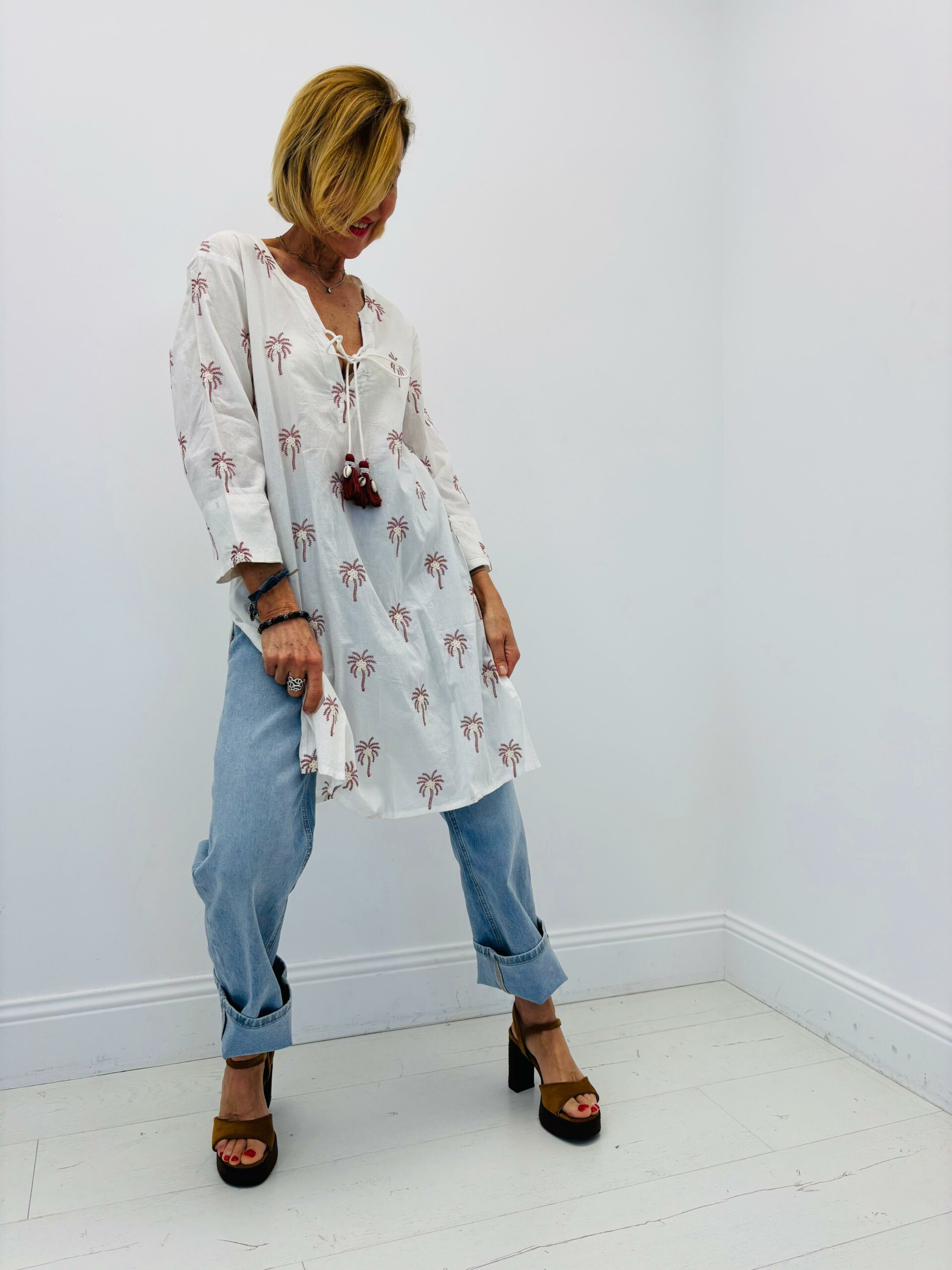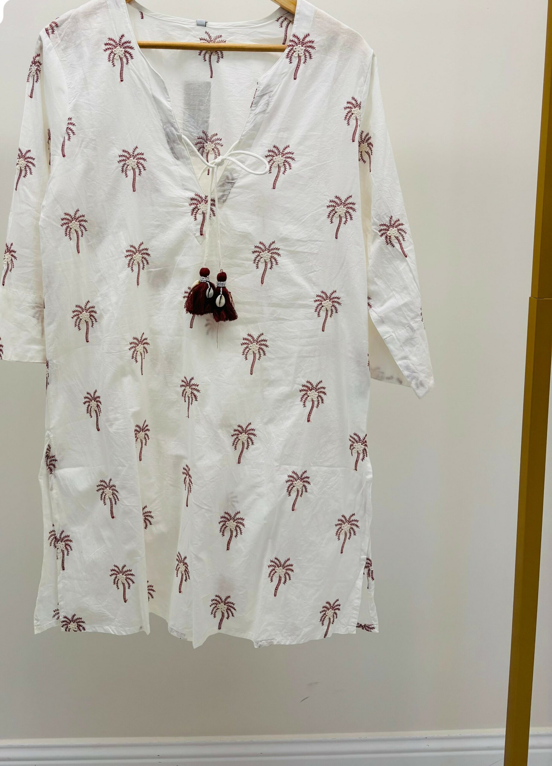 Robe/tunique blanche avec palmiers, cordon pompons et coquillages, fentes sur chaque côté