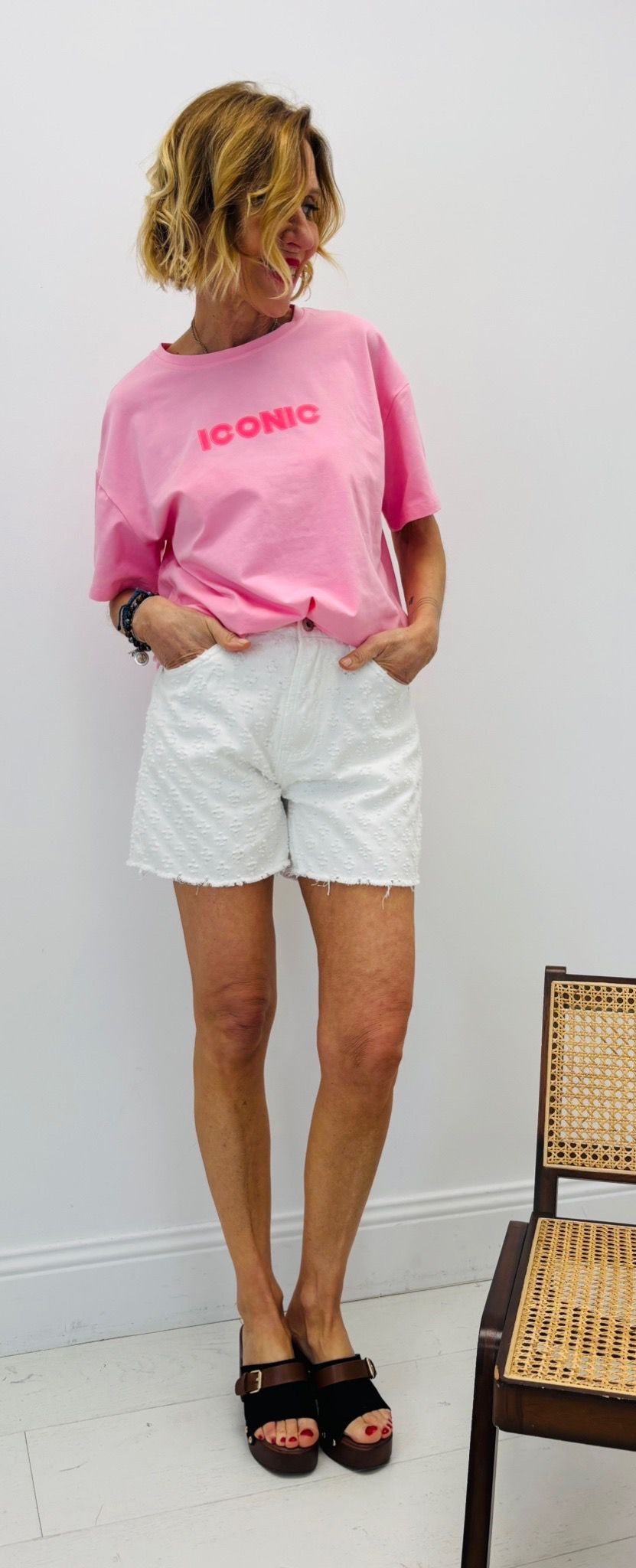 Short blanc brodé, coupe ajustée, dans le bas légèrement effiloché, bouton et fermeture éclair, poches