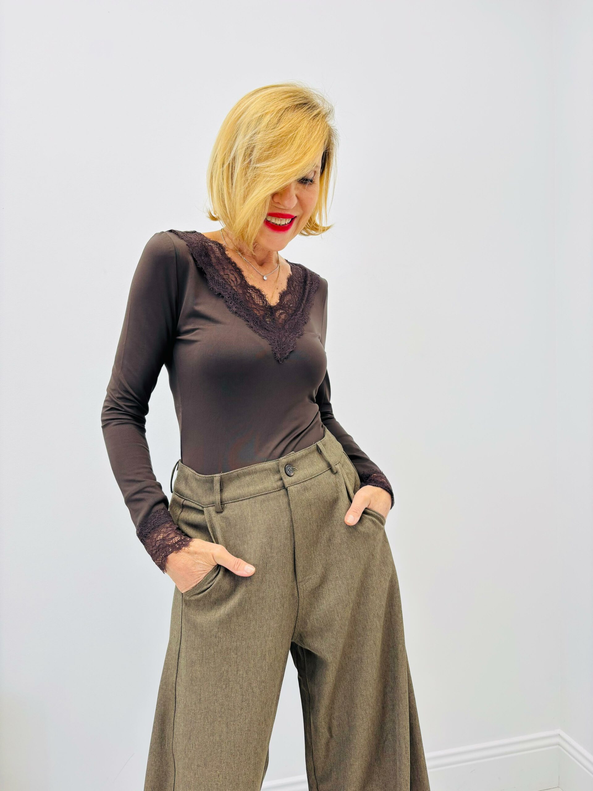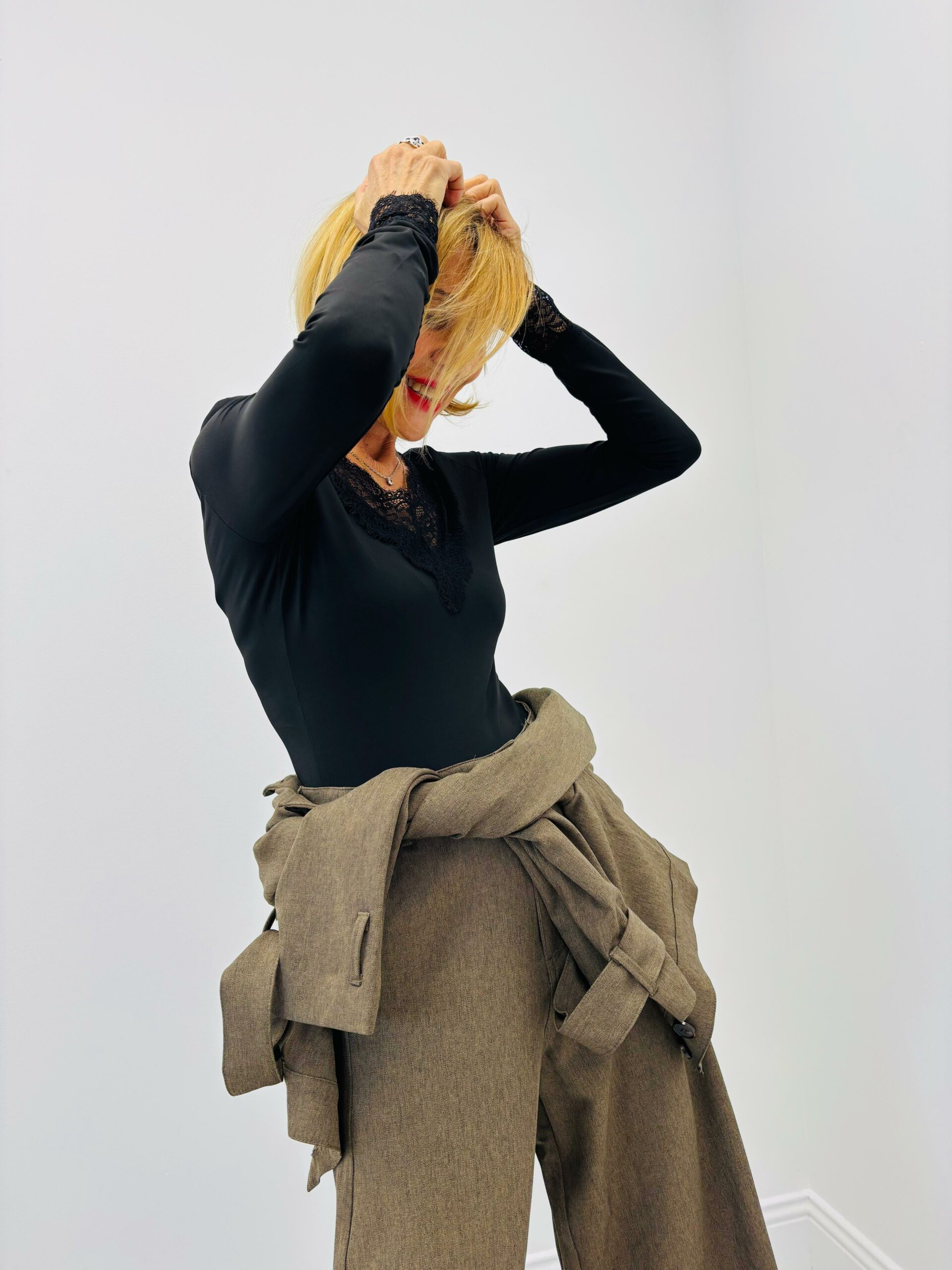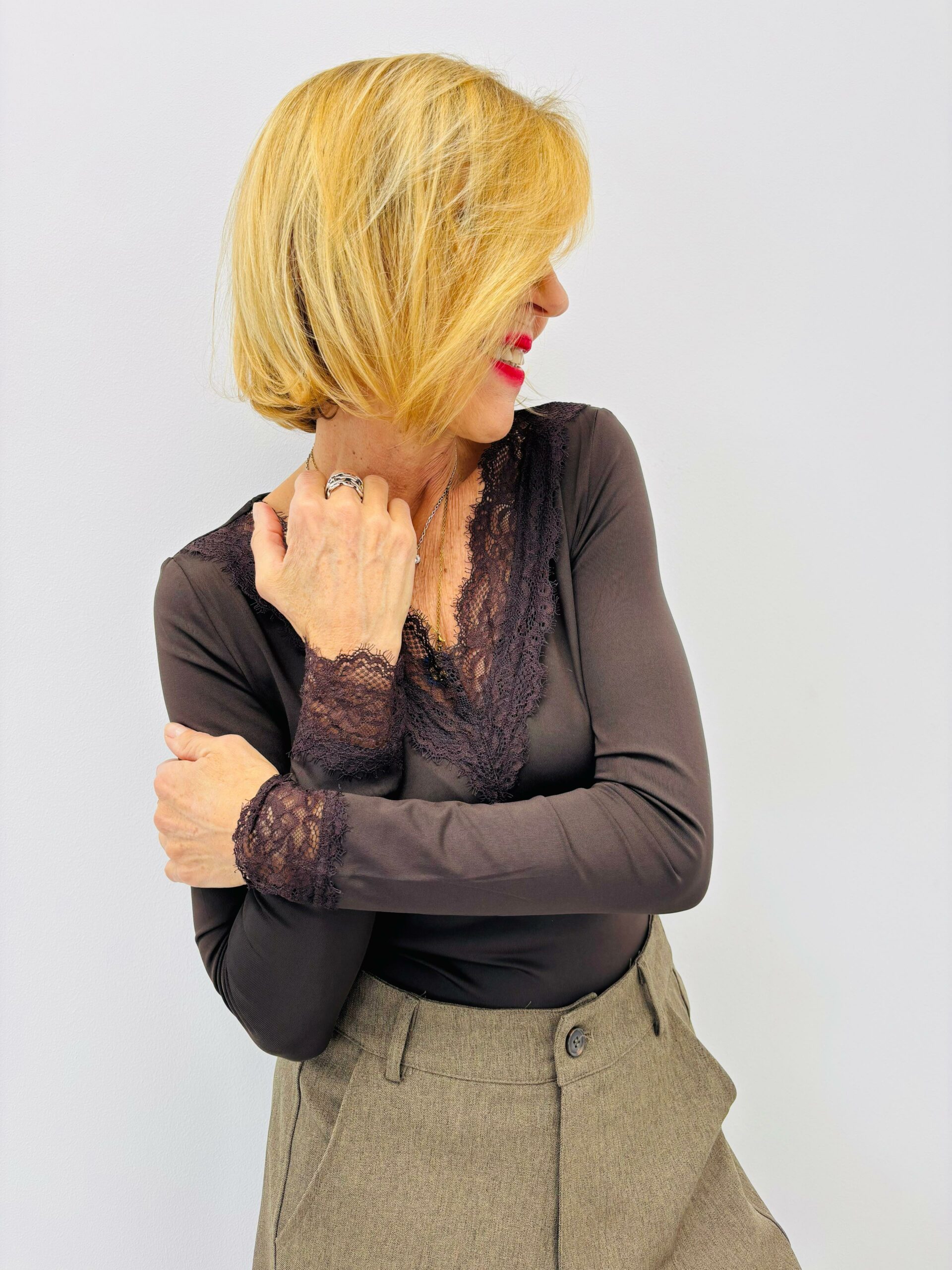 Top près du corps, encolure et bas des manches en dentelle, col en V