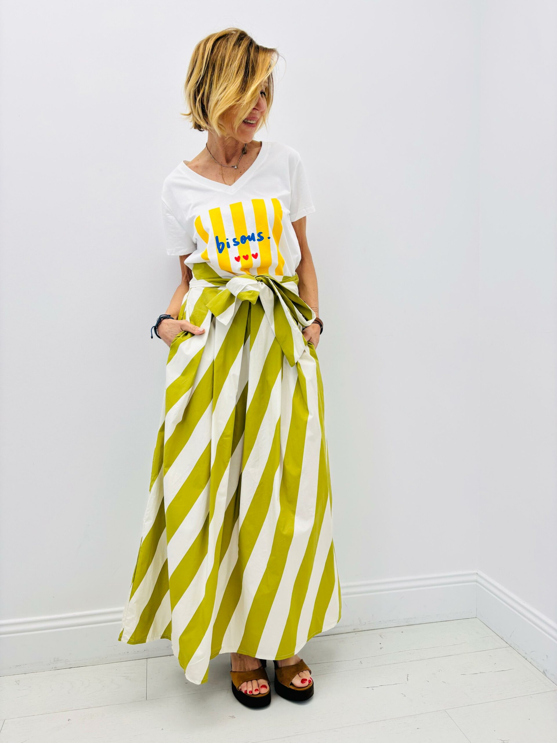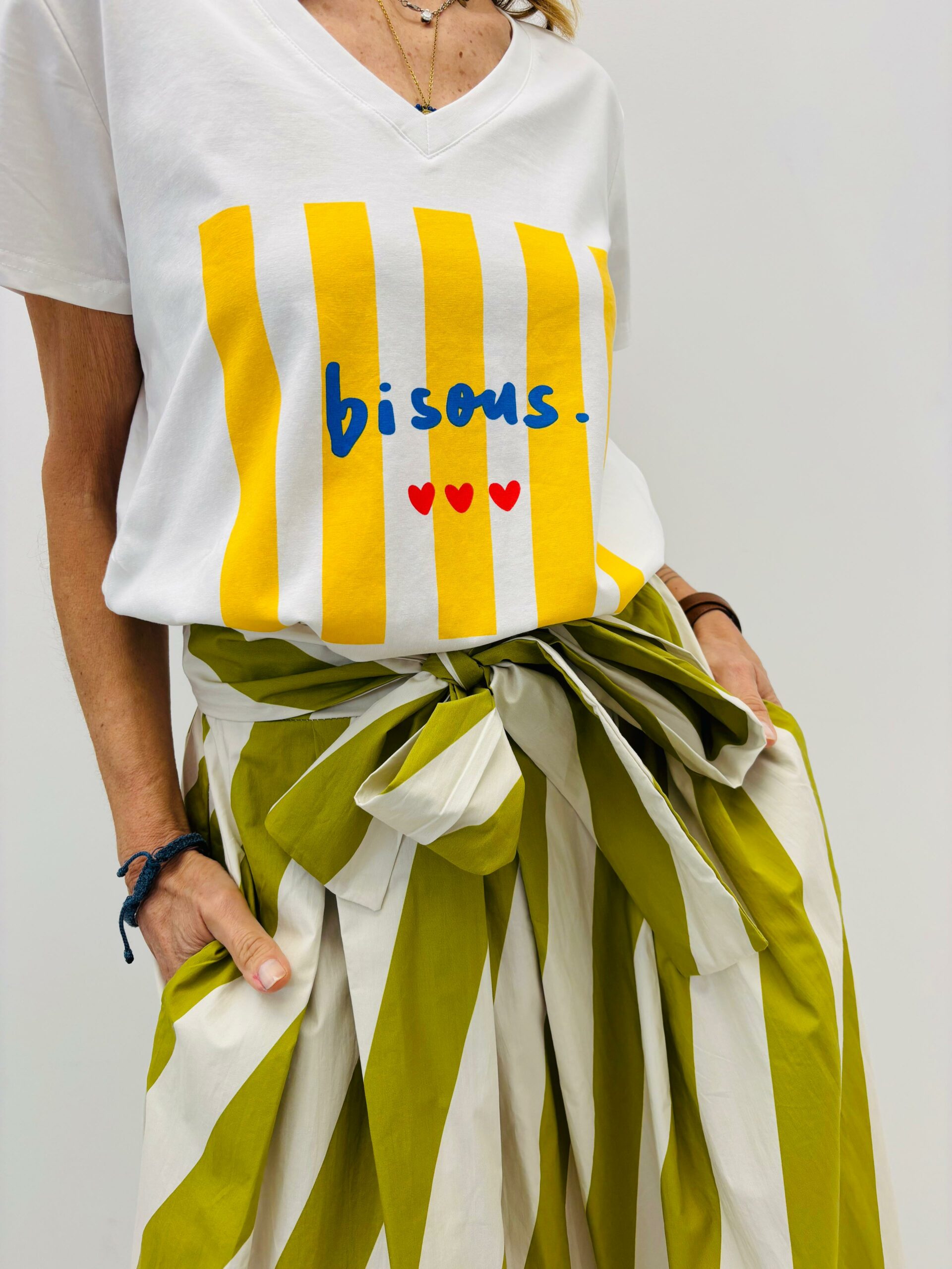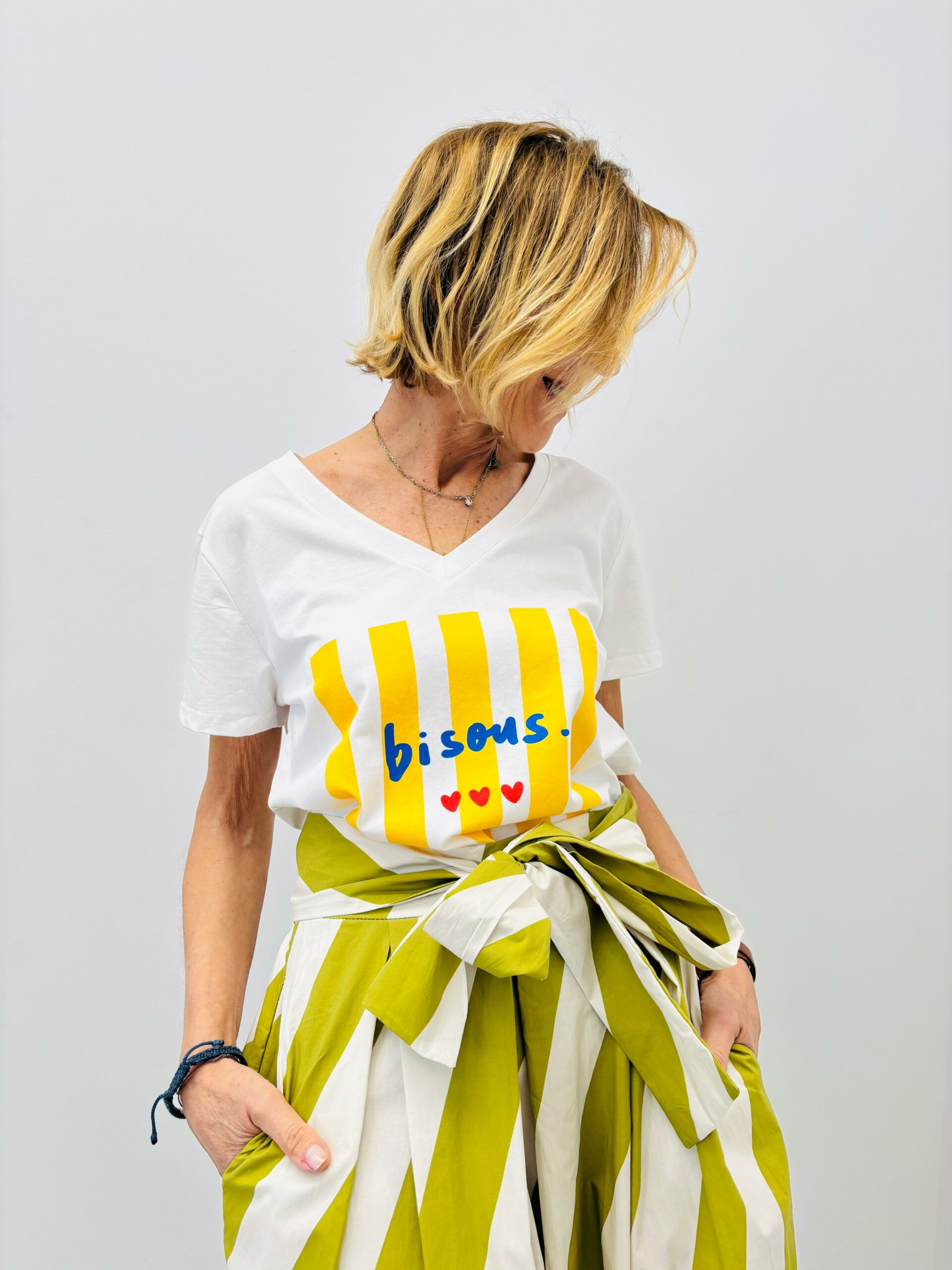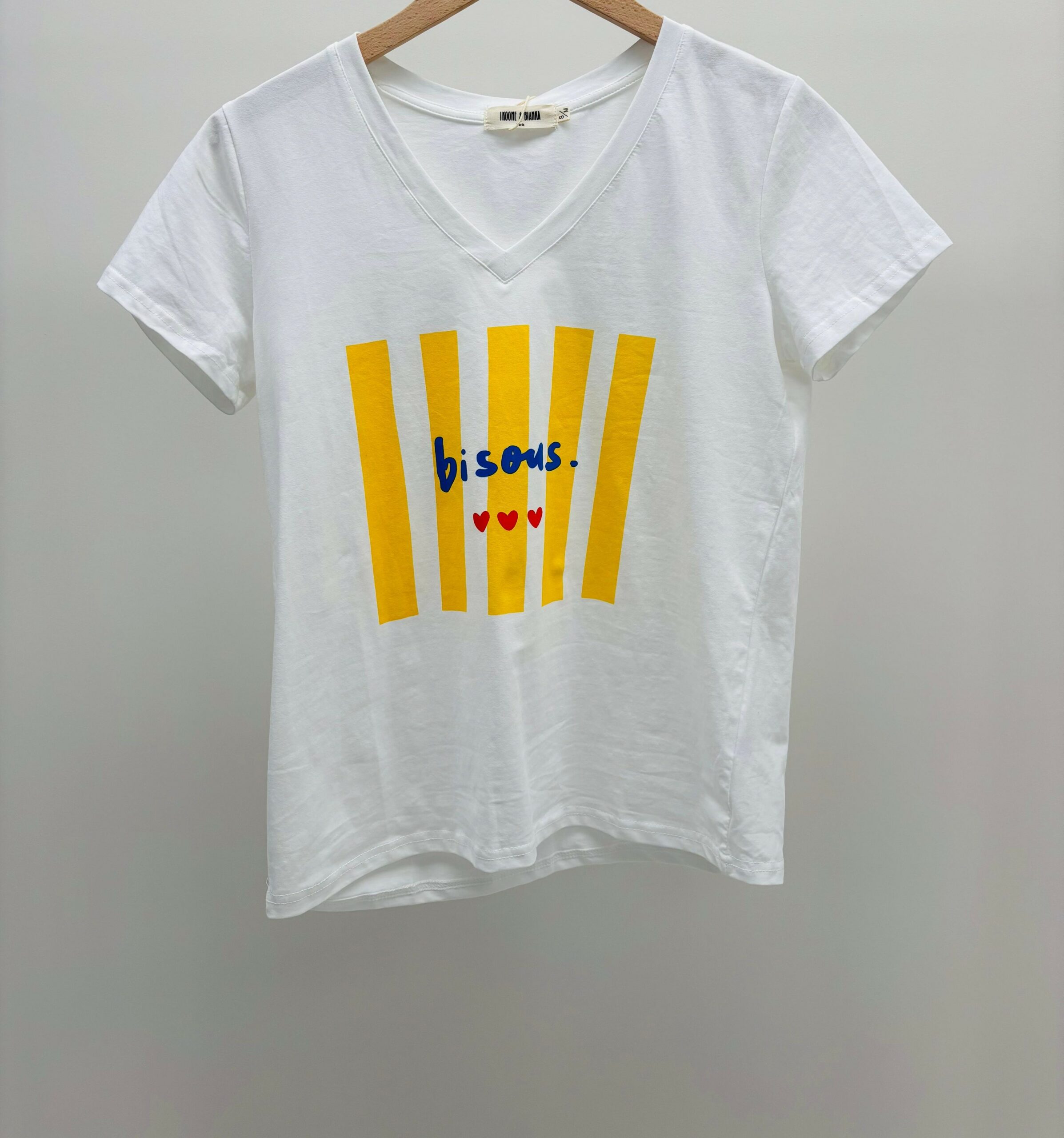Tshirt blanc avec rayures jaunes et bisous, encolure en V, manches courtes