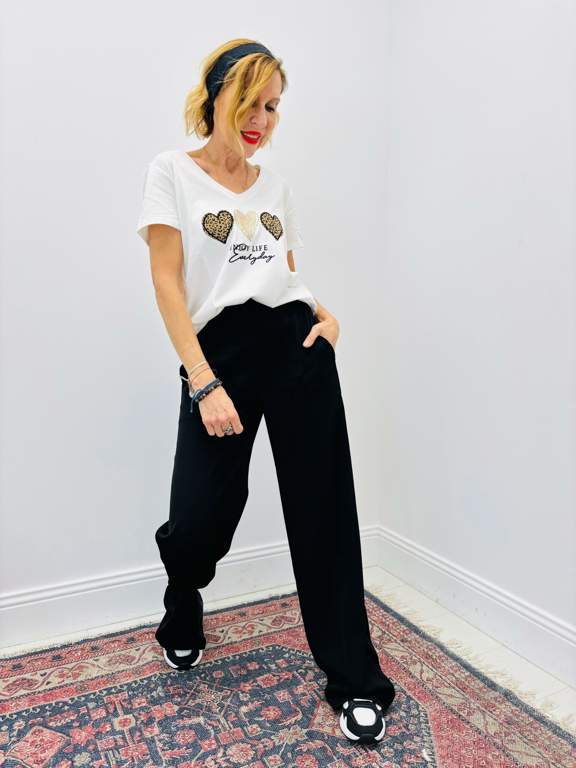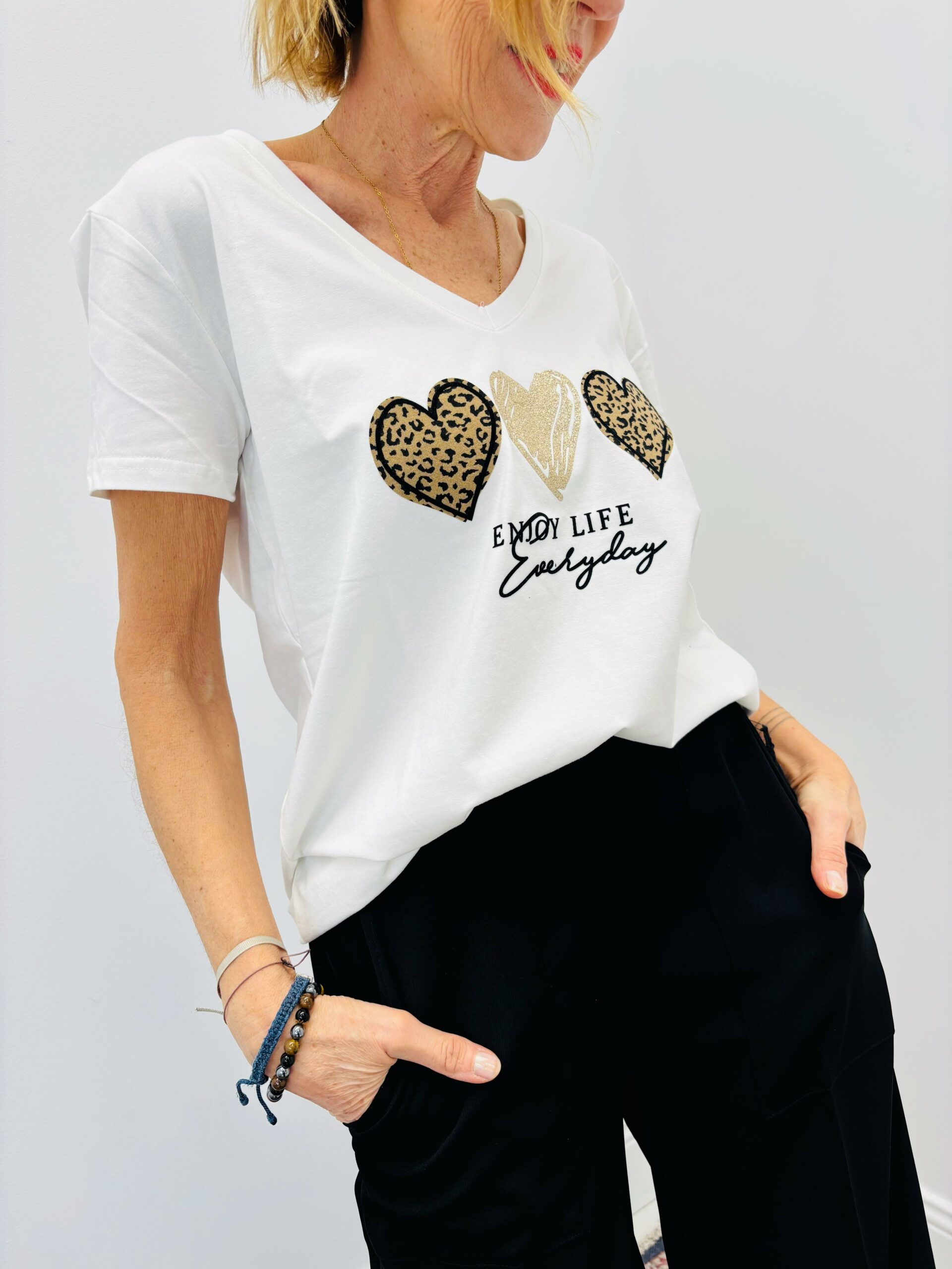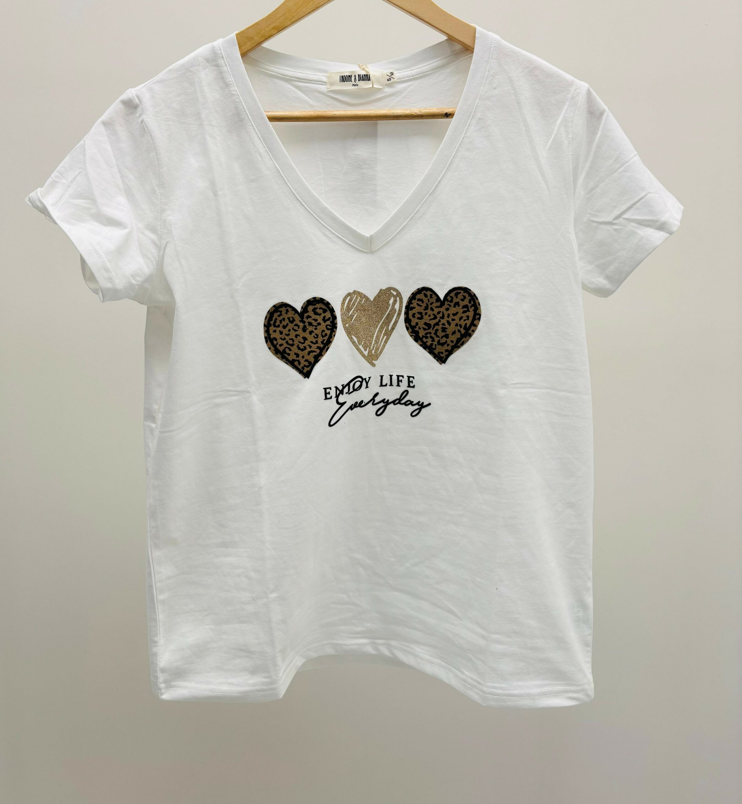 Tshirt blanc avec cœurs dorés, léopard, encolure en V, manches courtes