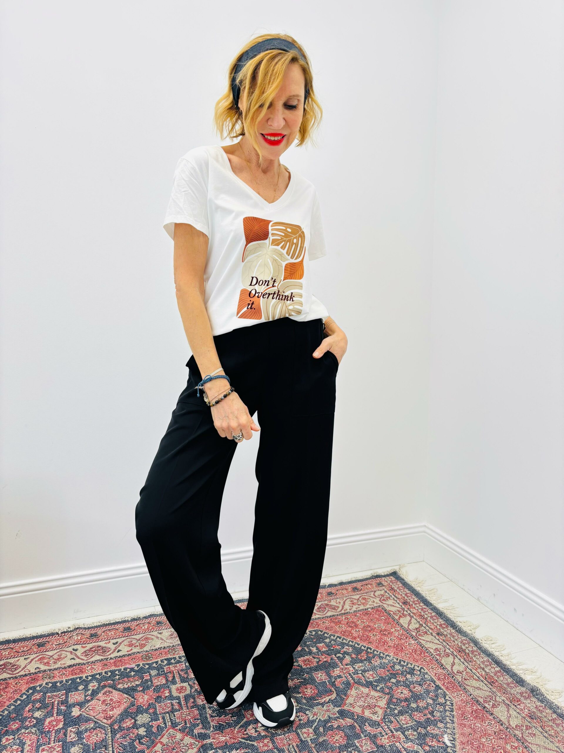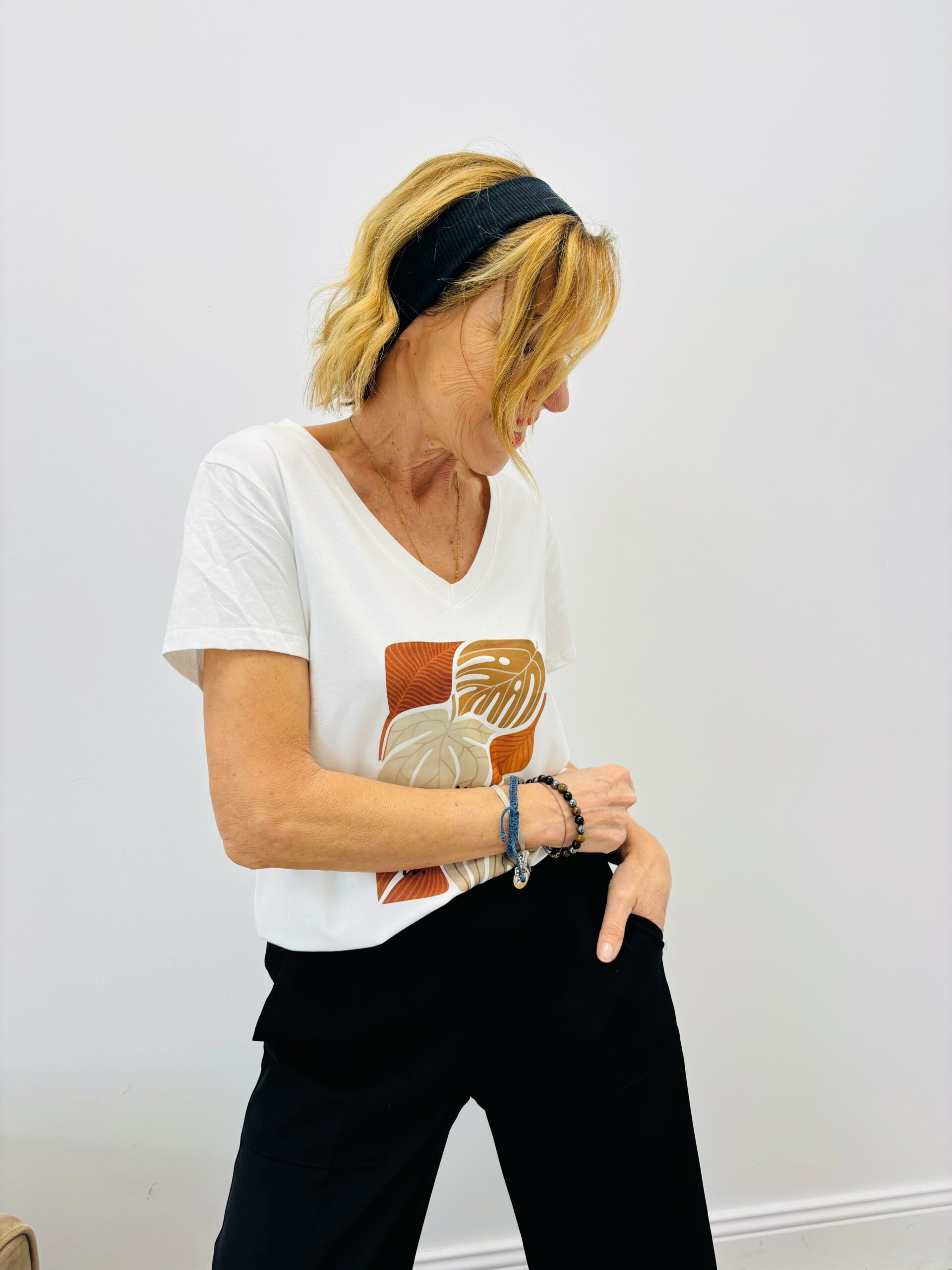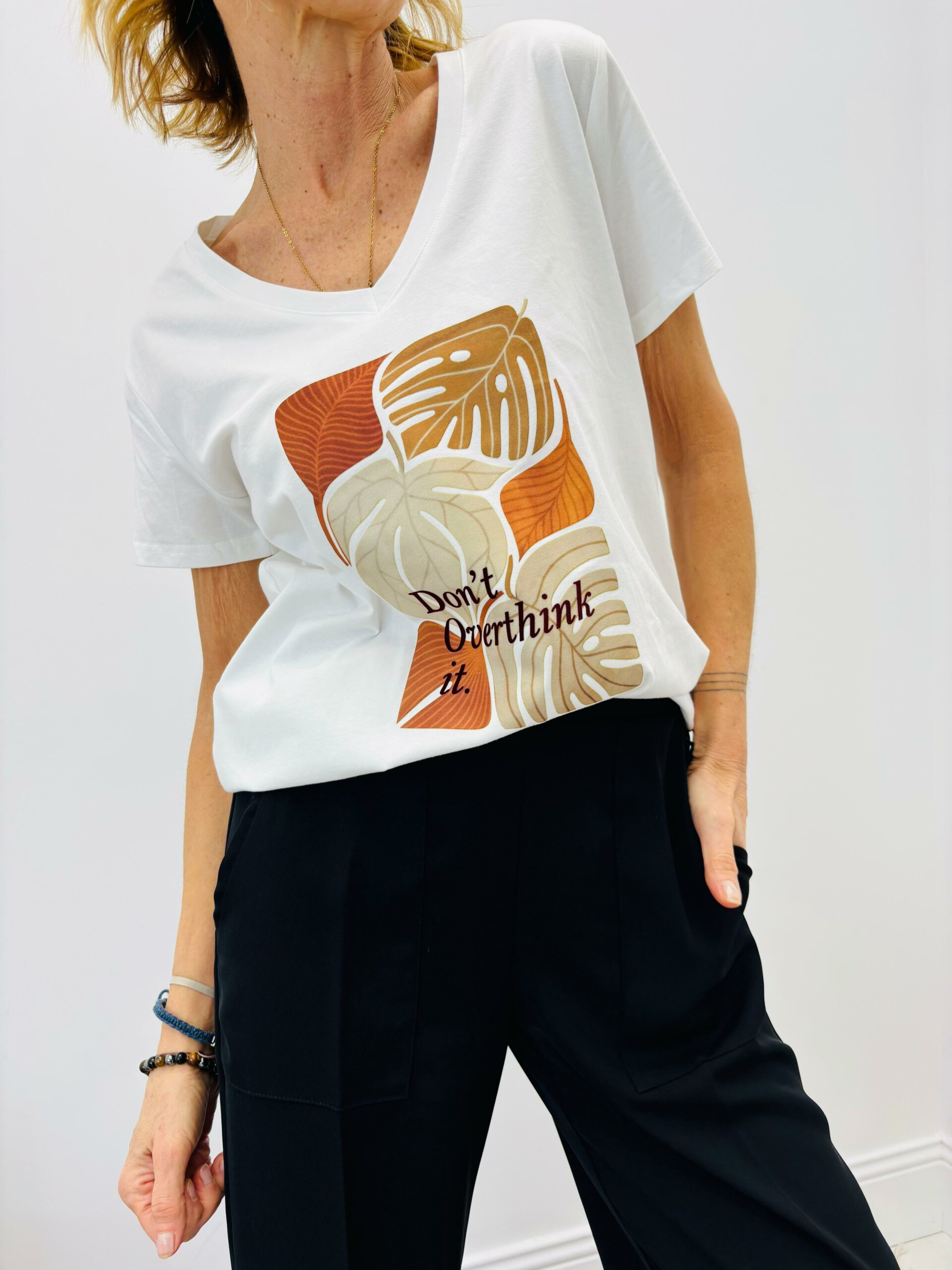 Tshirt blanc avec motifs « feuilles » encolure en V, manches courtes