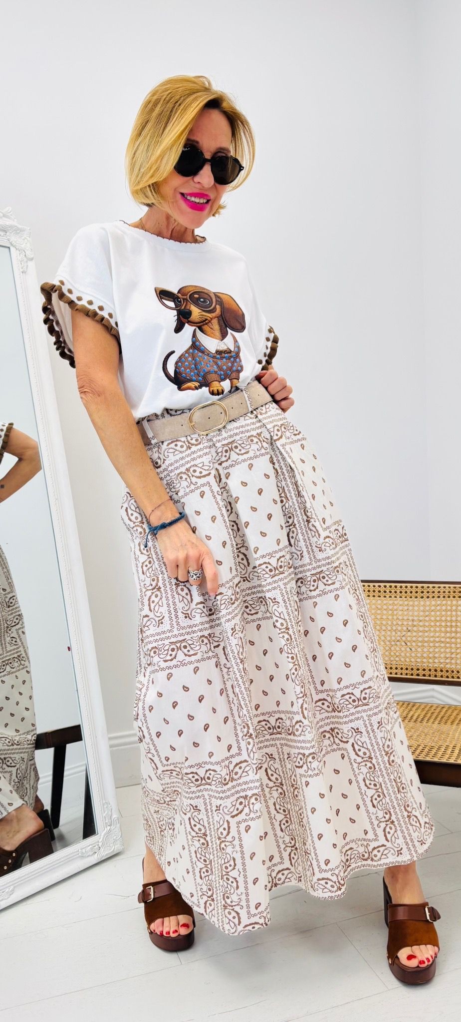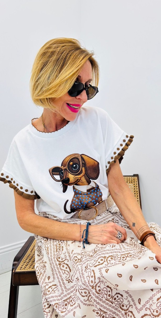 Tshirt blanc au motif teckel à lunettes, encolure ronde