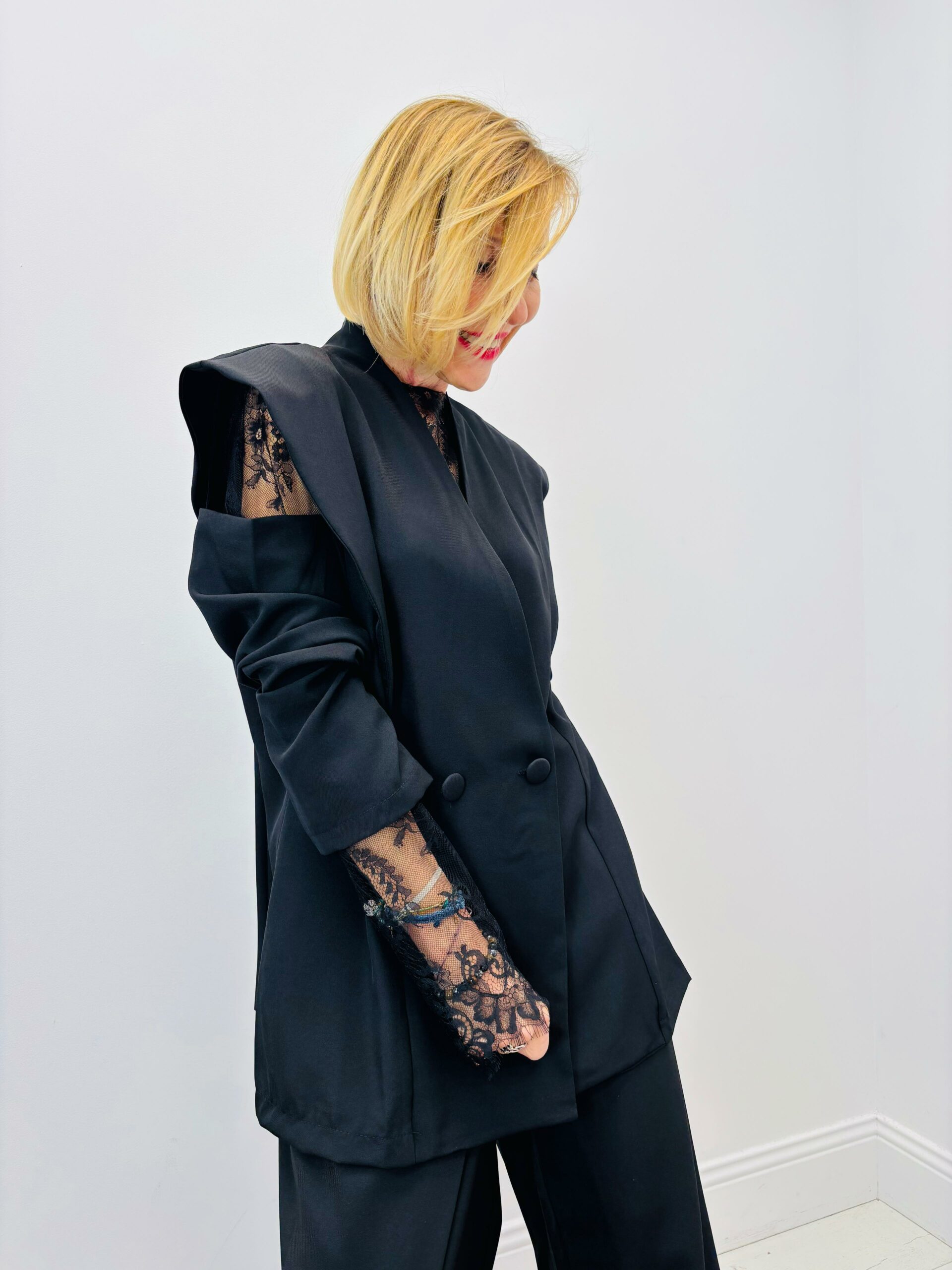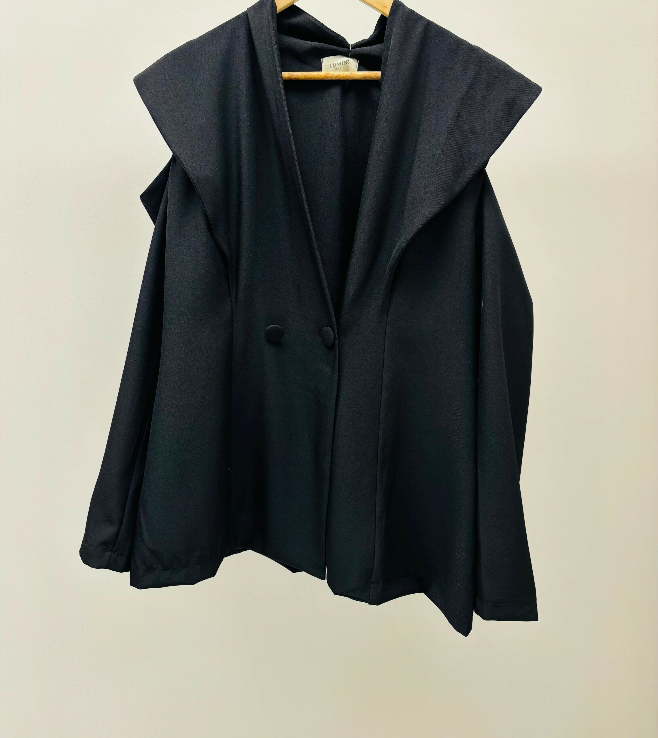 Veste noire, découpe au niveau des épaules, boutons, très tendance, peut se porter avec le pantalon Bonnie