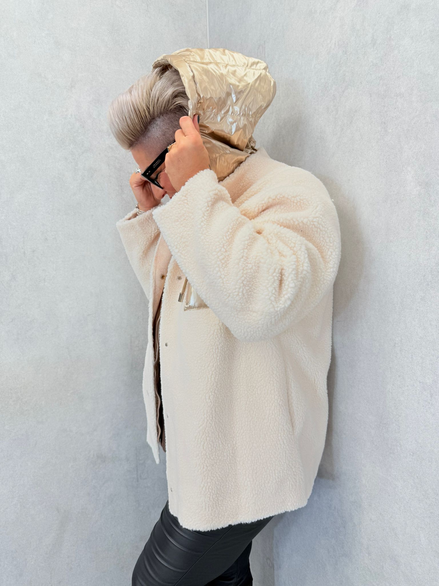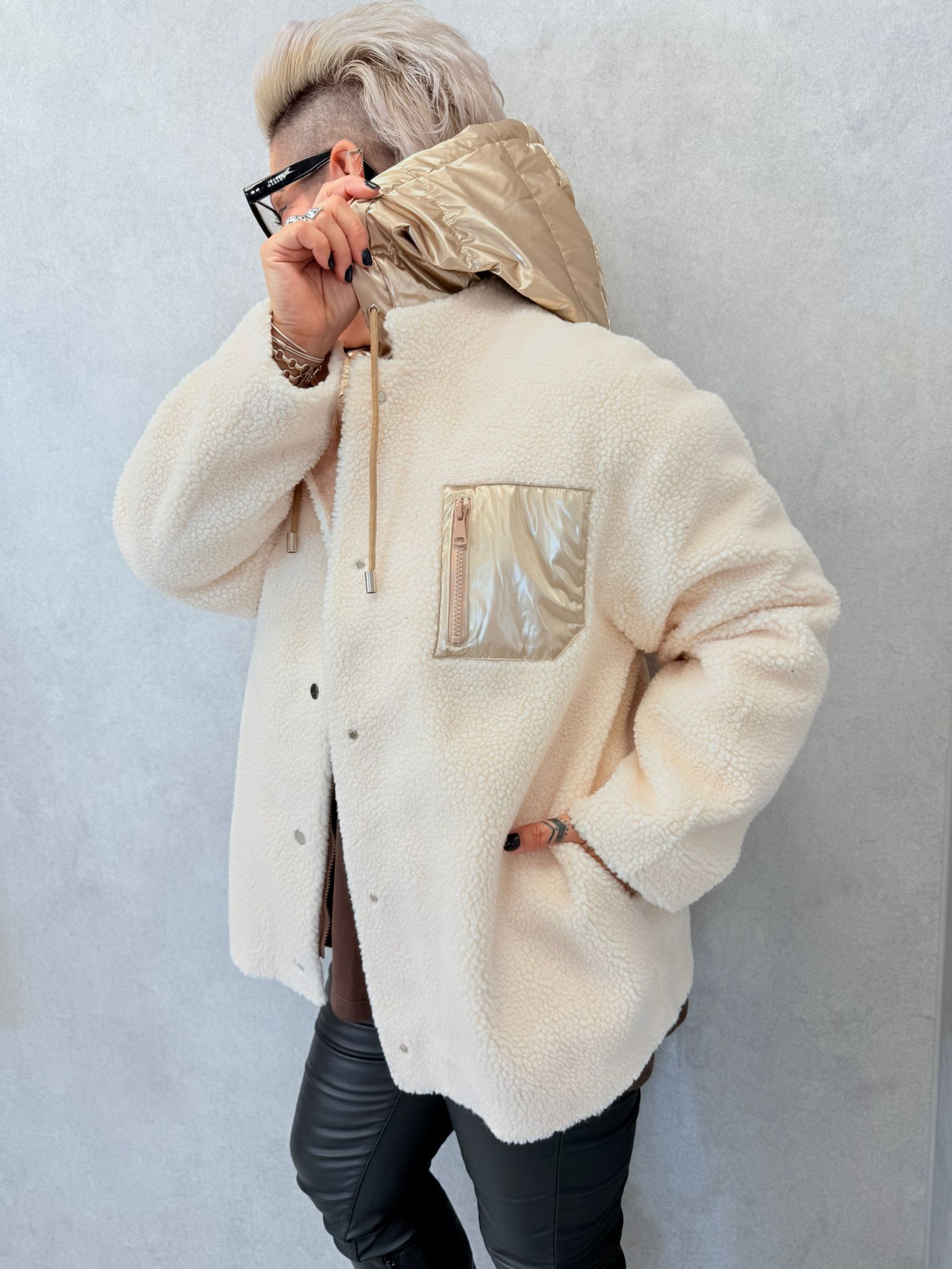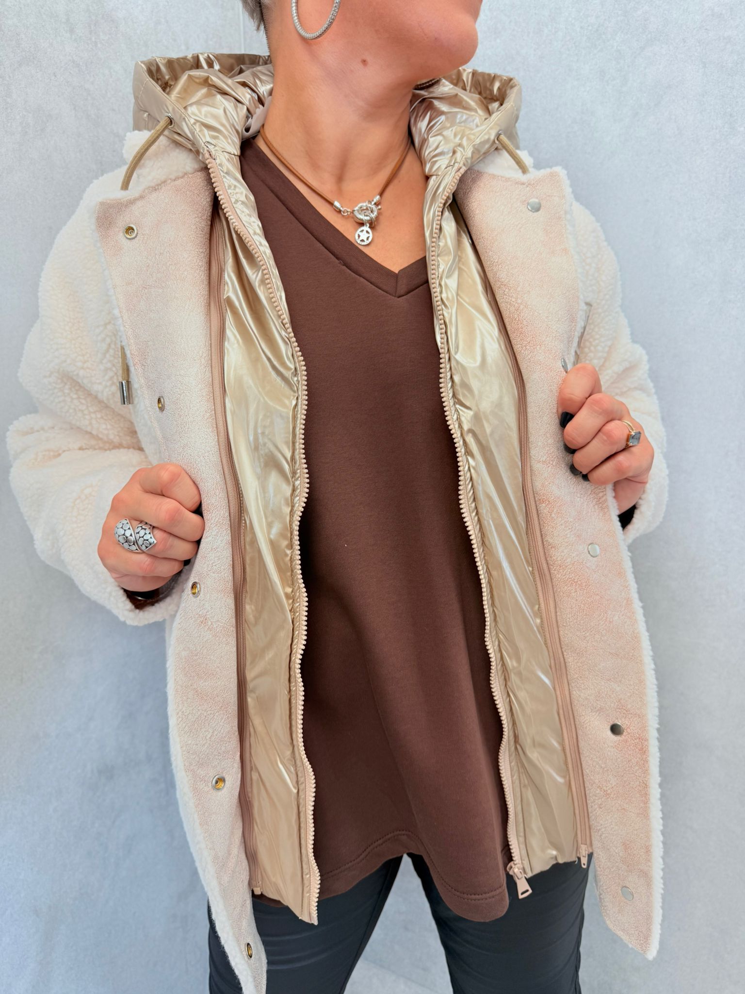Veste doudoune écru, aspect polaire, possibilité d’enlever la capuche par un zip, poches, boutons pressions