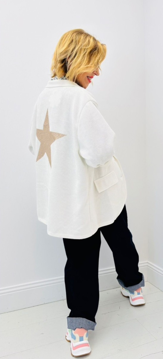 Veste en velours, sur une poche des étoiles et au dos une grosse étoile dorée, fausses poches