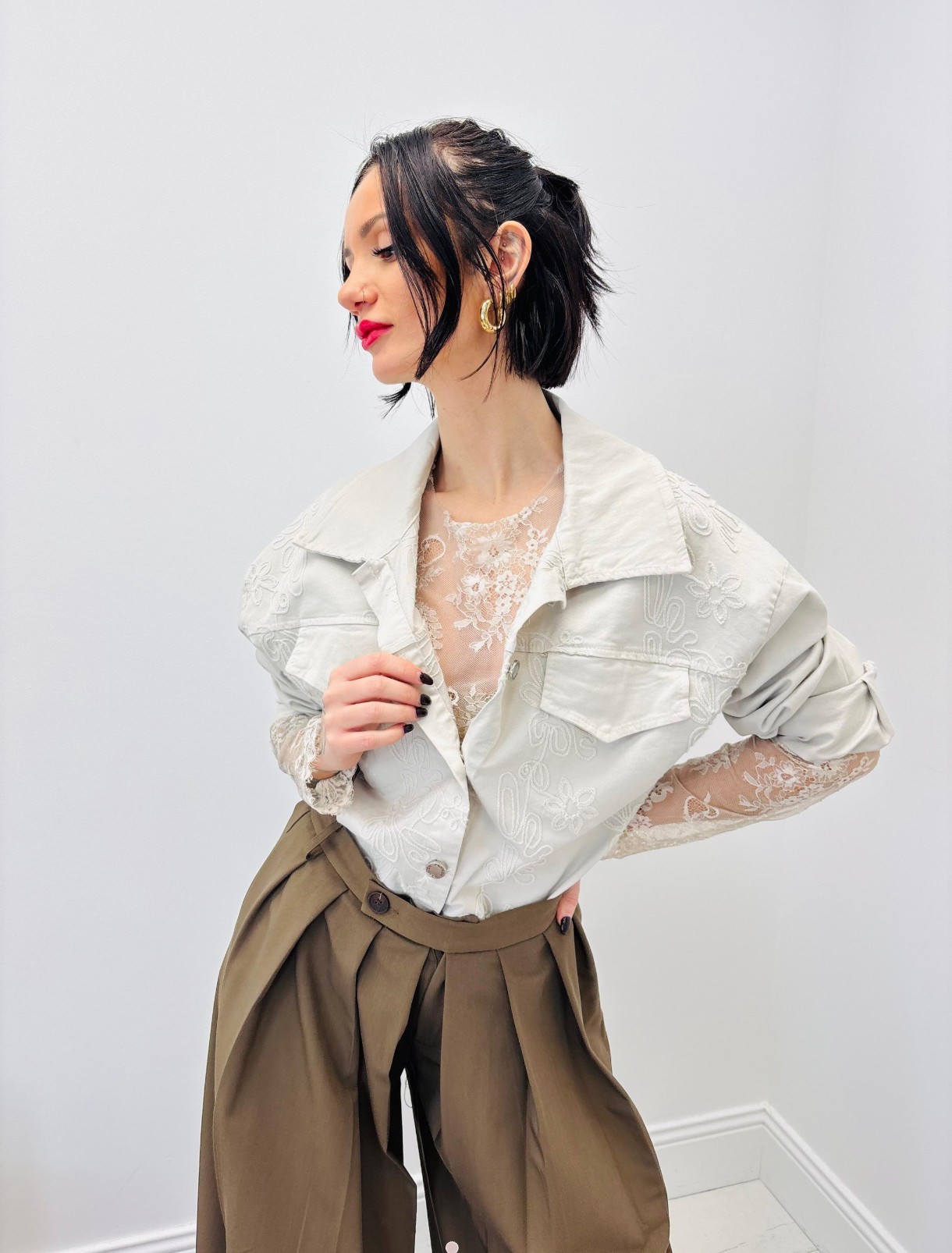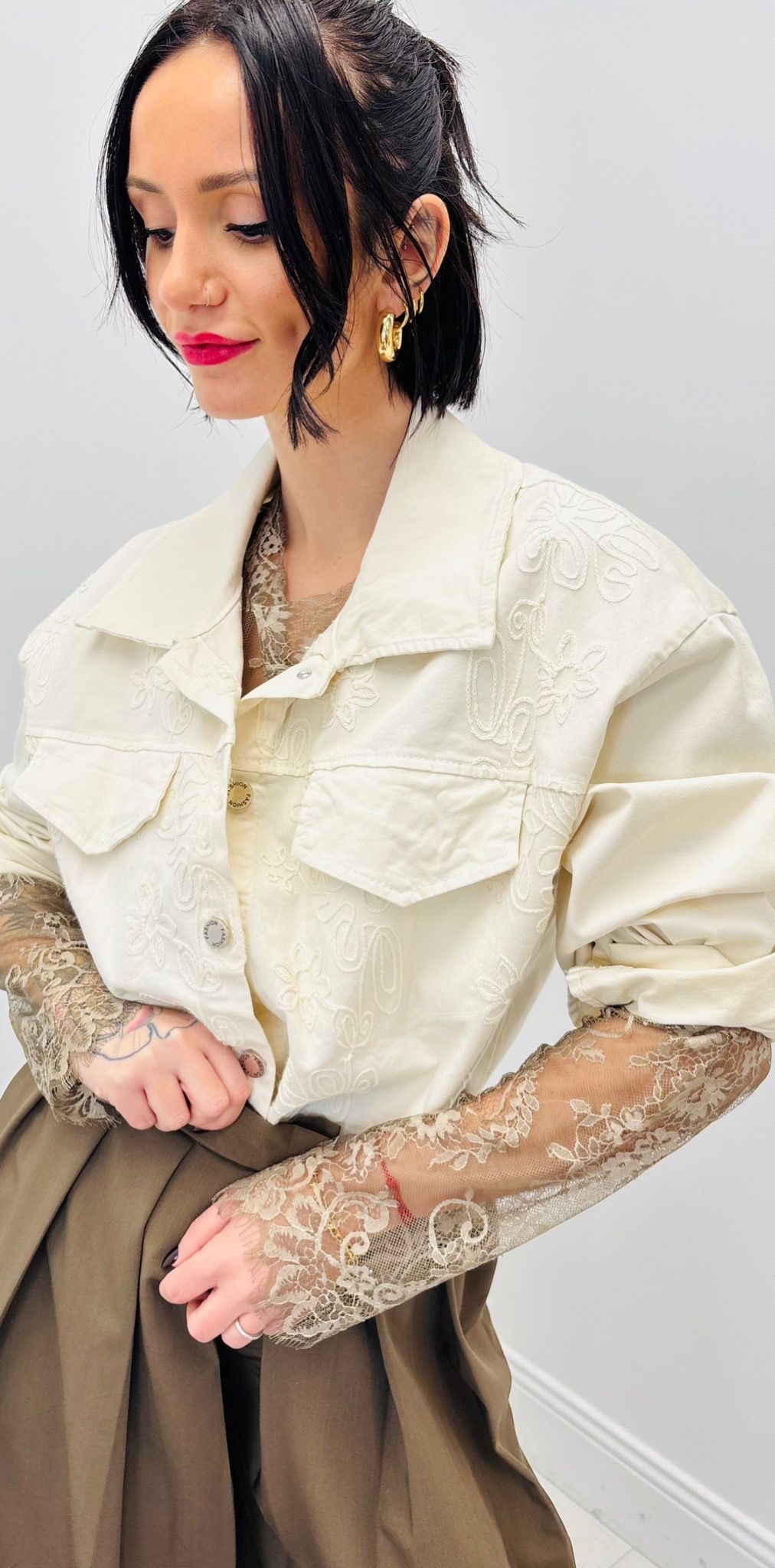 Veste courte et droite avec broderies de face, boutons, poches