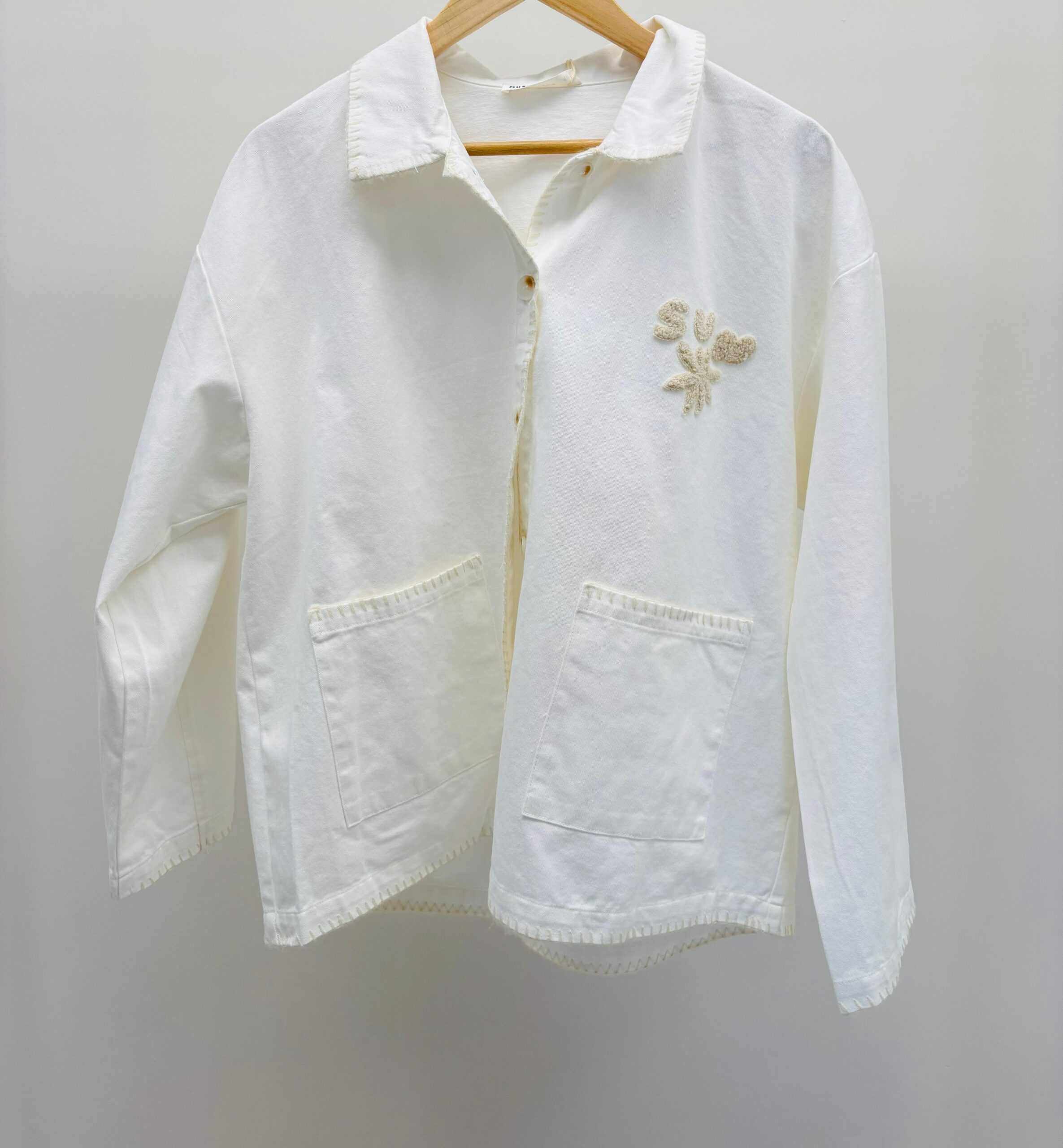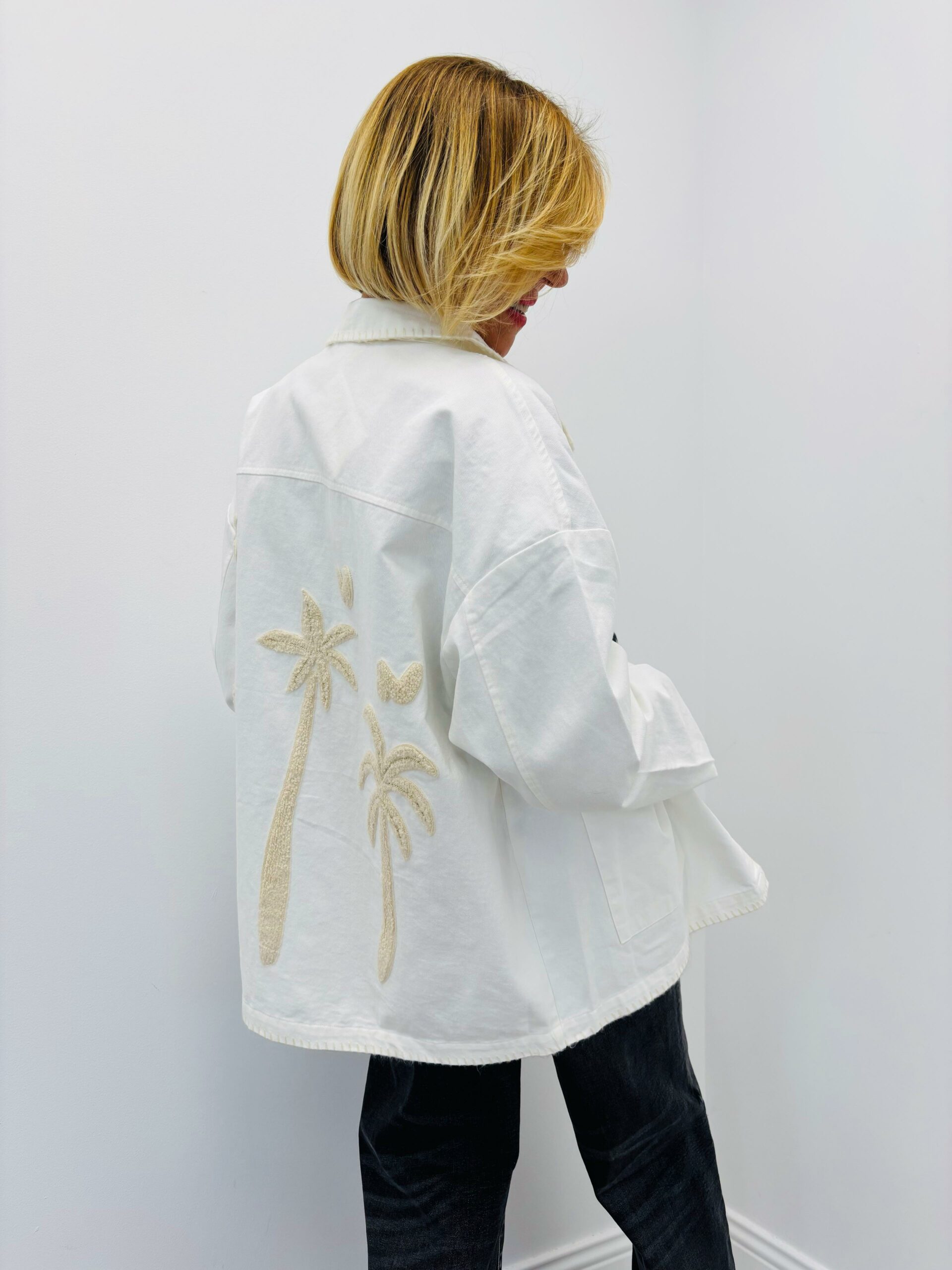 Veste écru avec motifs et inscription au dos avec palmier, coupe large, poches, boutons